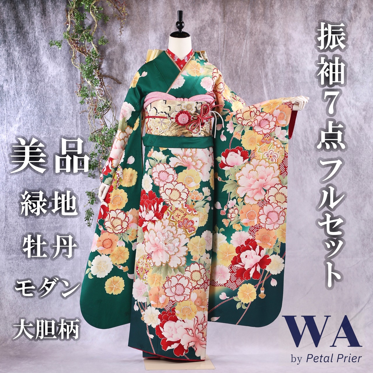 振袖フルセット 振袖セット 振袖 LLサイズ 緑×モダン 美品 成人式 着物 晴れ着 7点フルセット KF-7