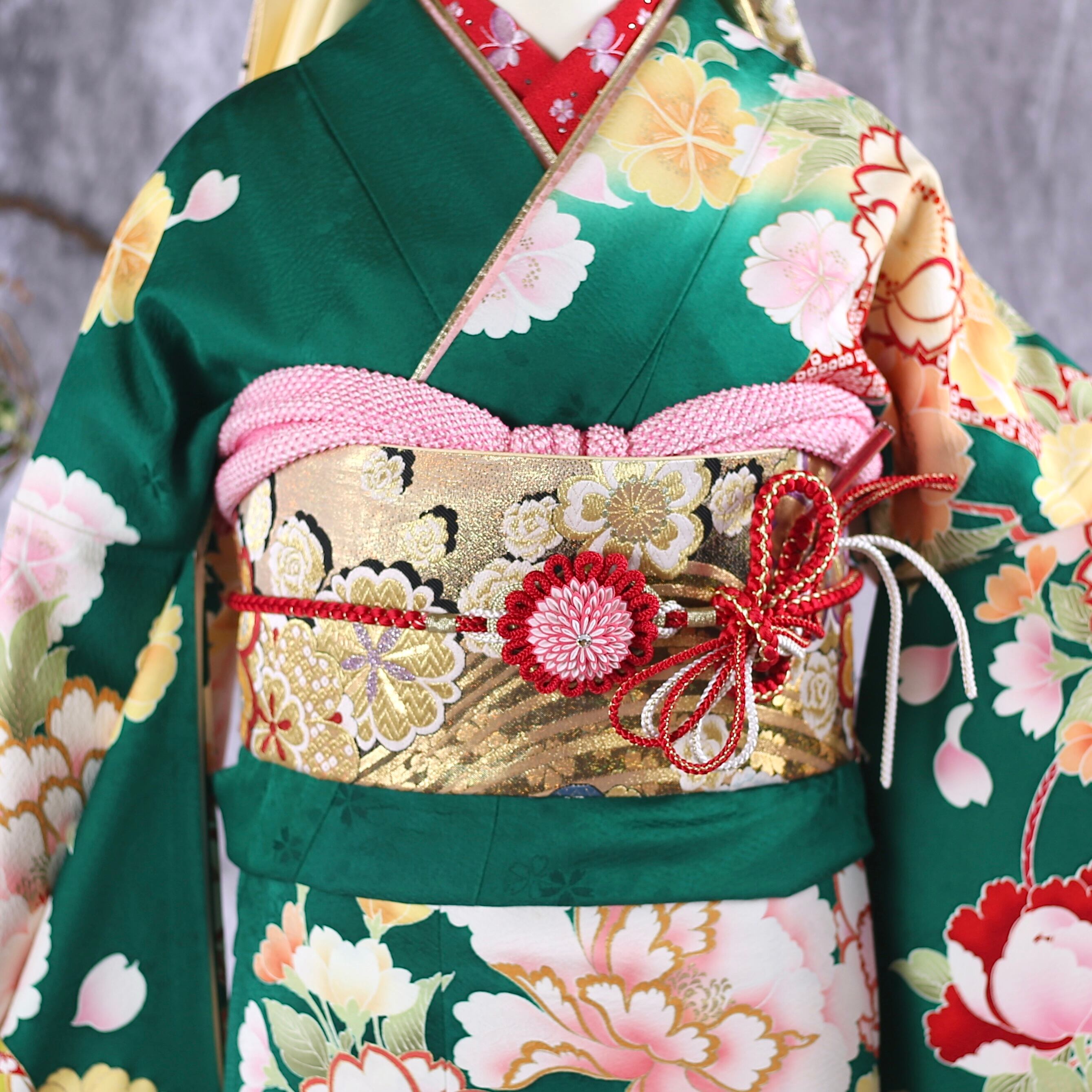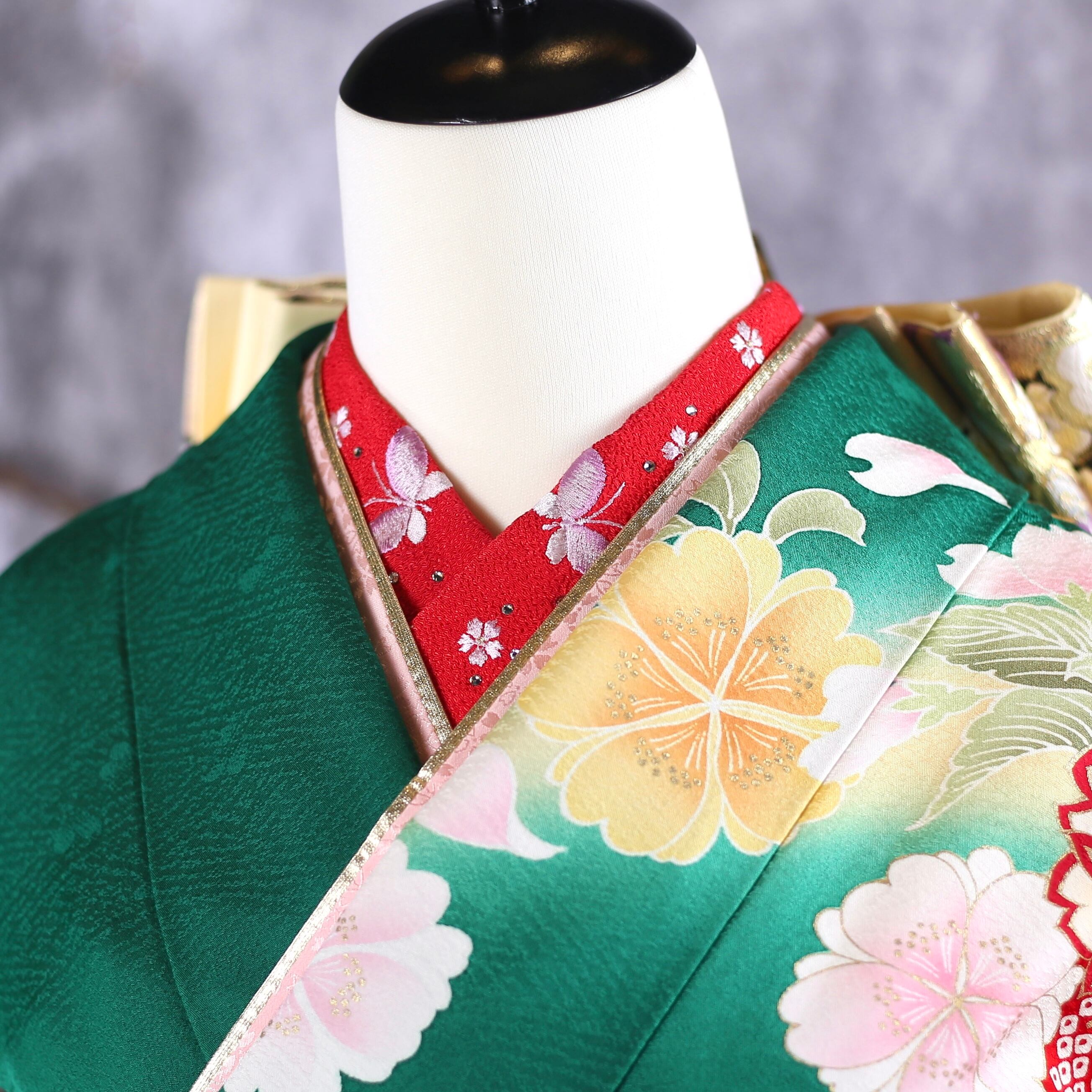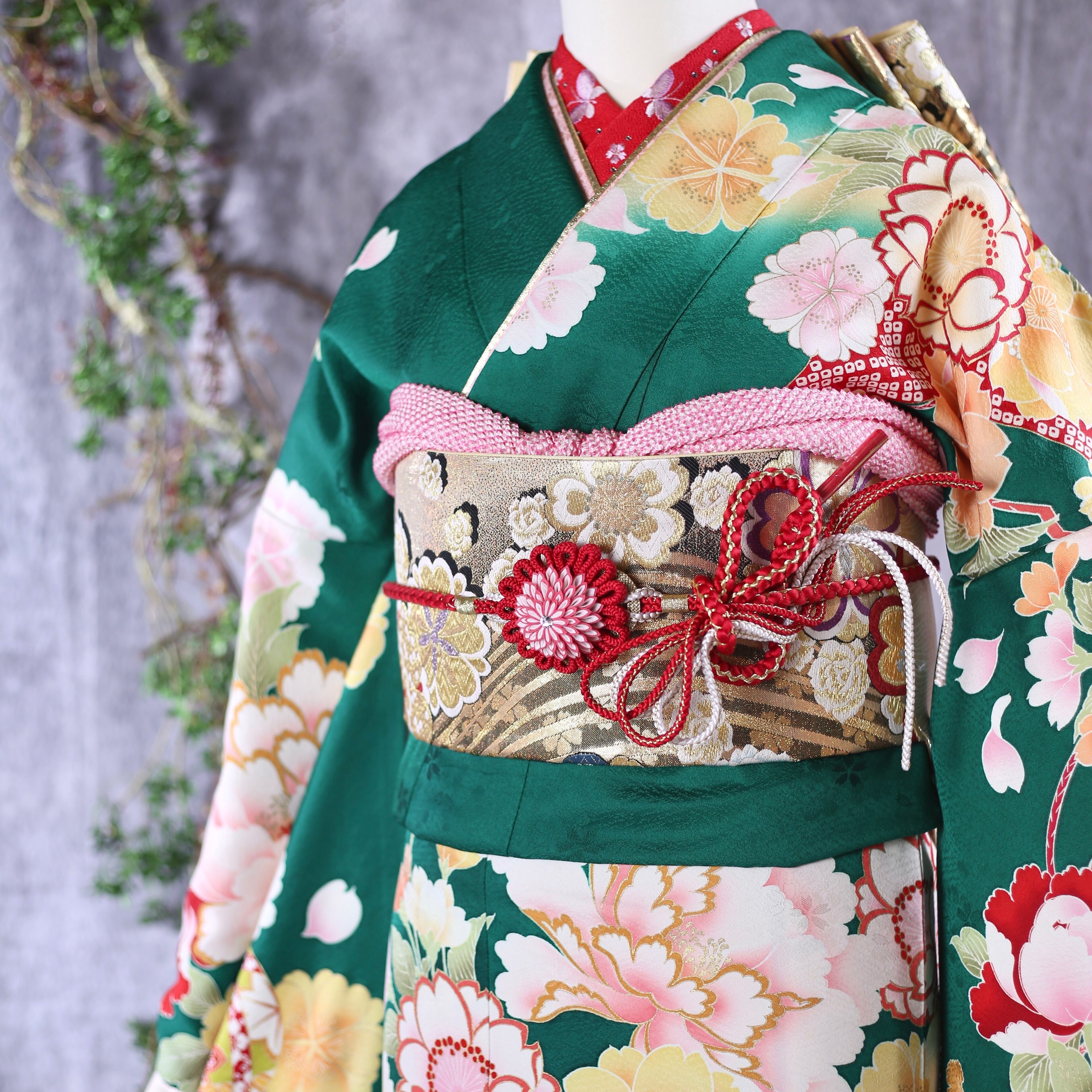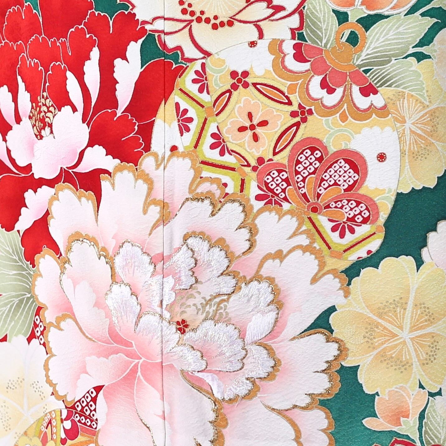 緑地に大胆な牡丹柄が印象的なモダン振袖です。