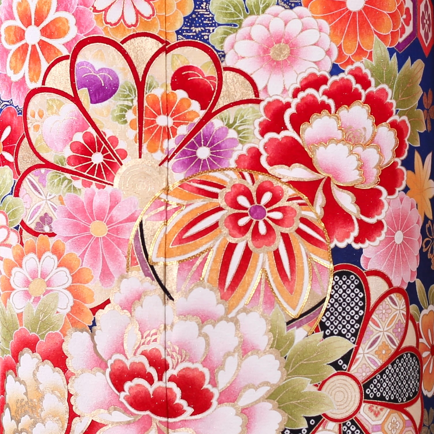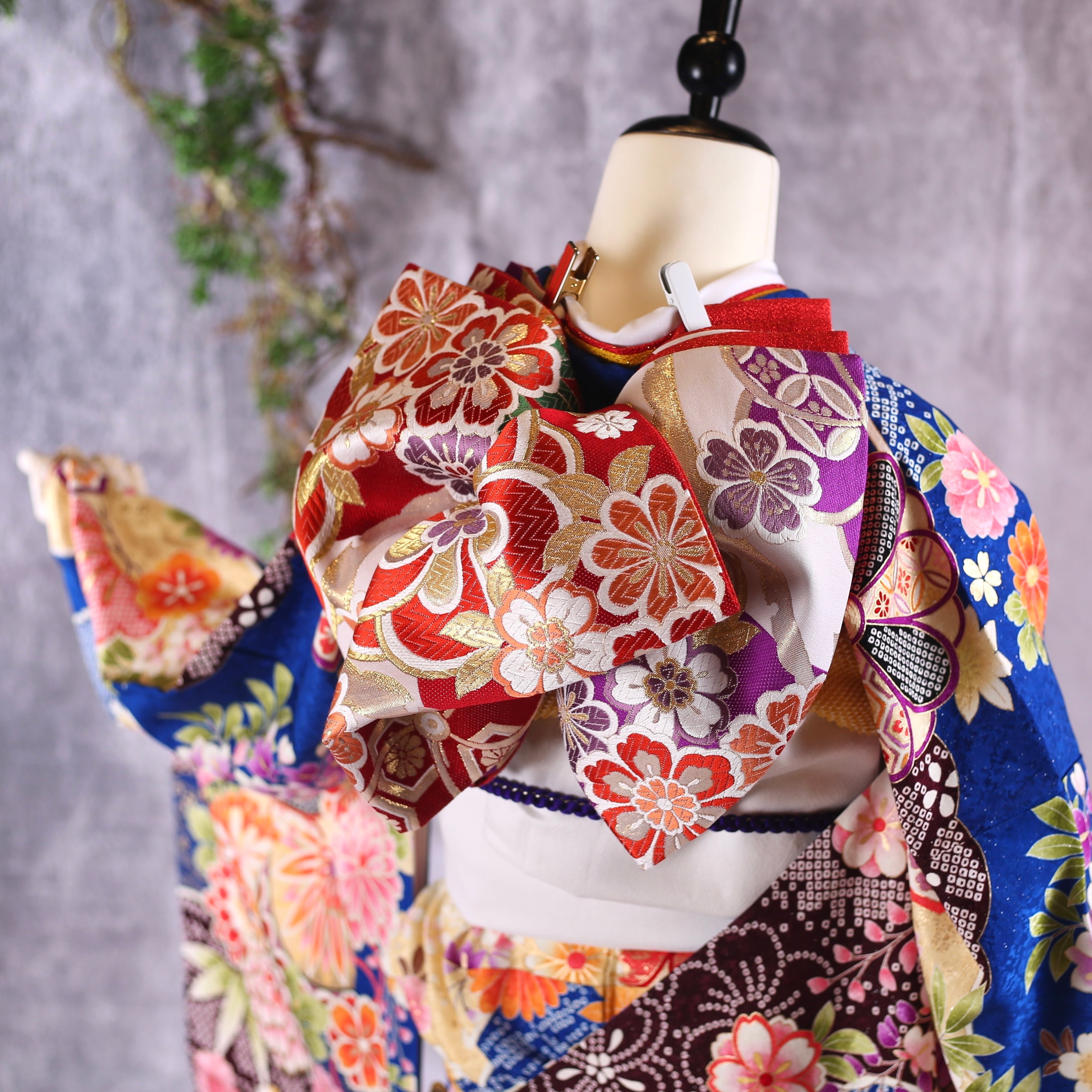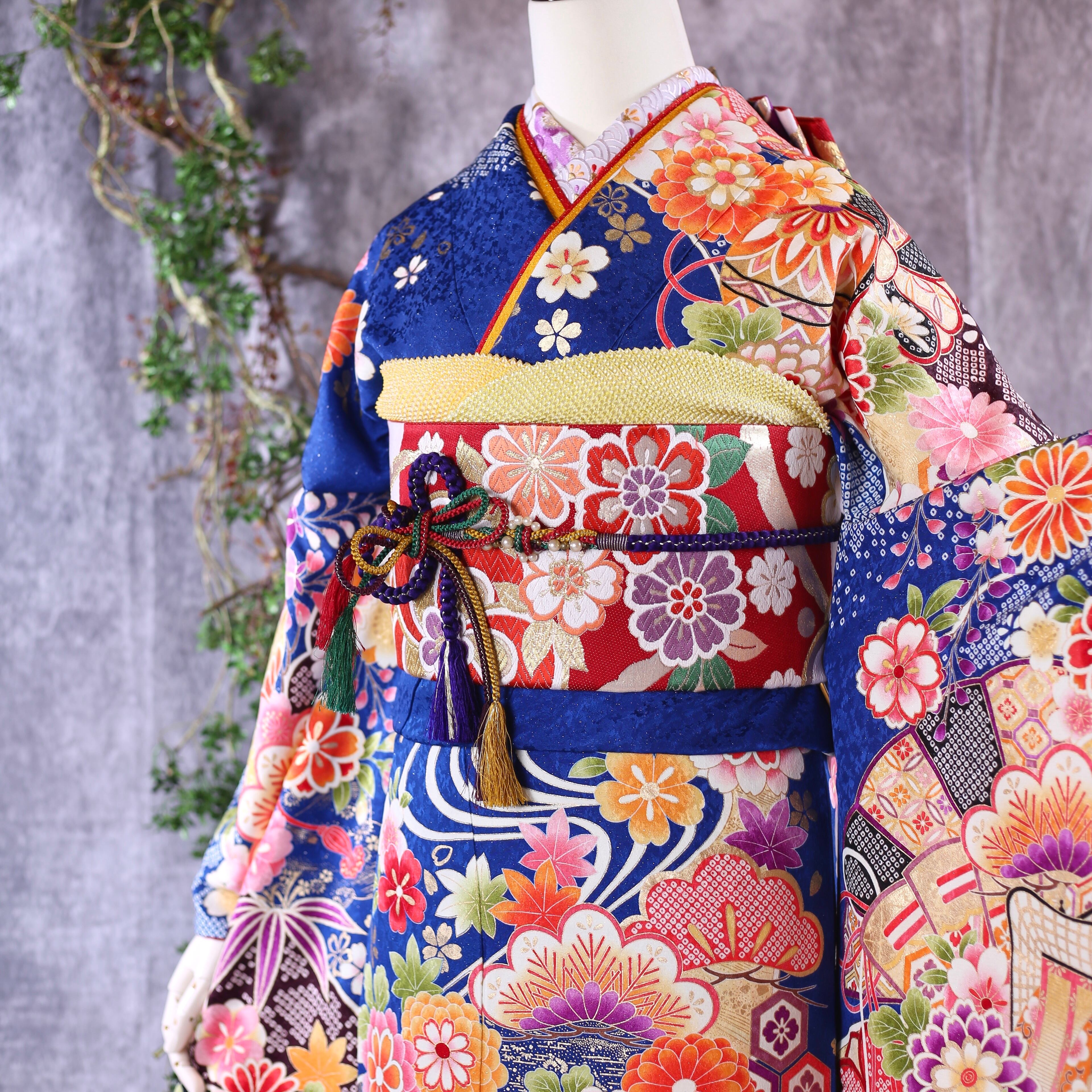 鮮やかですっきりとした青地に色とりどりの柄が映えるレトロ調の古典振袖です。全体的に敷き詰められた柄が華やかさを演出してくれます。