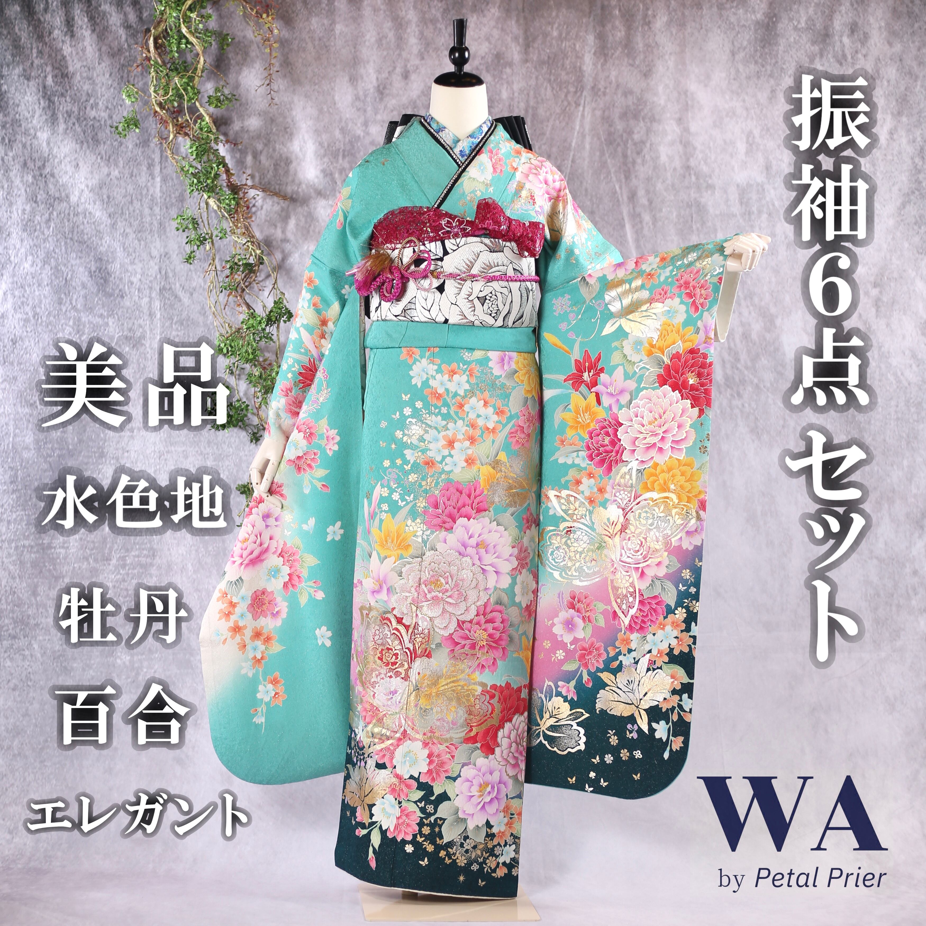 振袖フルセット 振袖セット 振袖 Lサイズ 水色×エレガント 美品 成人式 着物 晴れ着 6点セット FN-224