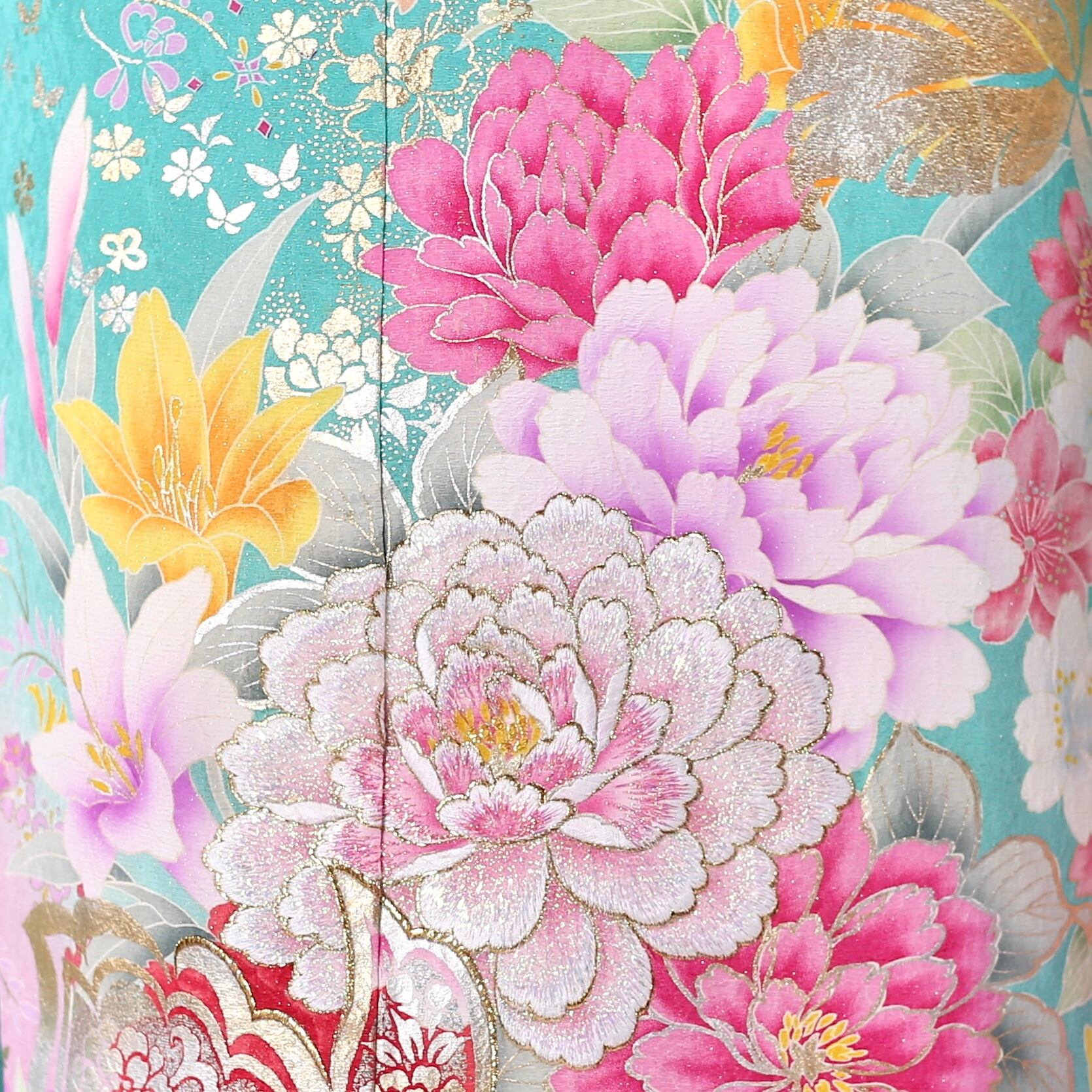 水色地に牡丹や百合が映えるエレガントな振袖です。