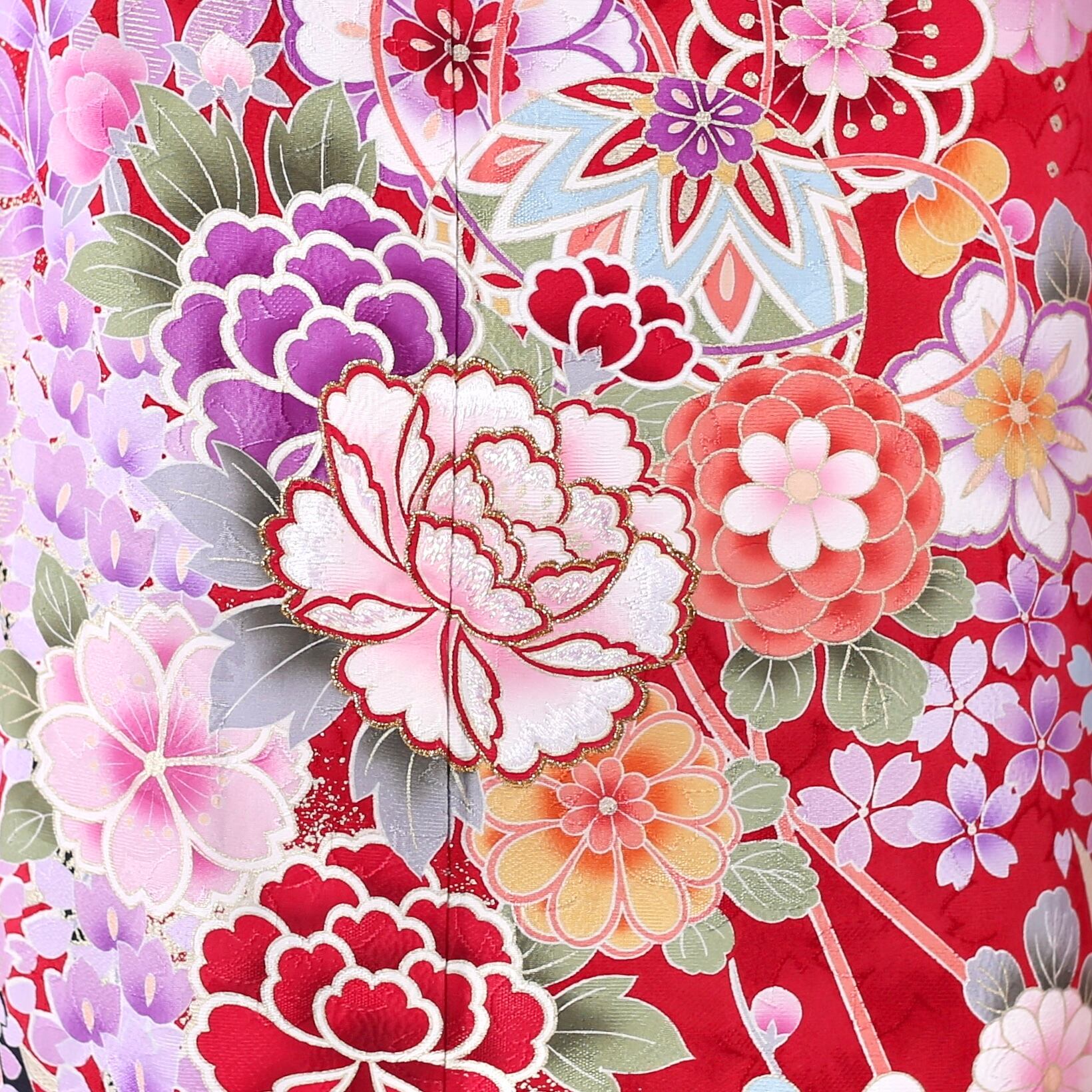 赤地に藤の花と鞠柄が印象的な古典振袖です。