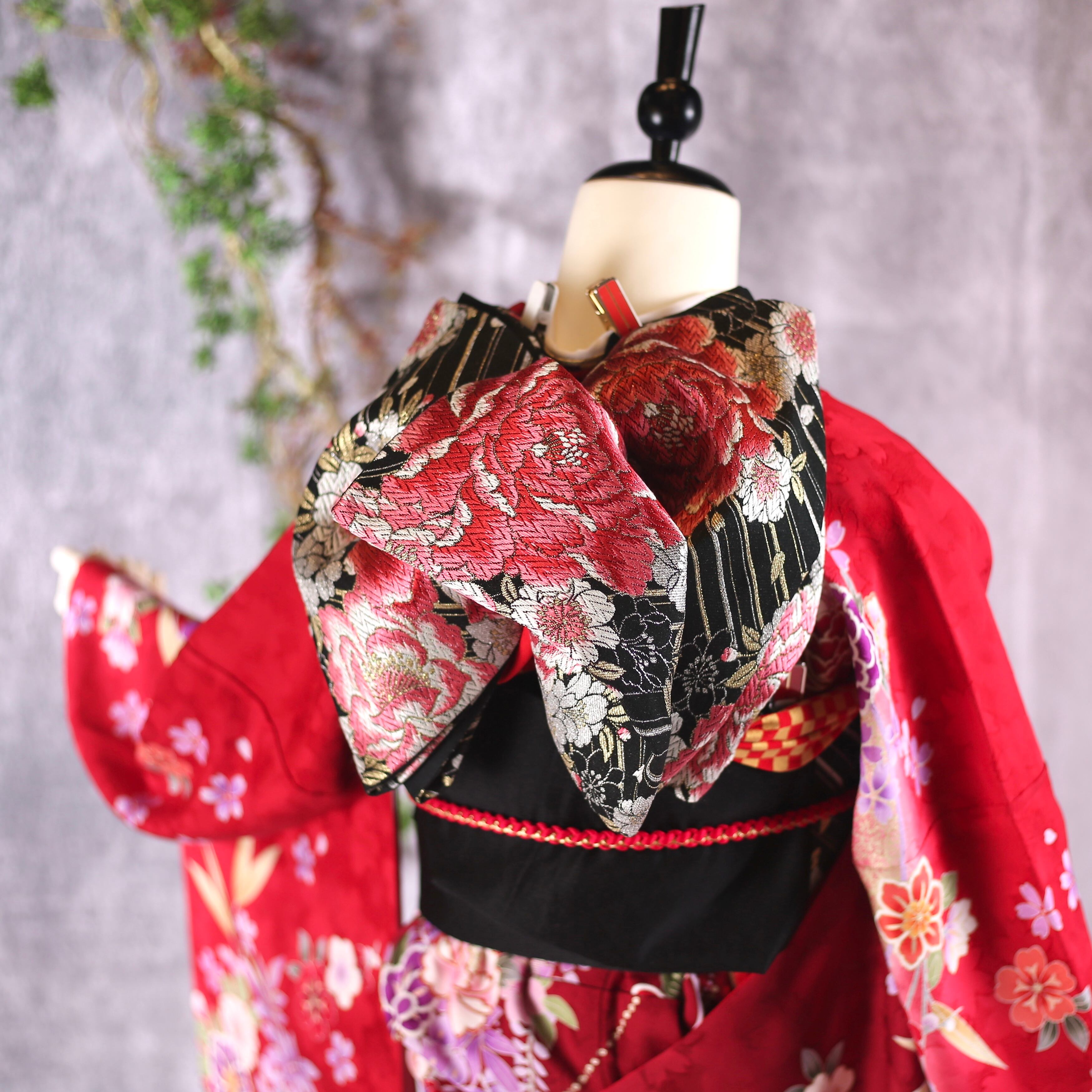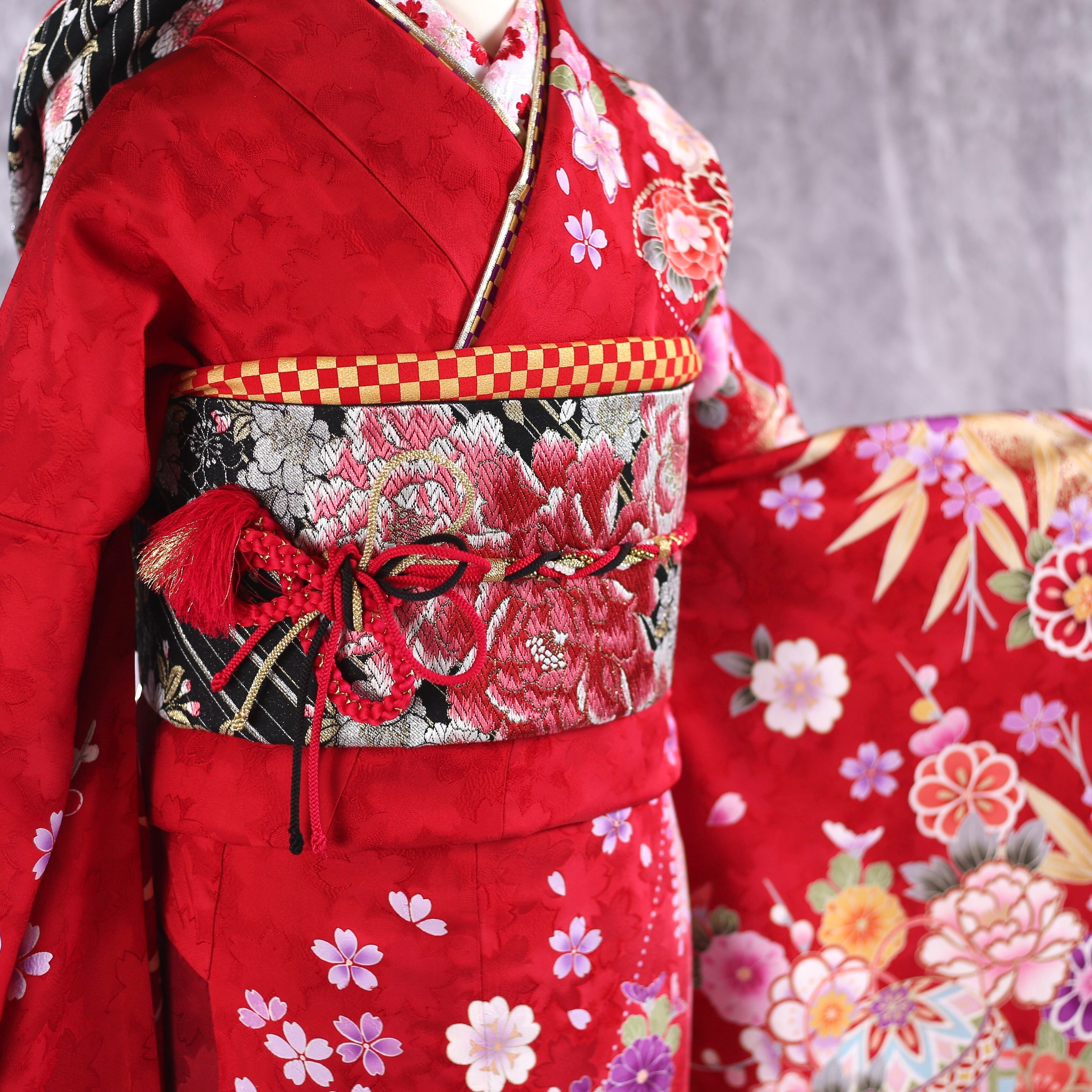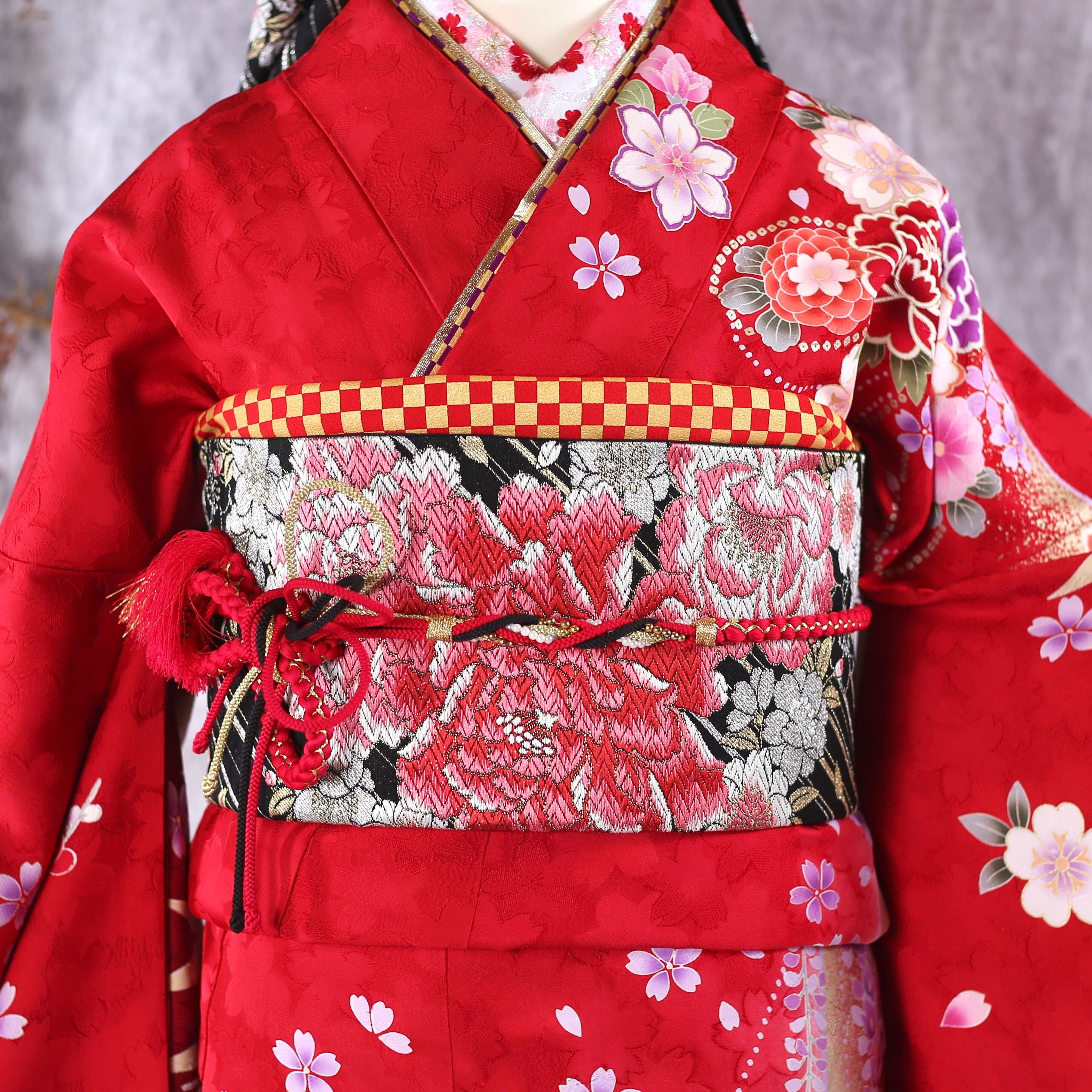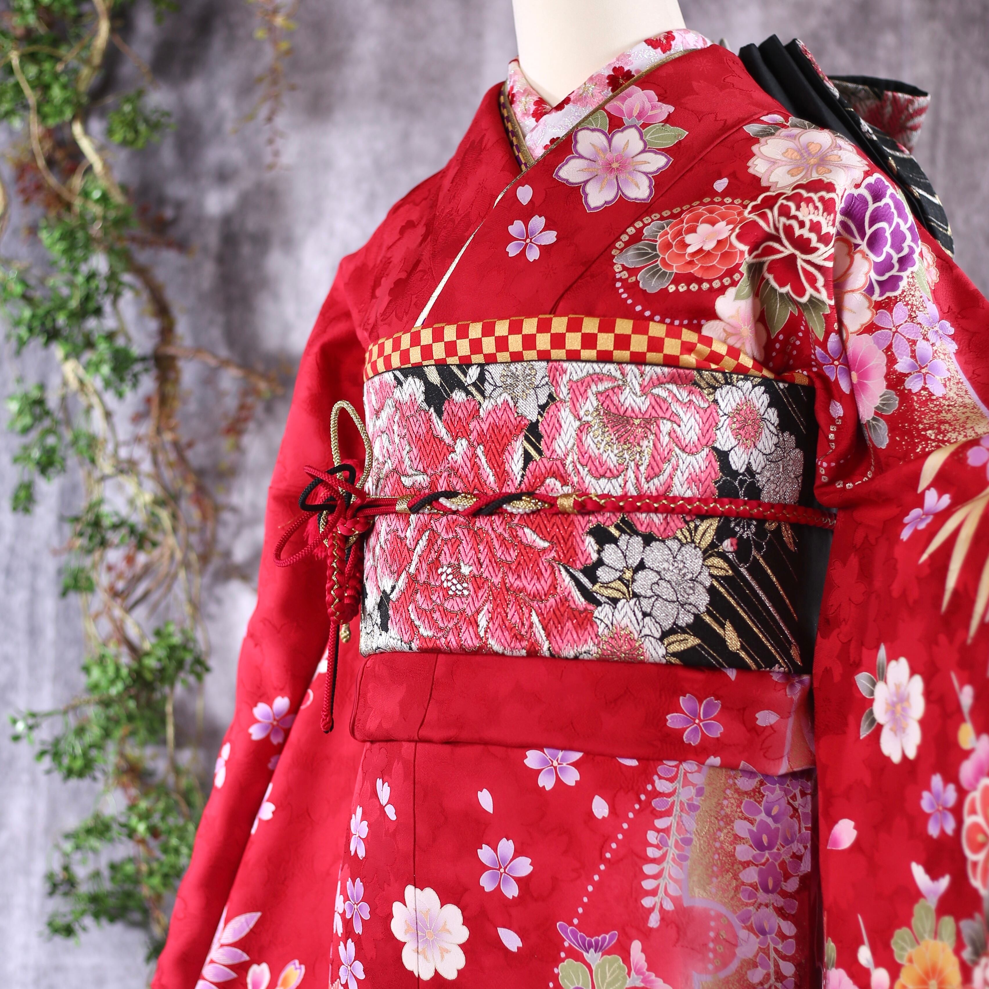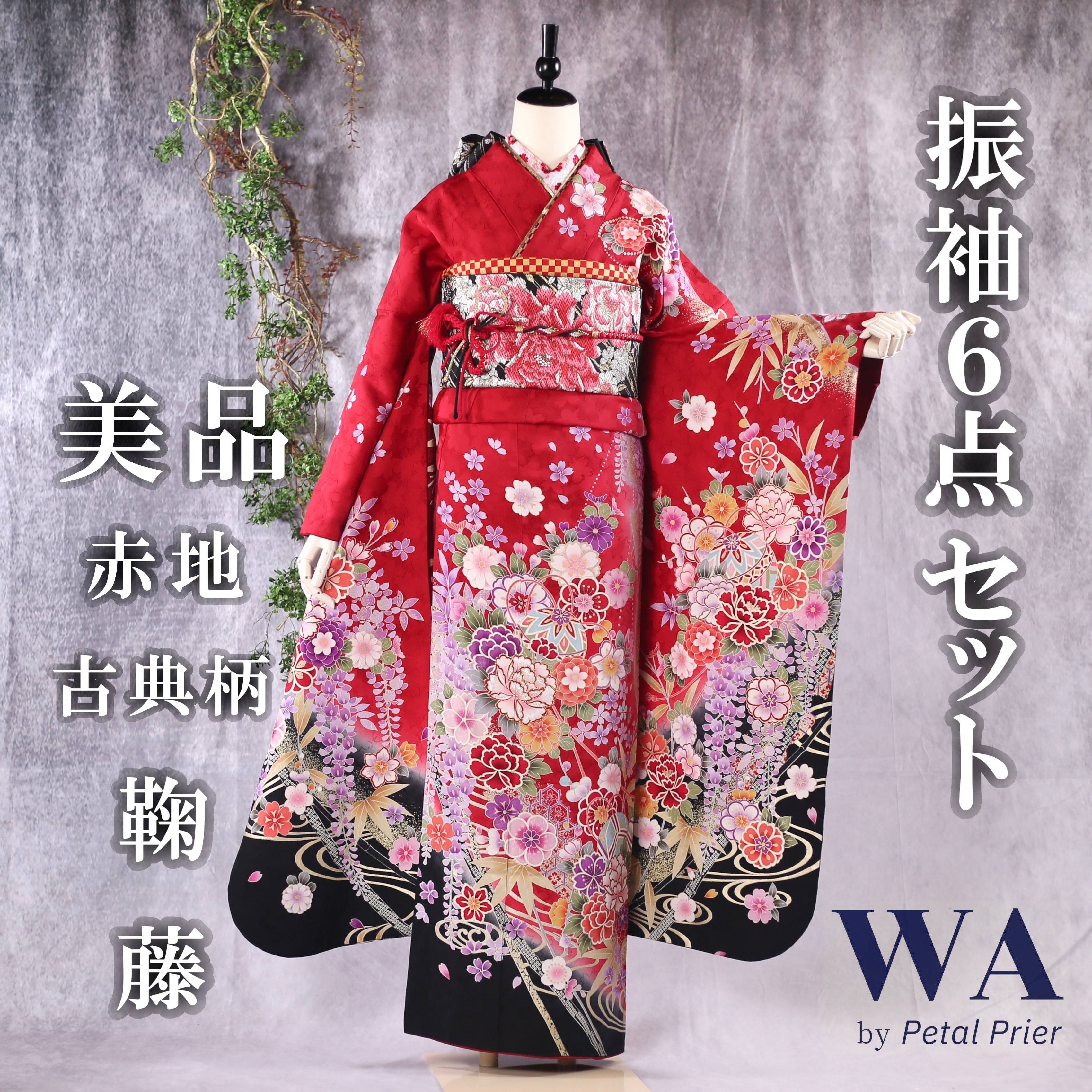 振袖フルセット 振袖セット 振袖 L〜LLサイズ 赤×古典 美品 成人式 着物 晴れ着 6点セット KFN-23