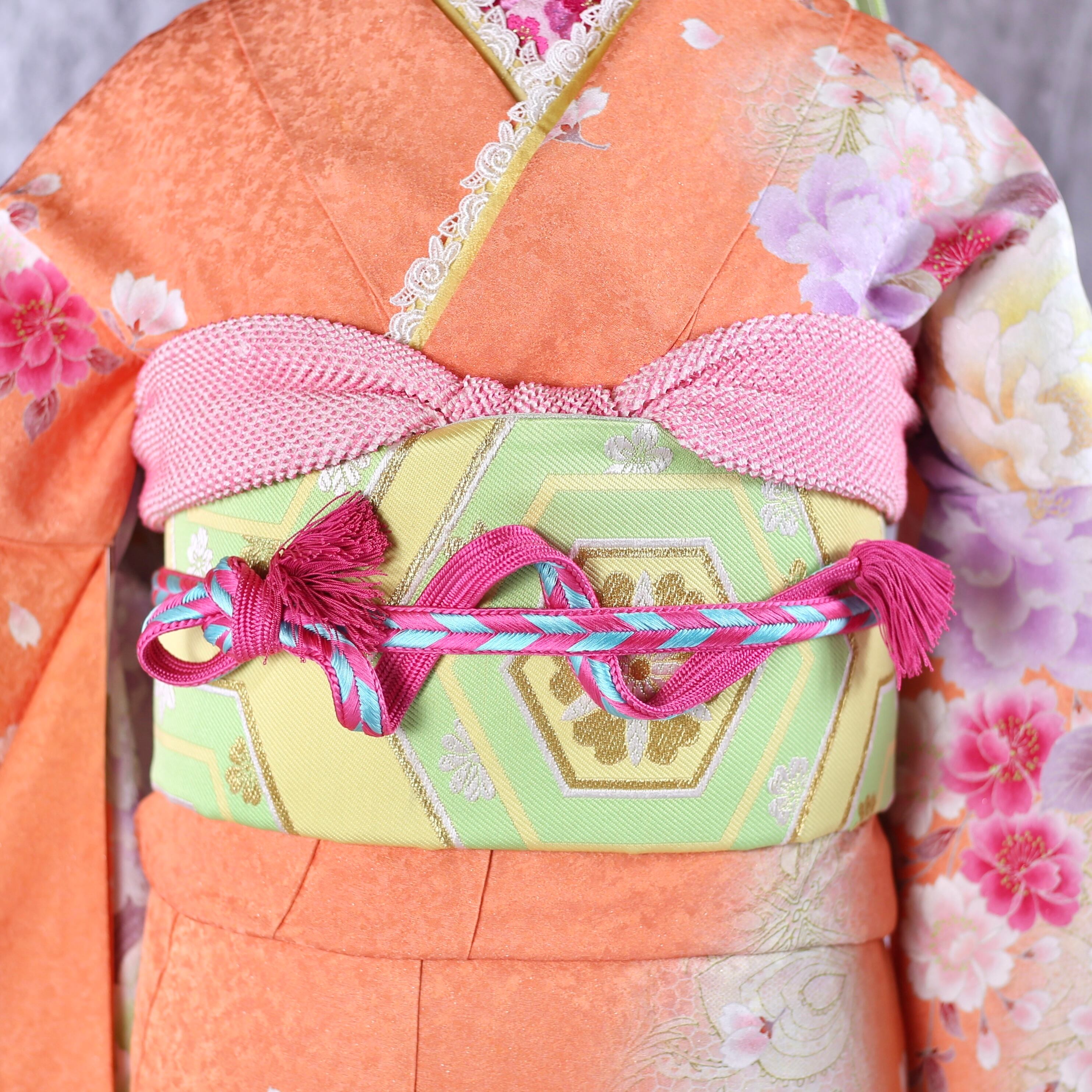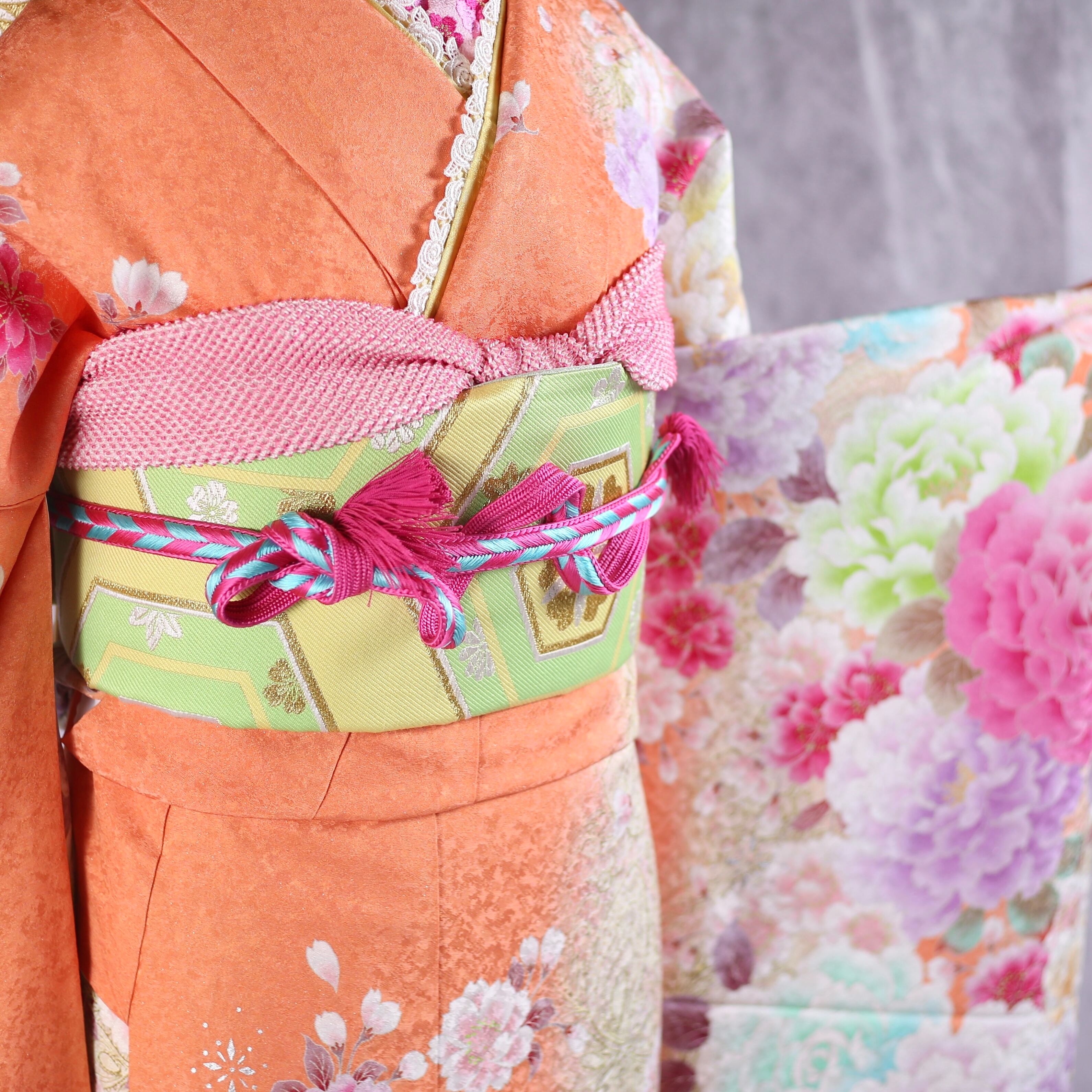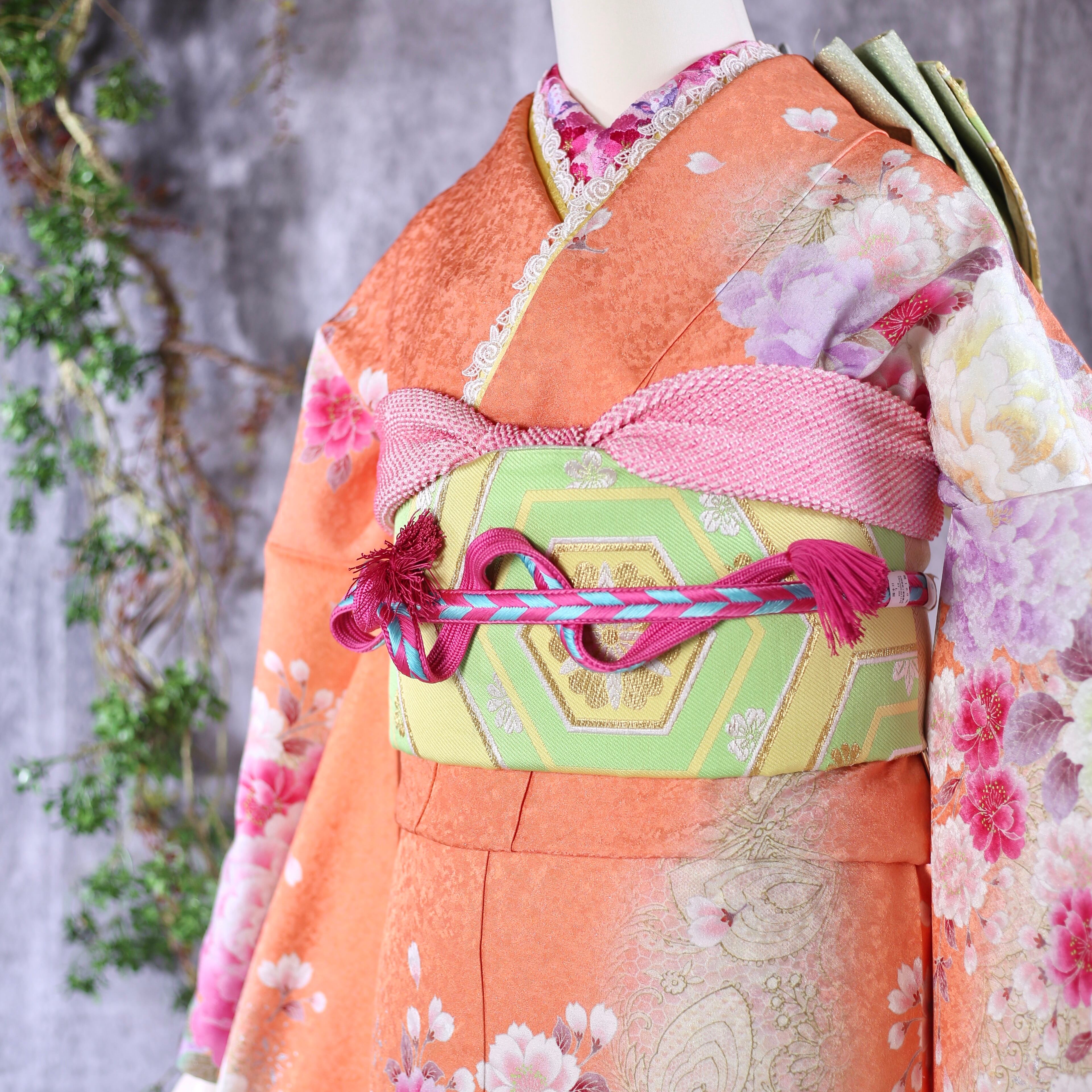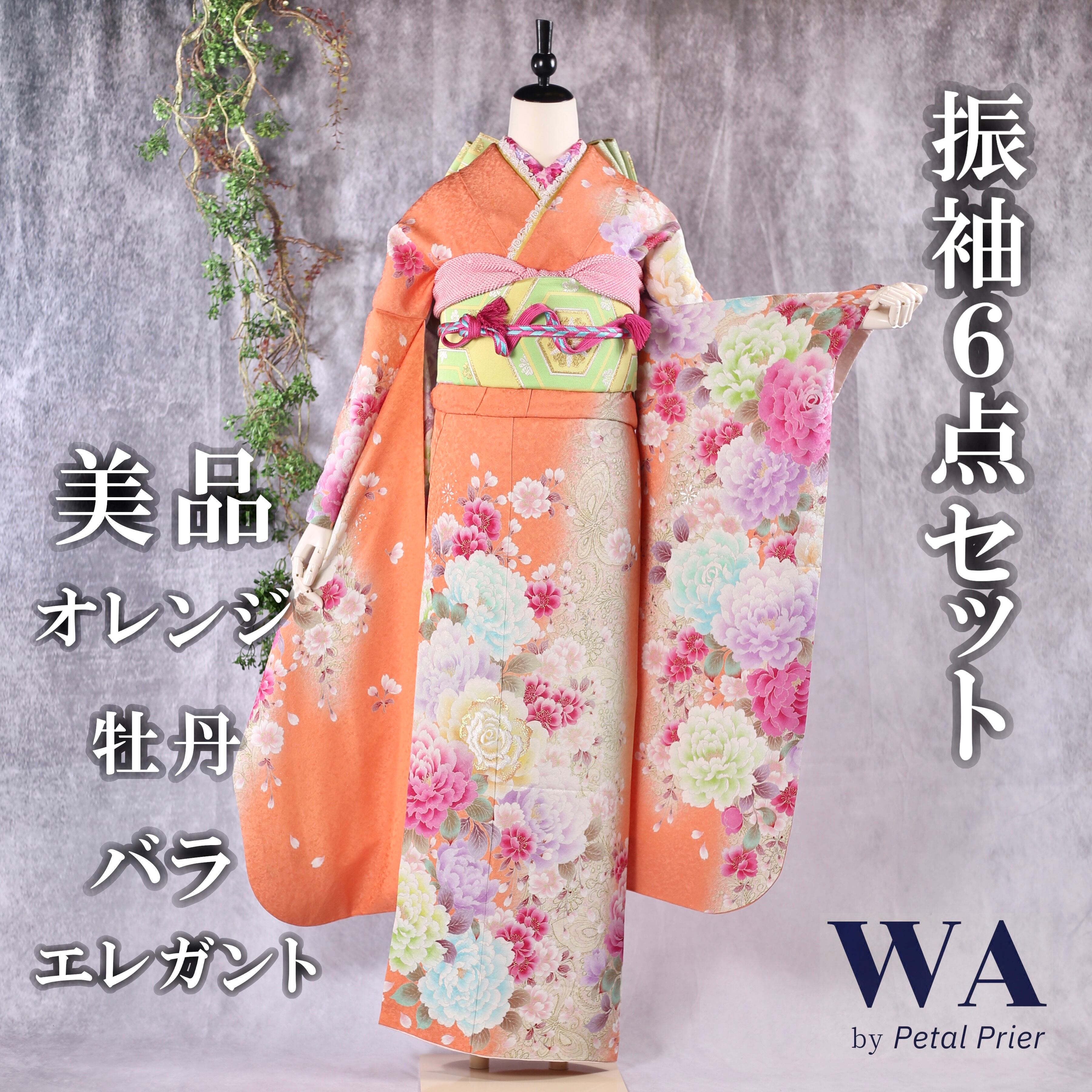 振袖フルセット 振袖セット 振袖 Mサイズ オレンジ×エレガント 美品 成人式 着物 晴れ着 6点セット KFN-54