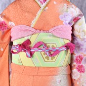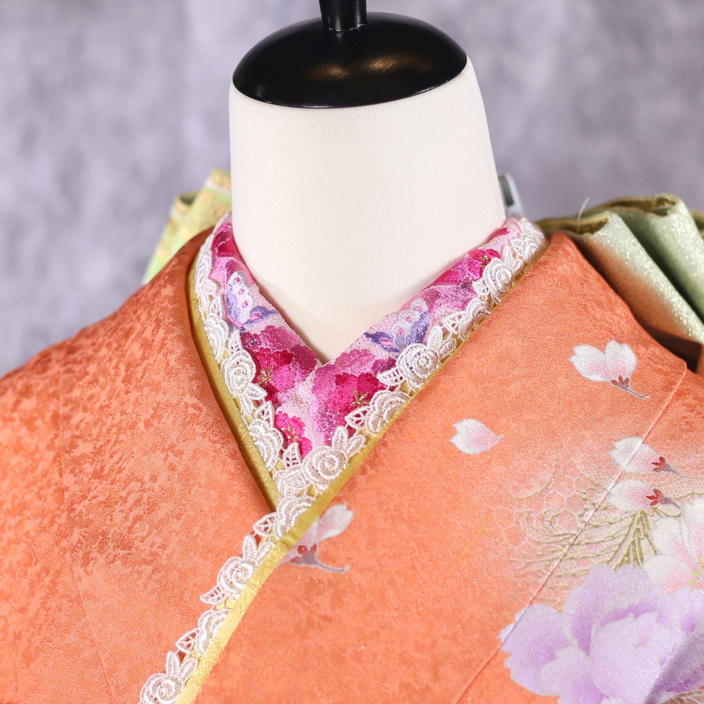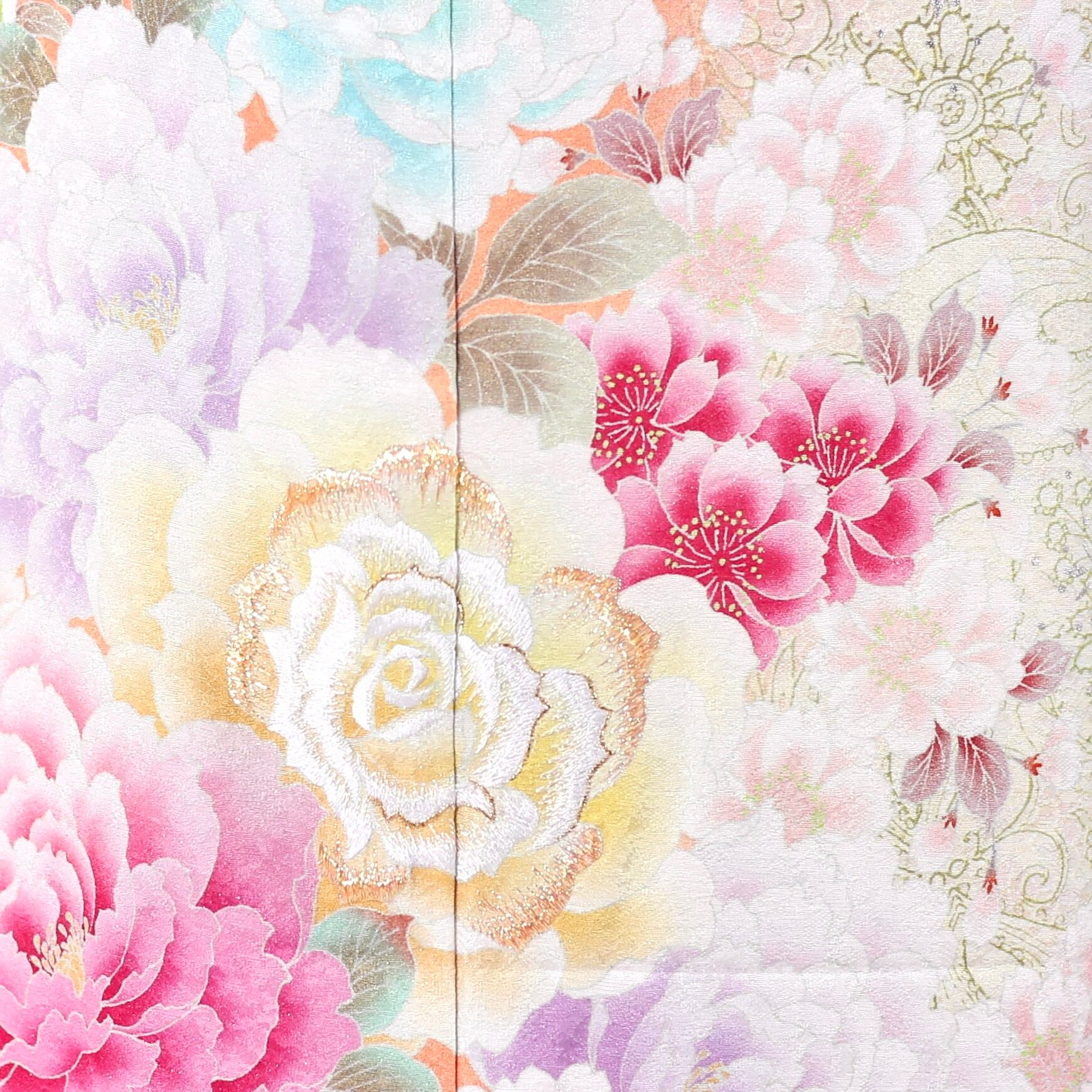 淡いオレンジ地に牡丹と薔薇柄が映える美しい振袖です。