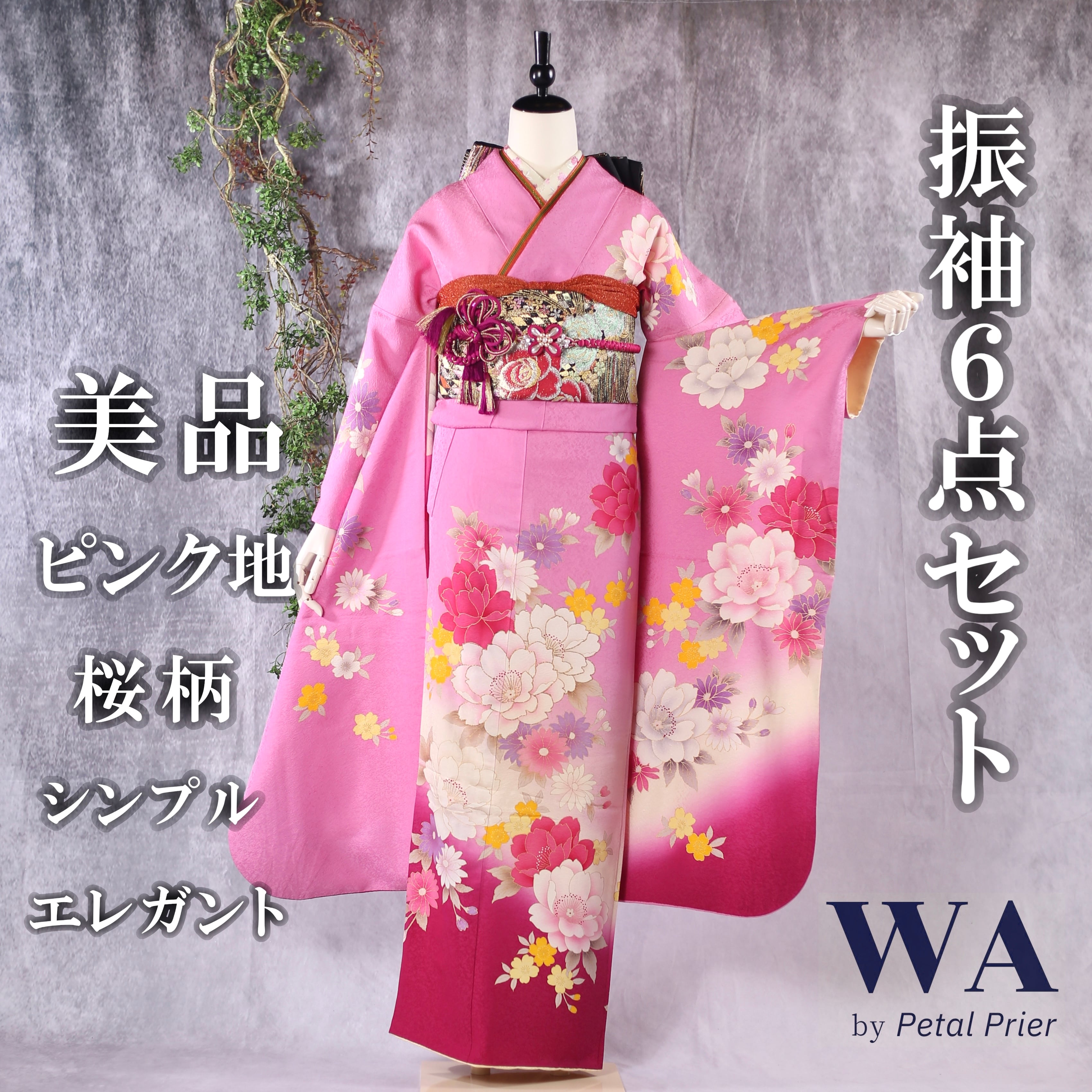 振袖フルセット 振袖セット 振袖 Sサイズ ピンク×桜 美品 成人式 着物 晴れ着 6点セット KFN-57