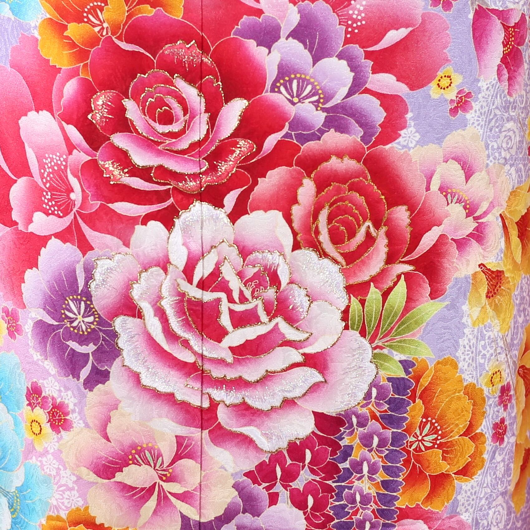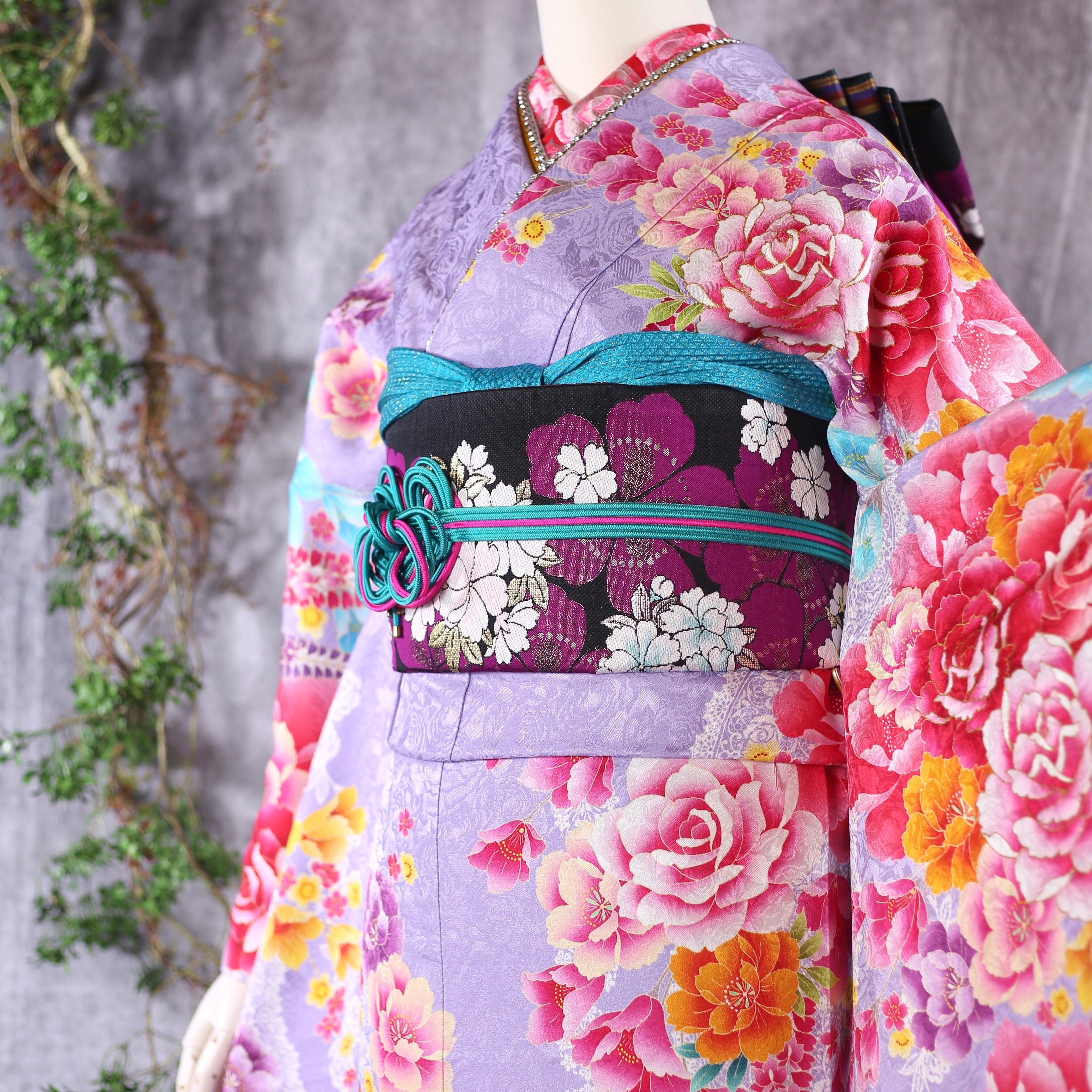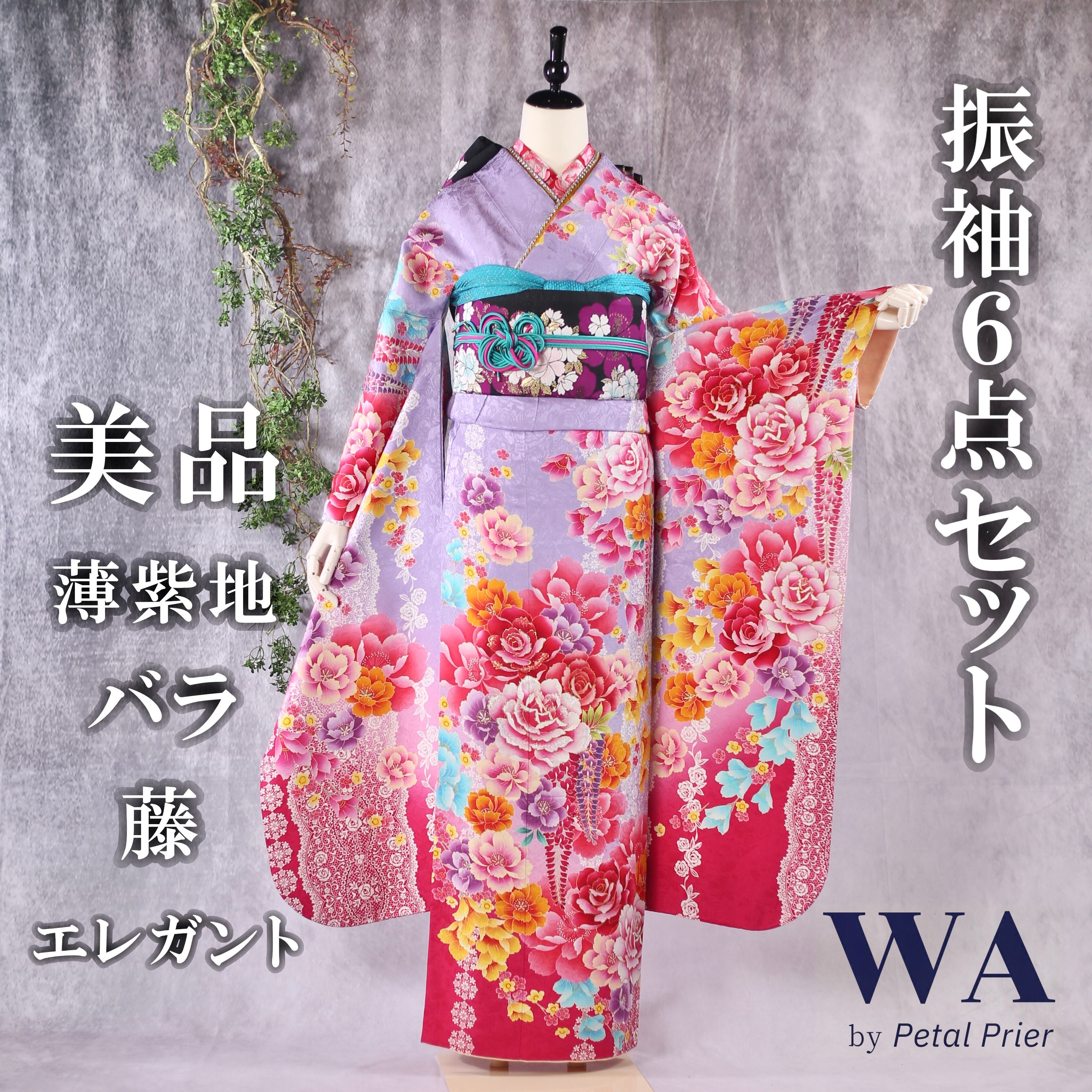 振袖フルセット 振袖セット 振袖 Lサイズ 薄紫×バラ 美品 成人式 着物 晴れ着 6点セット KFN-60
