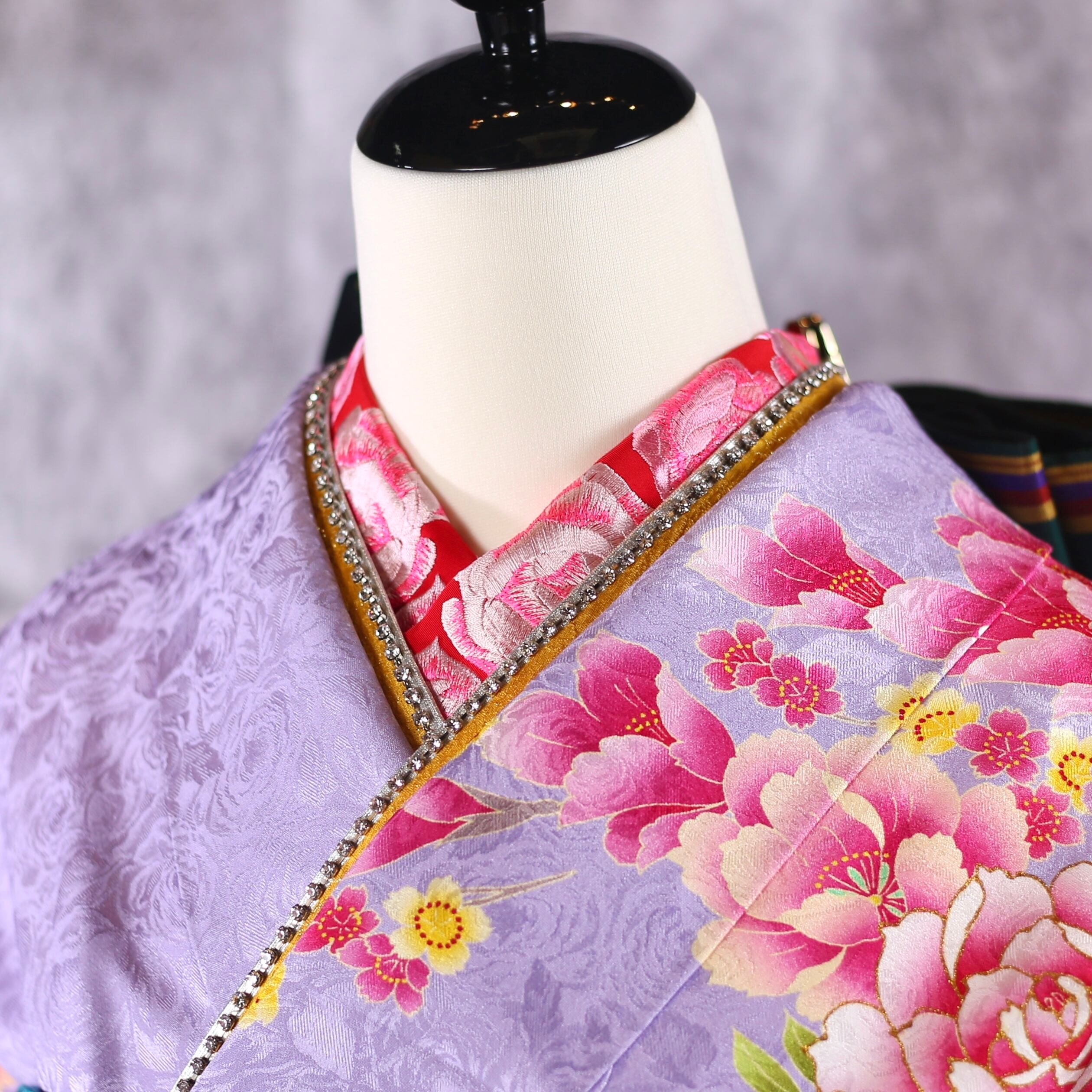 優しい薄紫地に薔薇柄が印象的な振袖です。