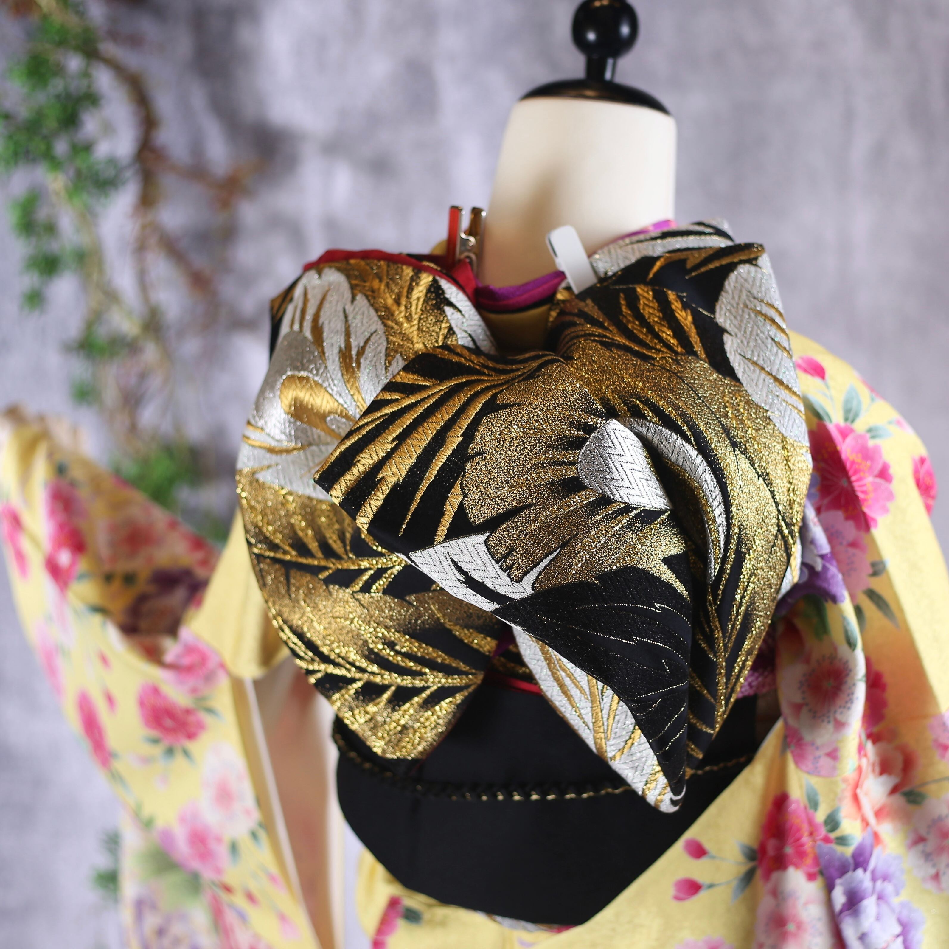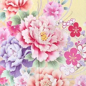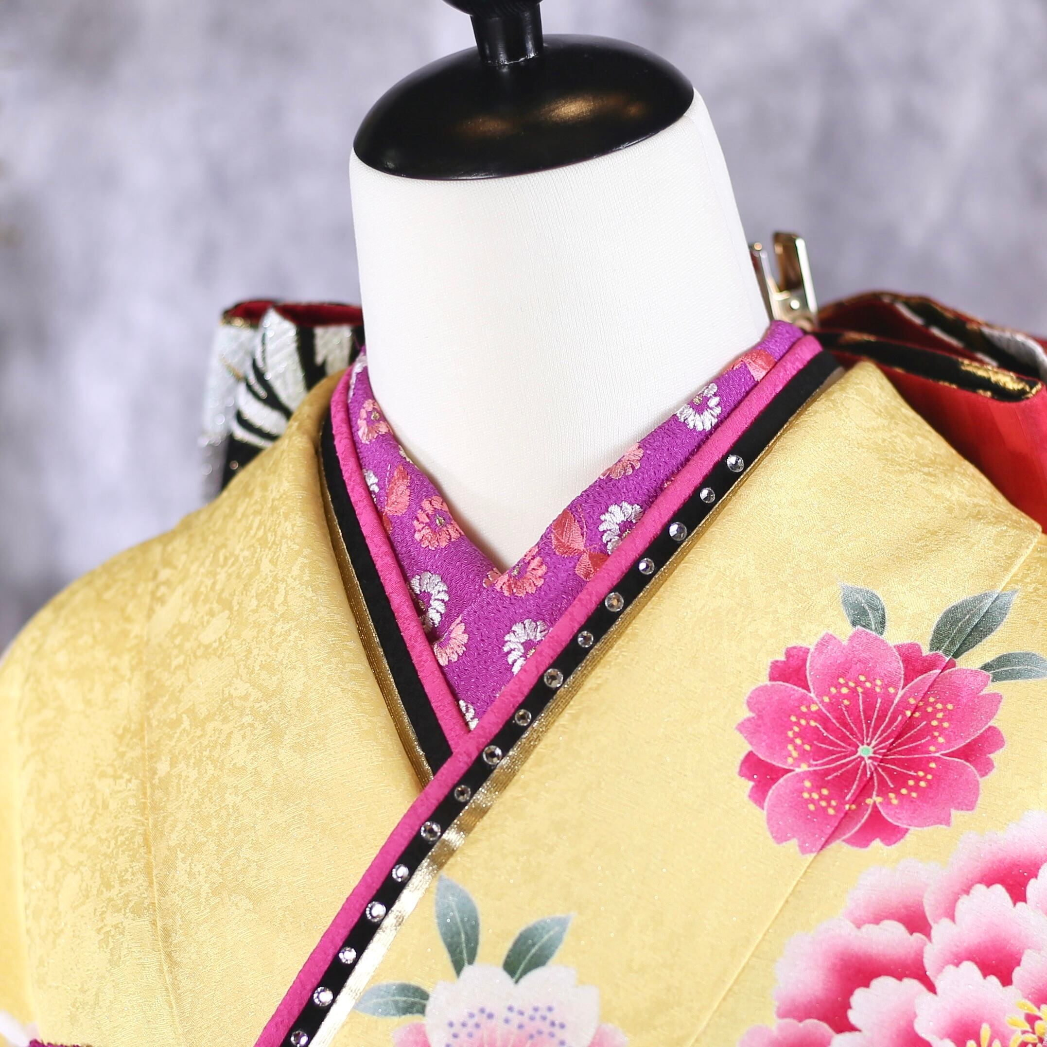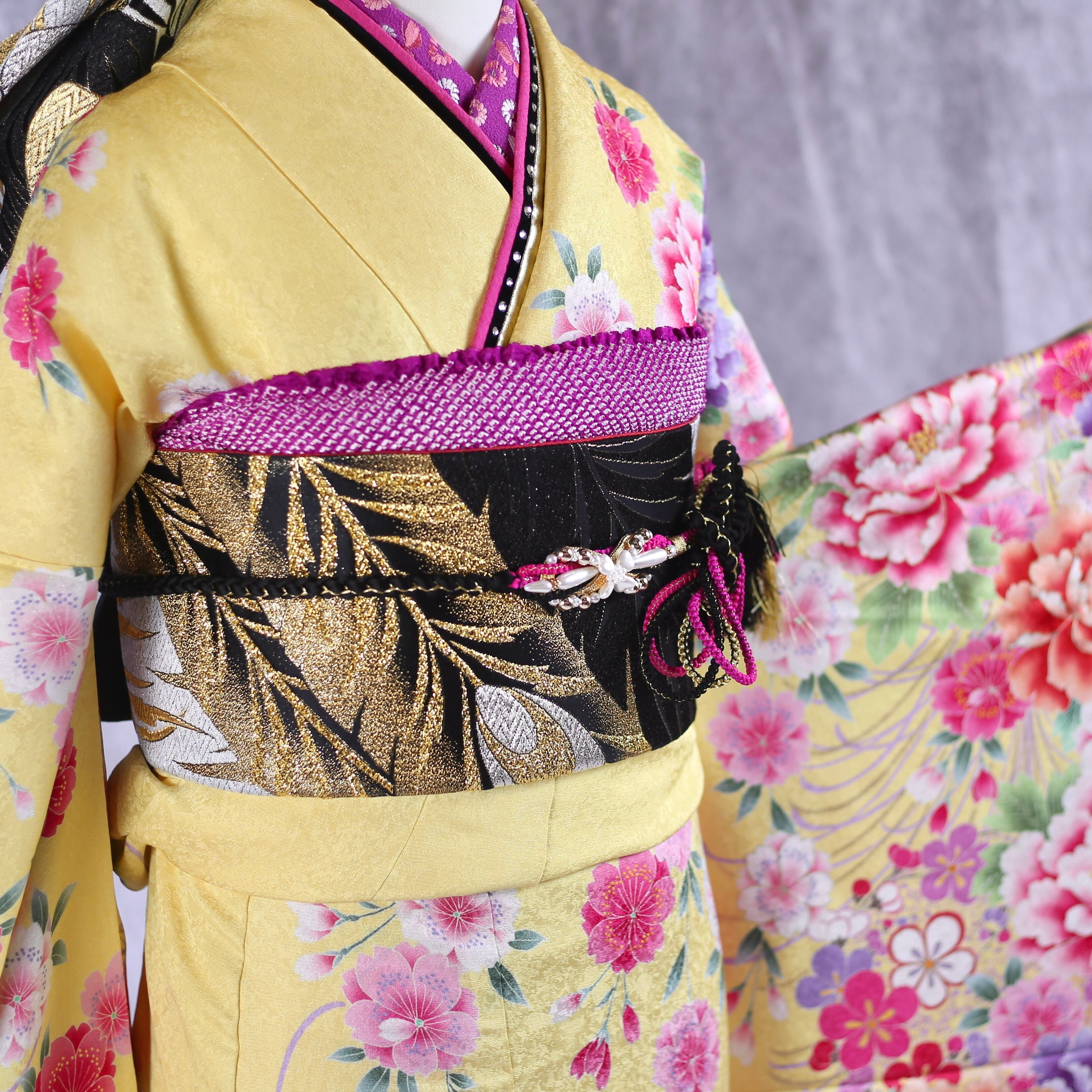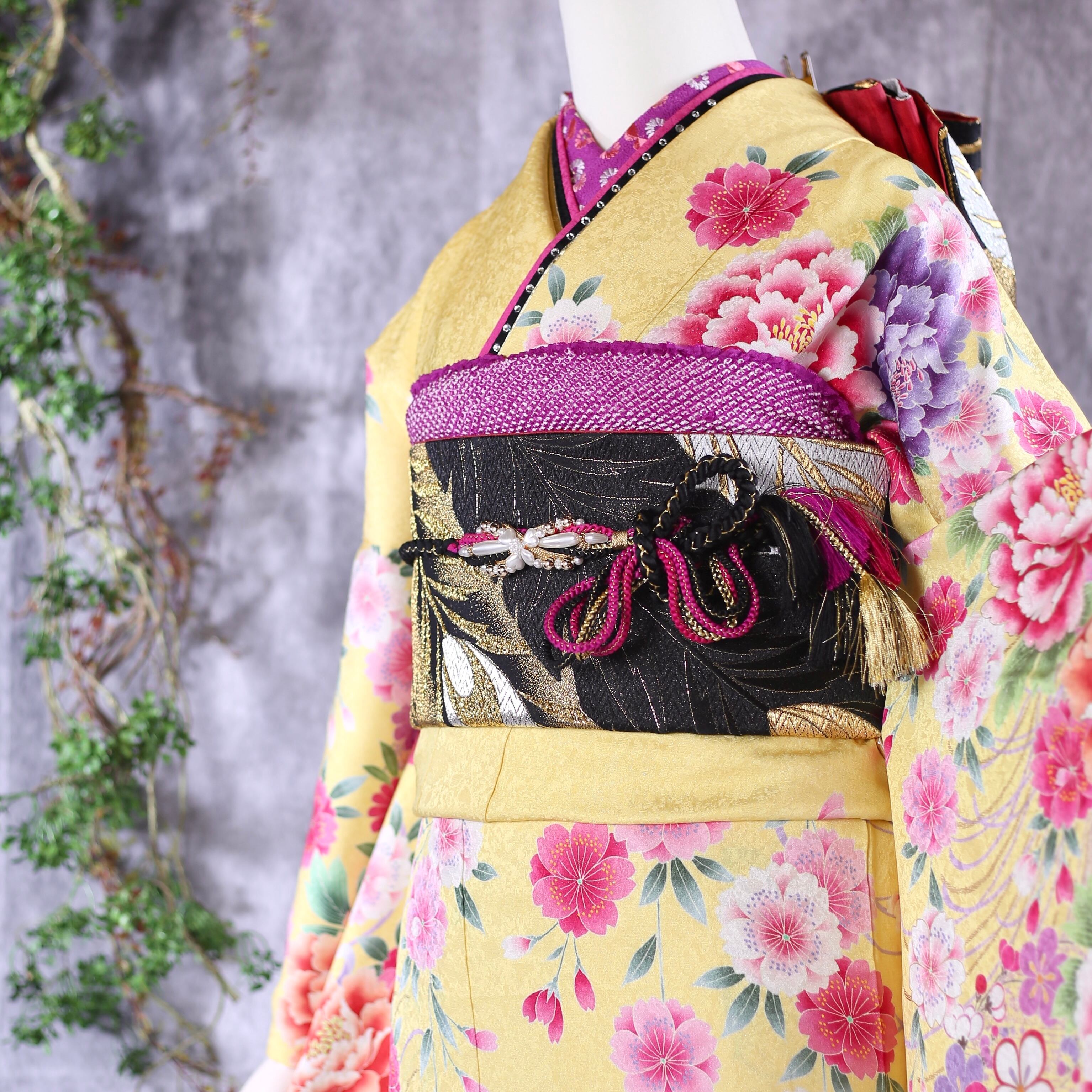 黄色地に牡丹や菊柄が印象的な振袖です。