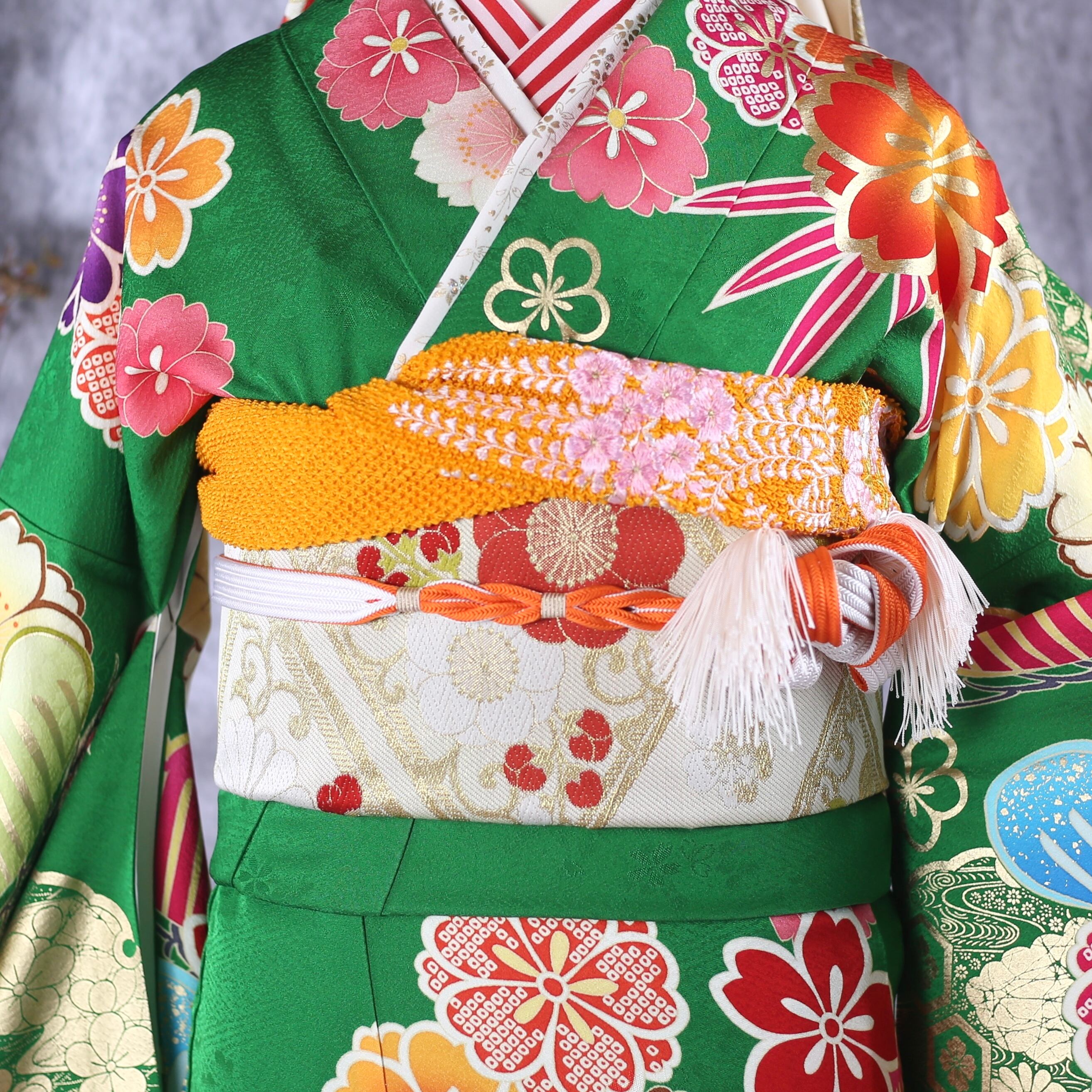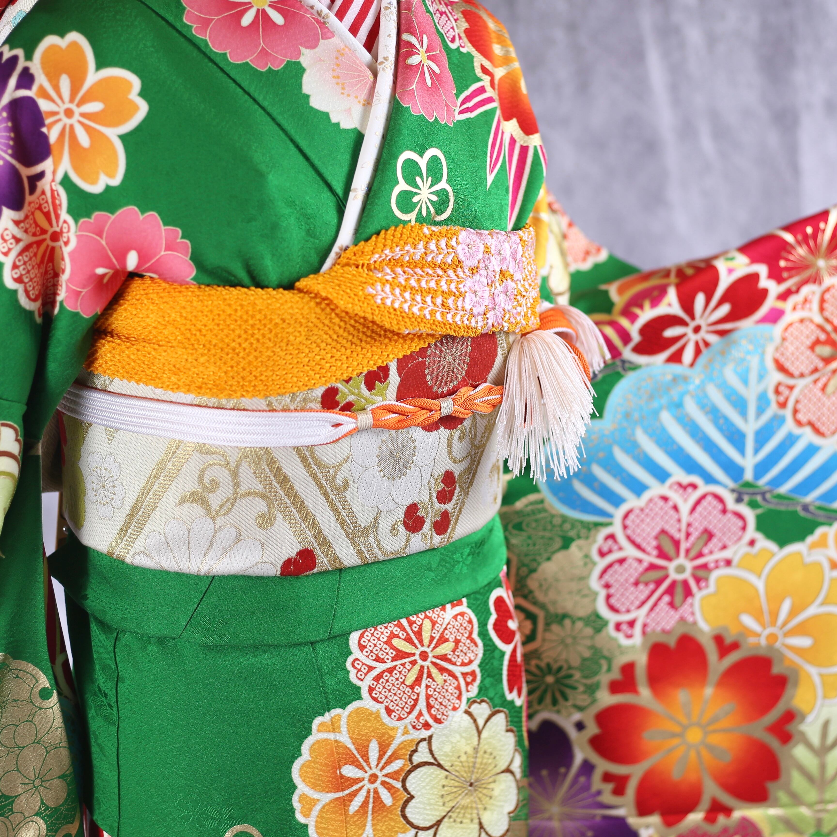 振袖フルセット 振袖セット 振袖 Lサイズ 緑×レトロ 美品 成人式 着物 晴れ着 6点セット KFN-86