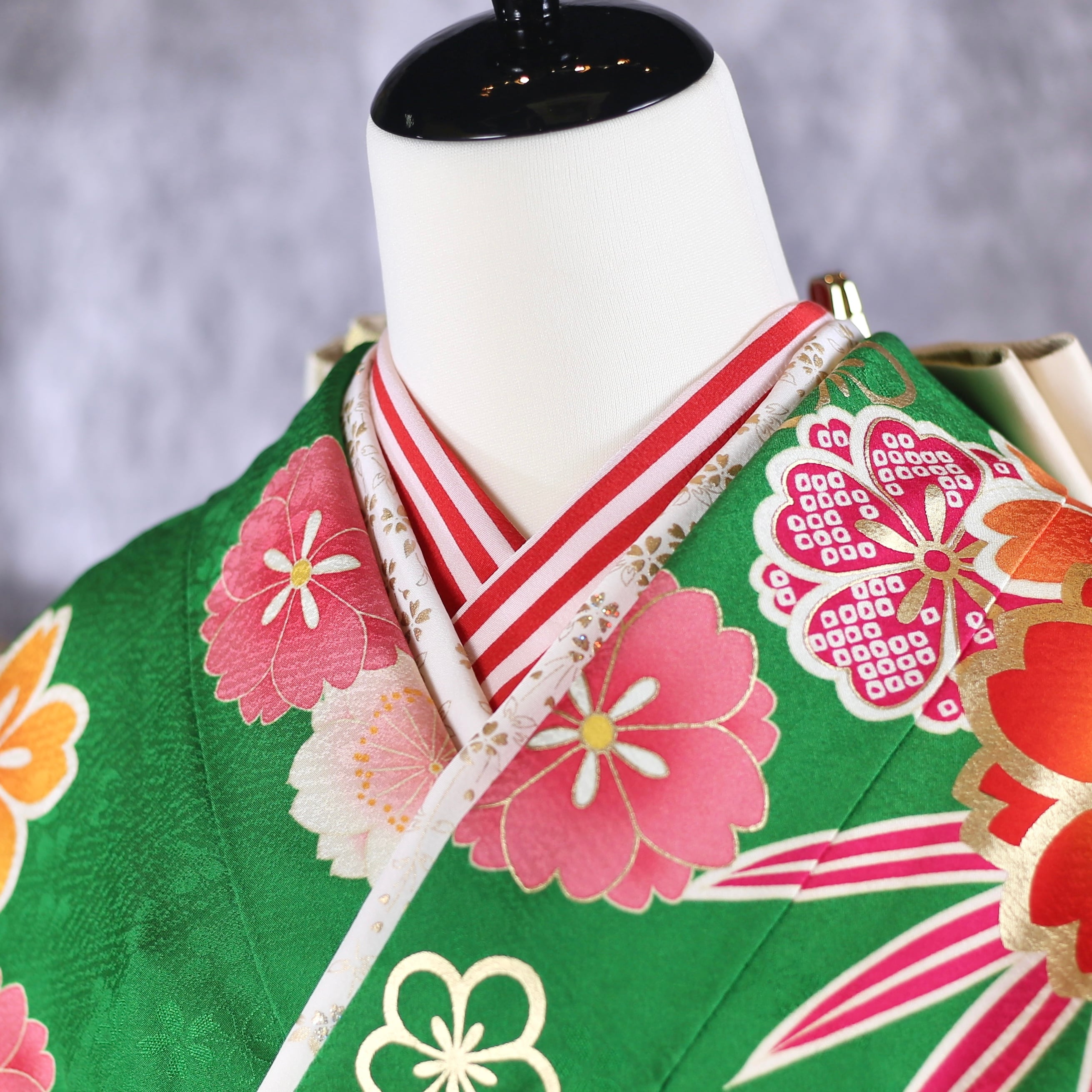 鮮やかな緑地に大胆な松竹梅が描かれているレトロ振袖です。