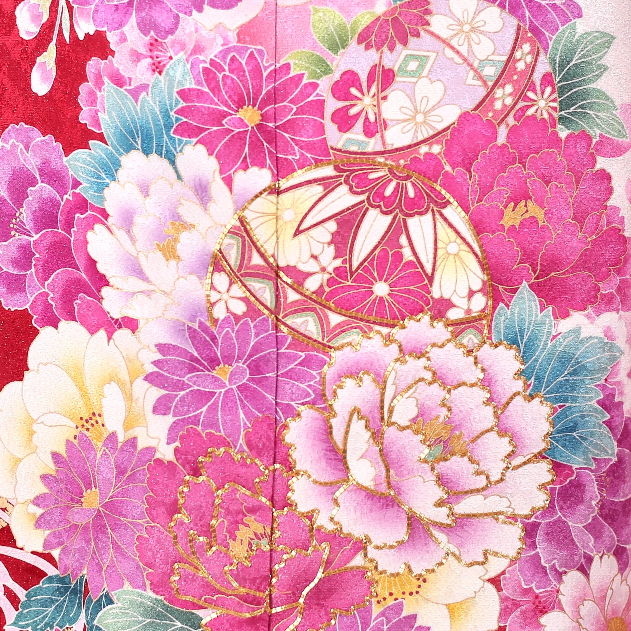 優しい色味の大ぶりな牡丹や鞠が印象的でエレガントで上品に着こなせる一枚です。