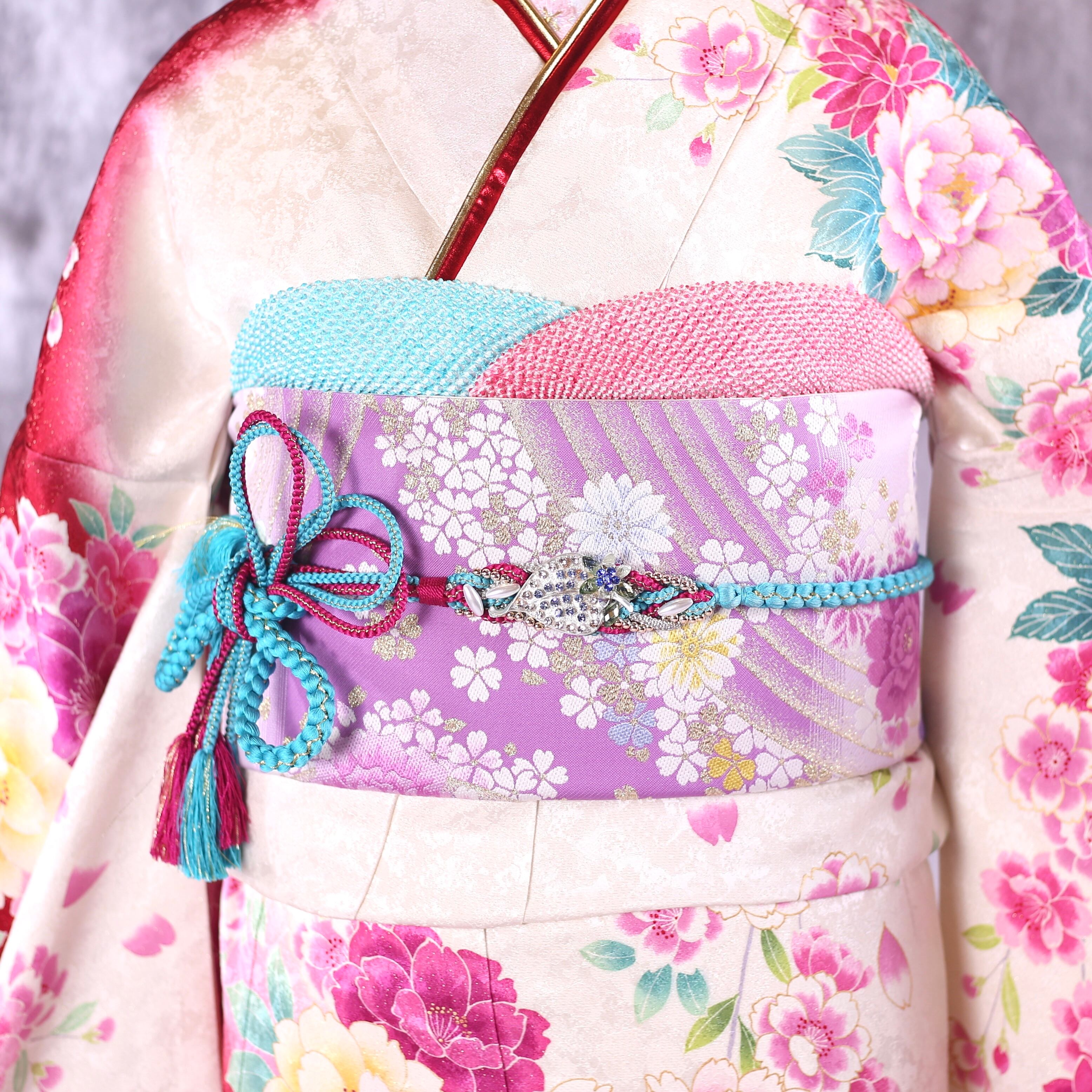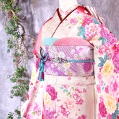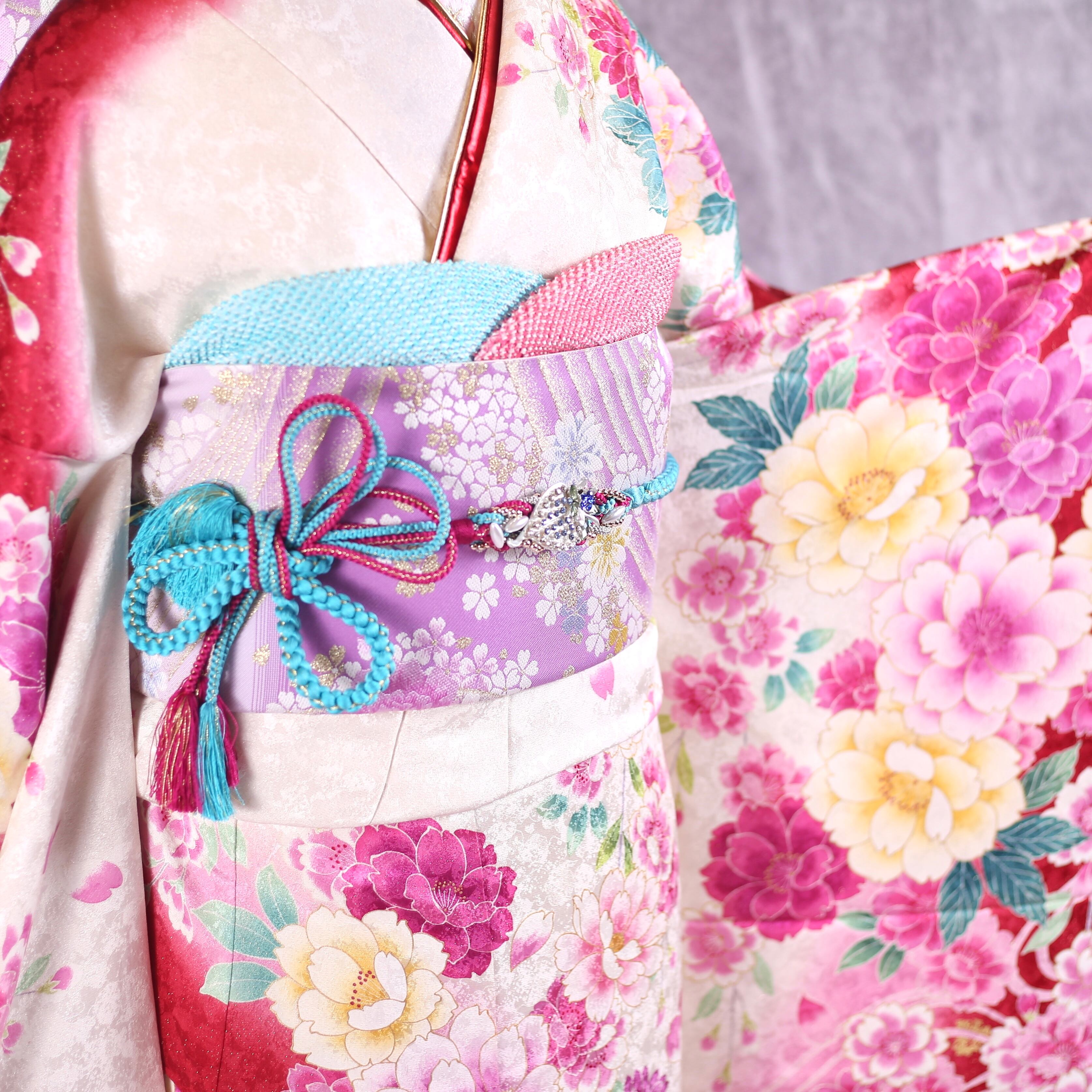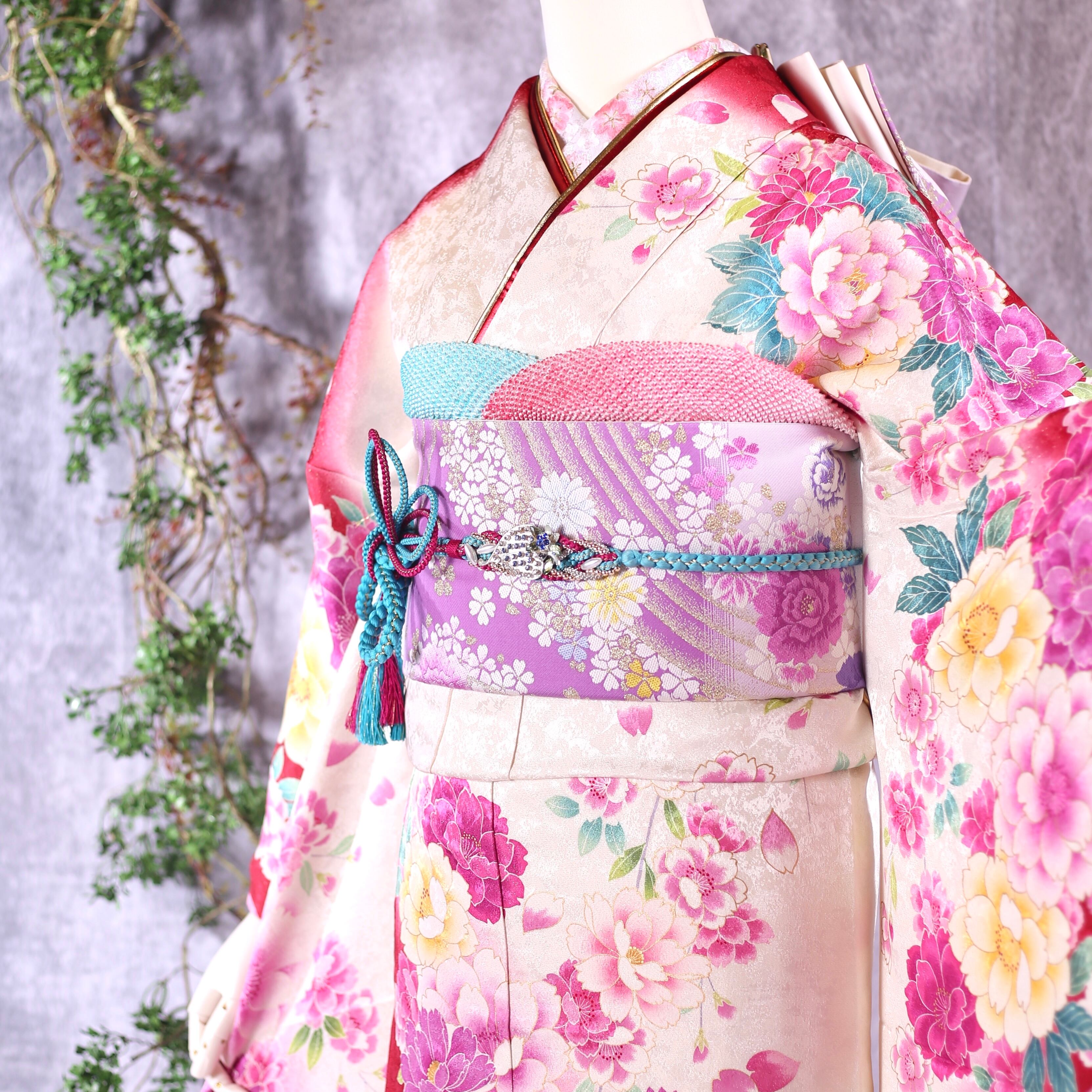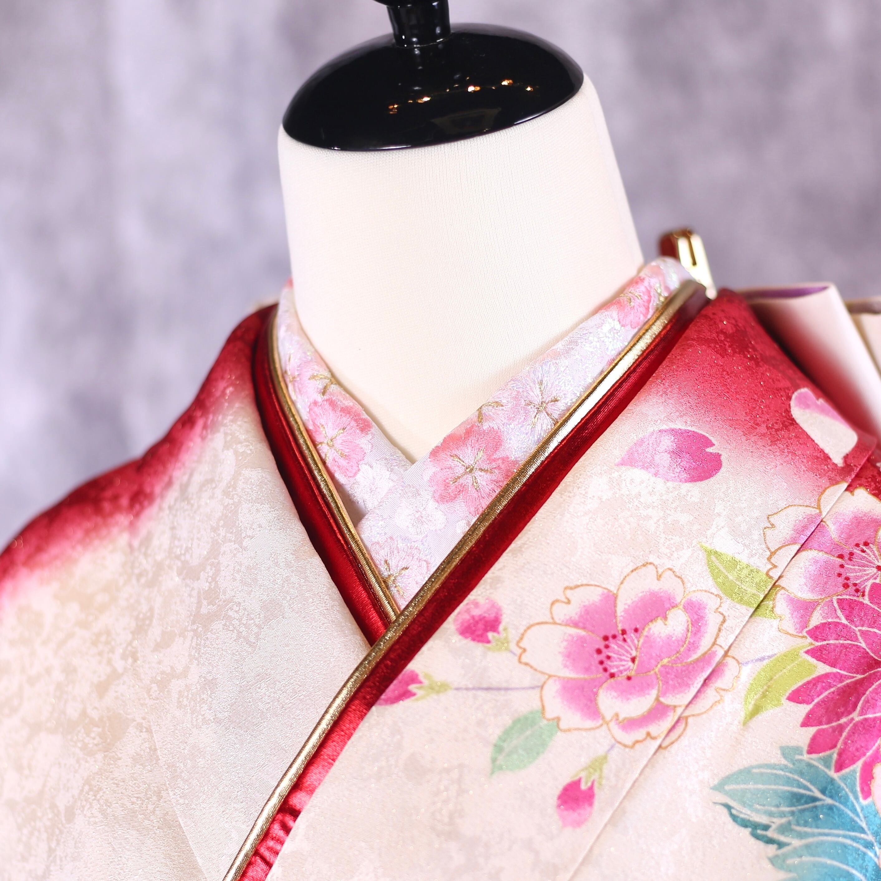 すっきりとした白地にピンクや赤のぼかしが華やかな振袖です。