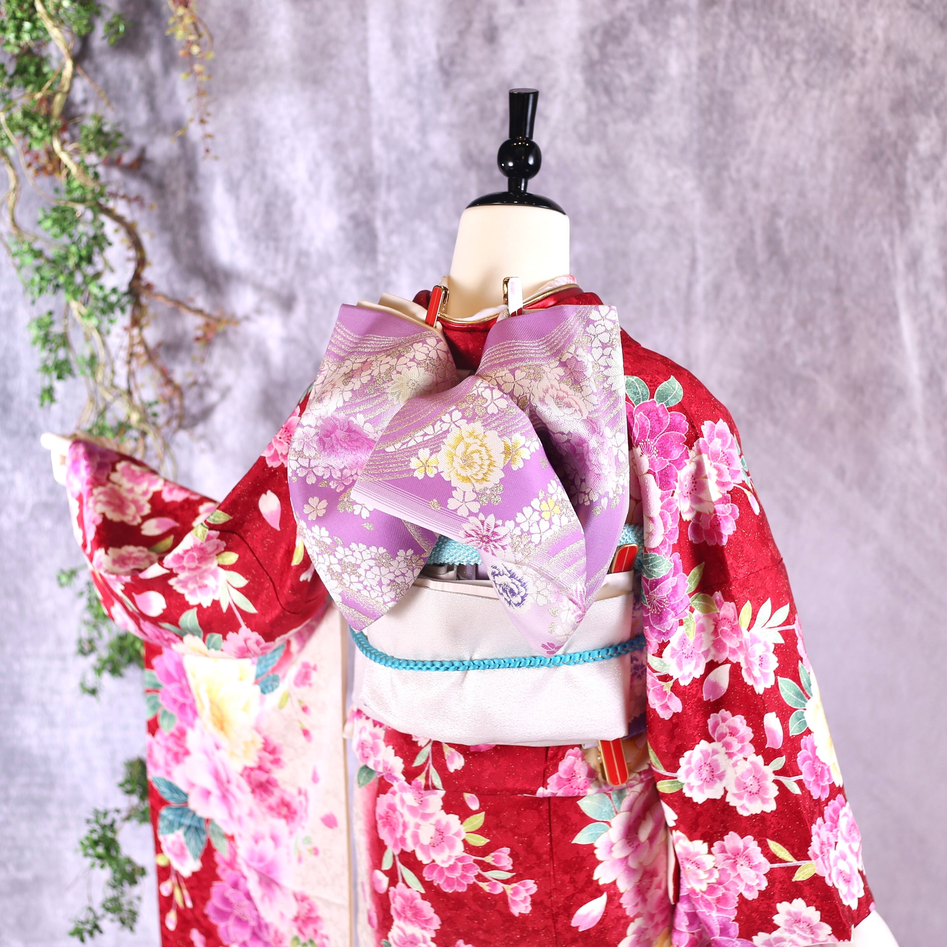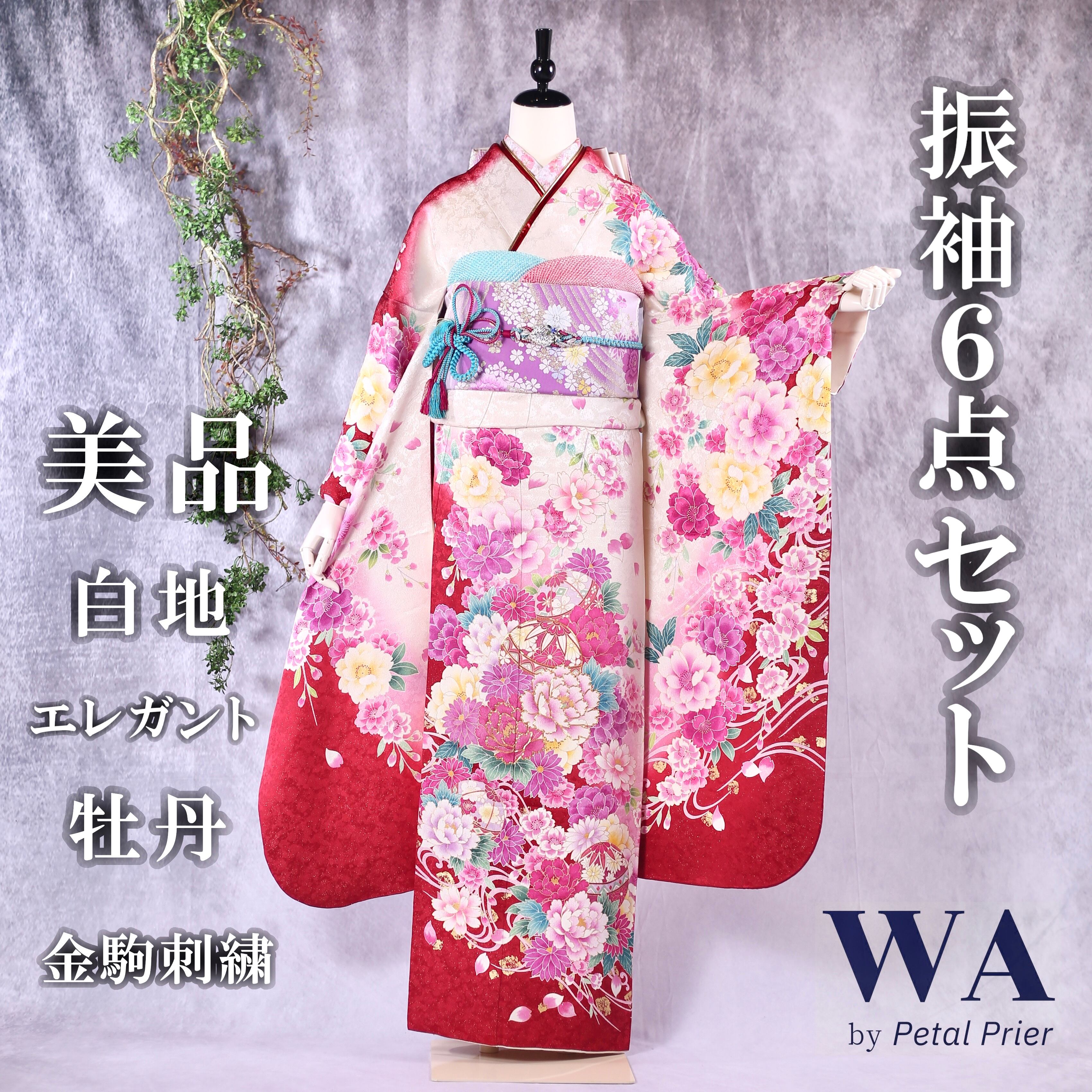 振袖フルセット 振袖セット 振袖 S〜Mサイズ 白赤×エレガント 美品 成人式 着物 晴れ着 6点セット KFN-47