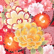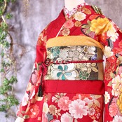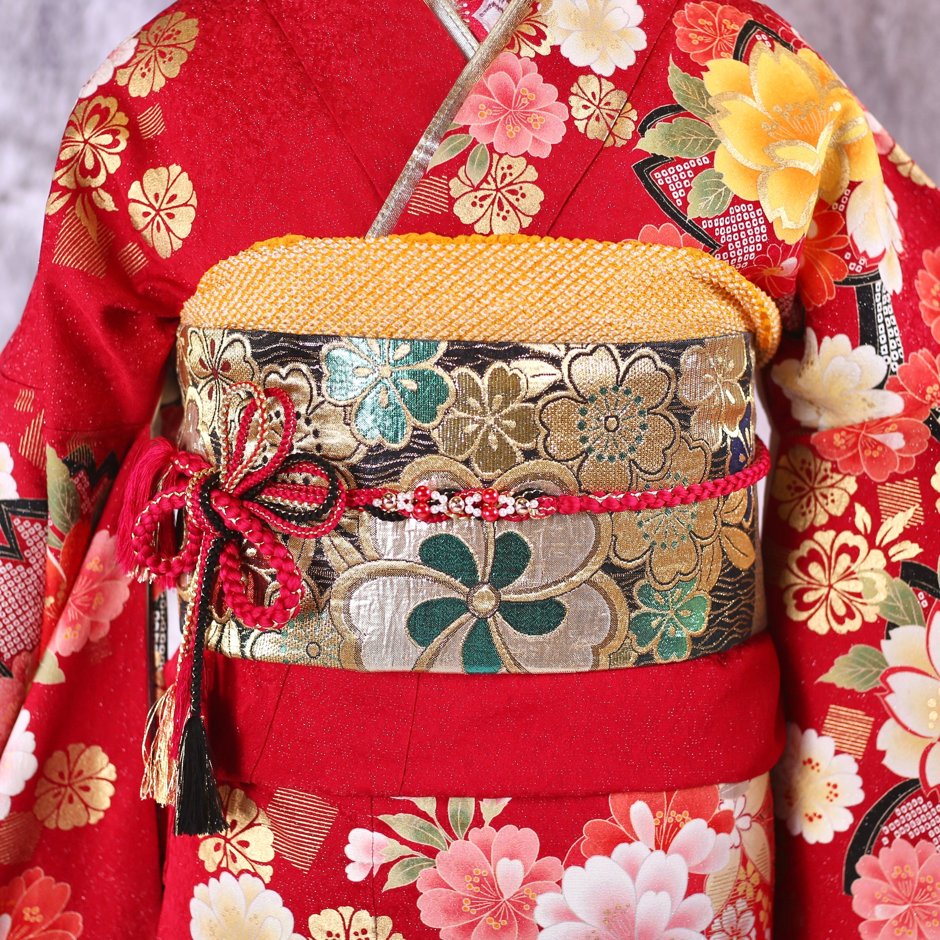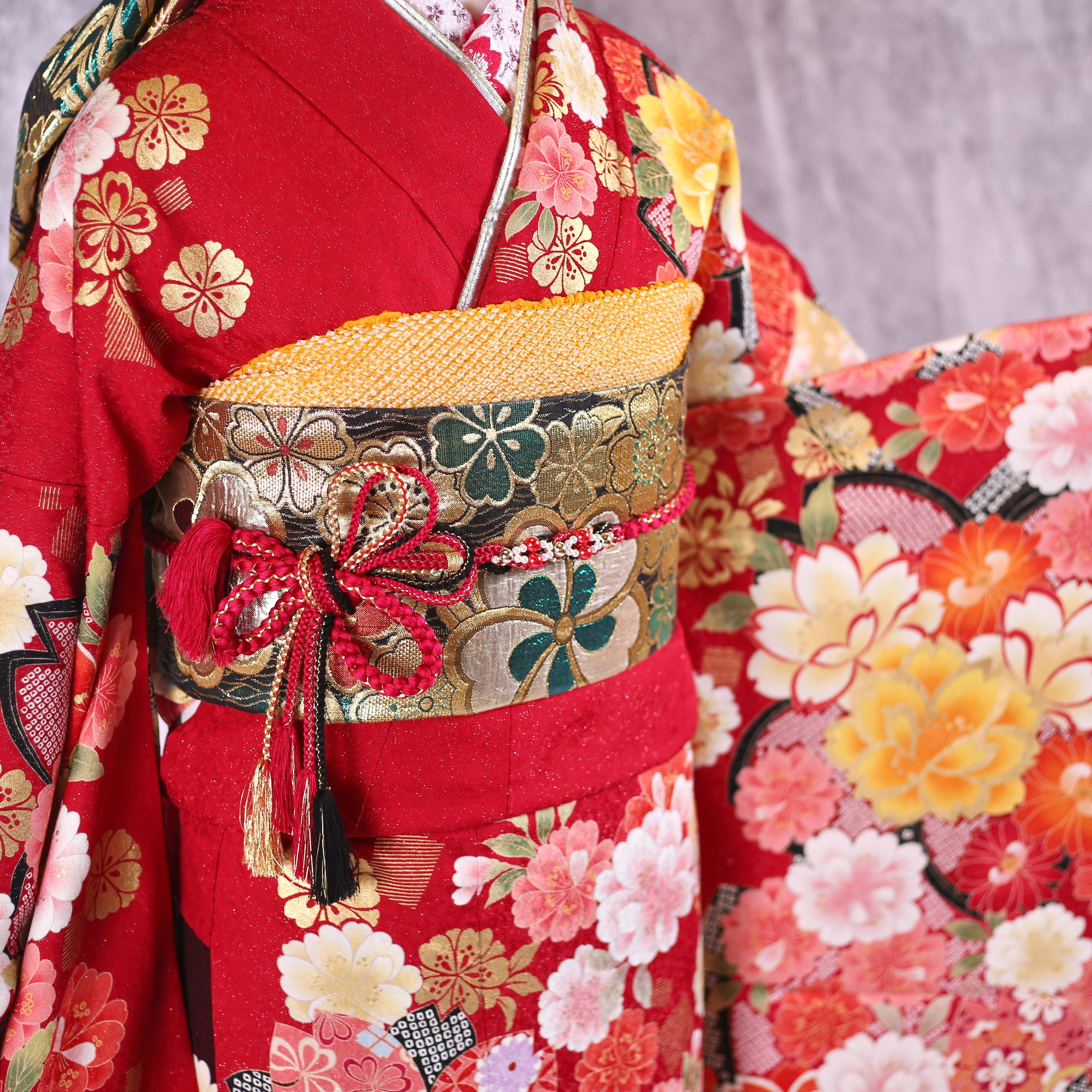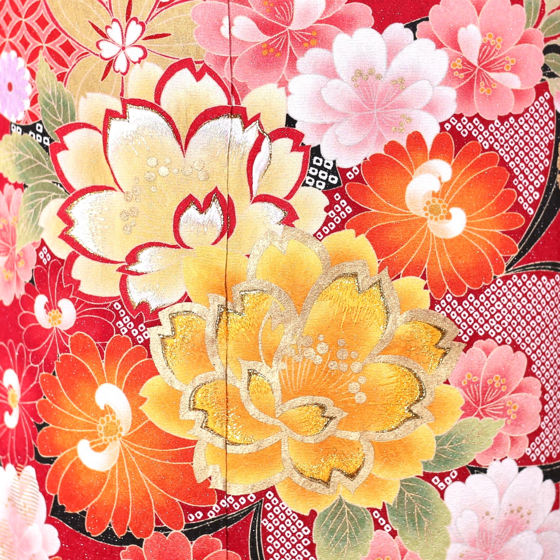 赤地に牡丹や桜柄が全面に散りばめられた古典振袖です。
