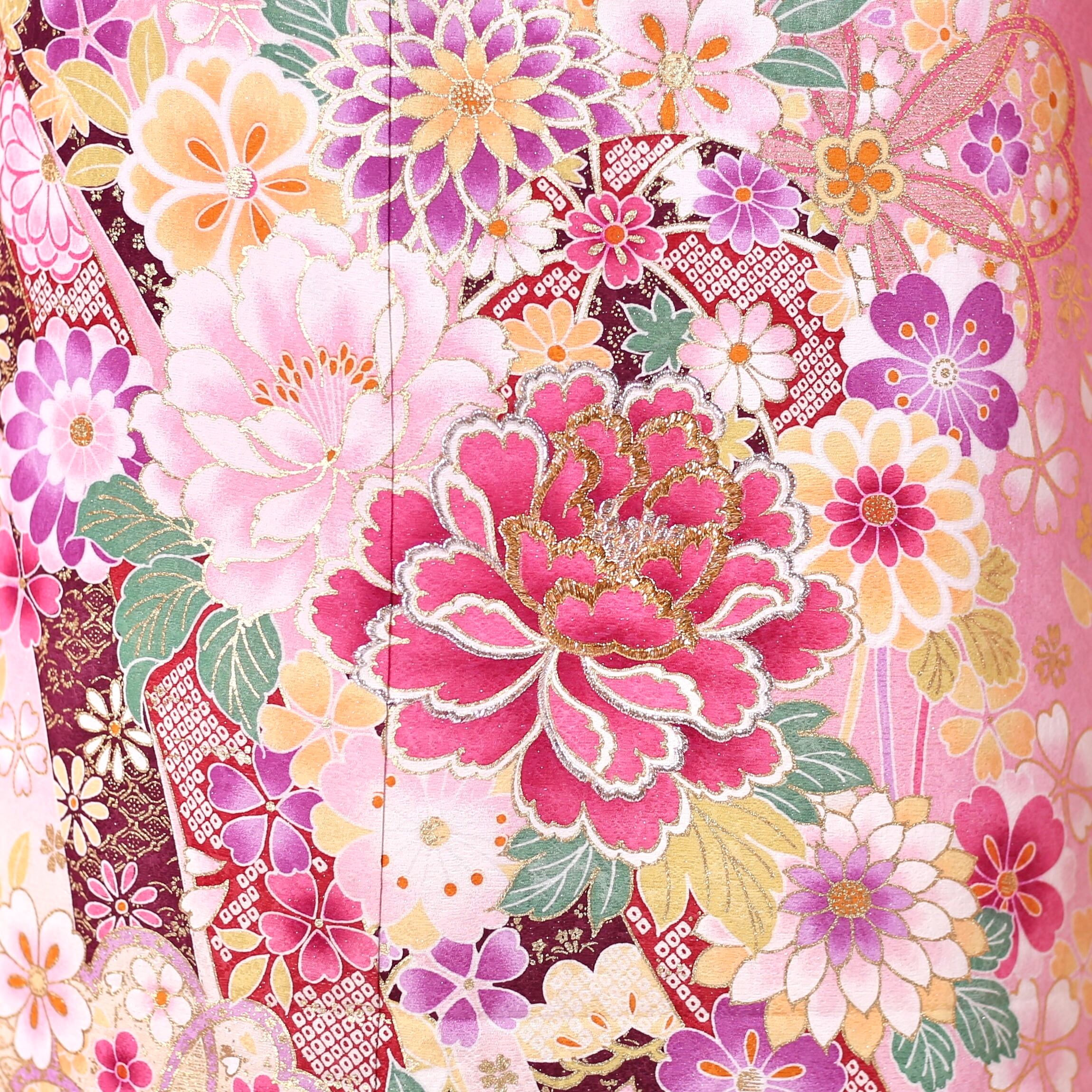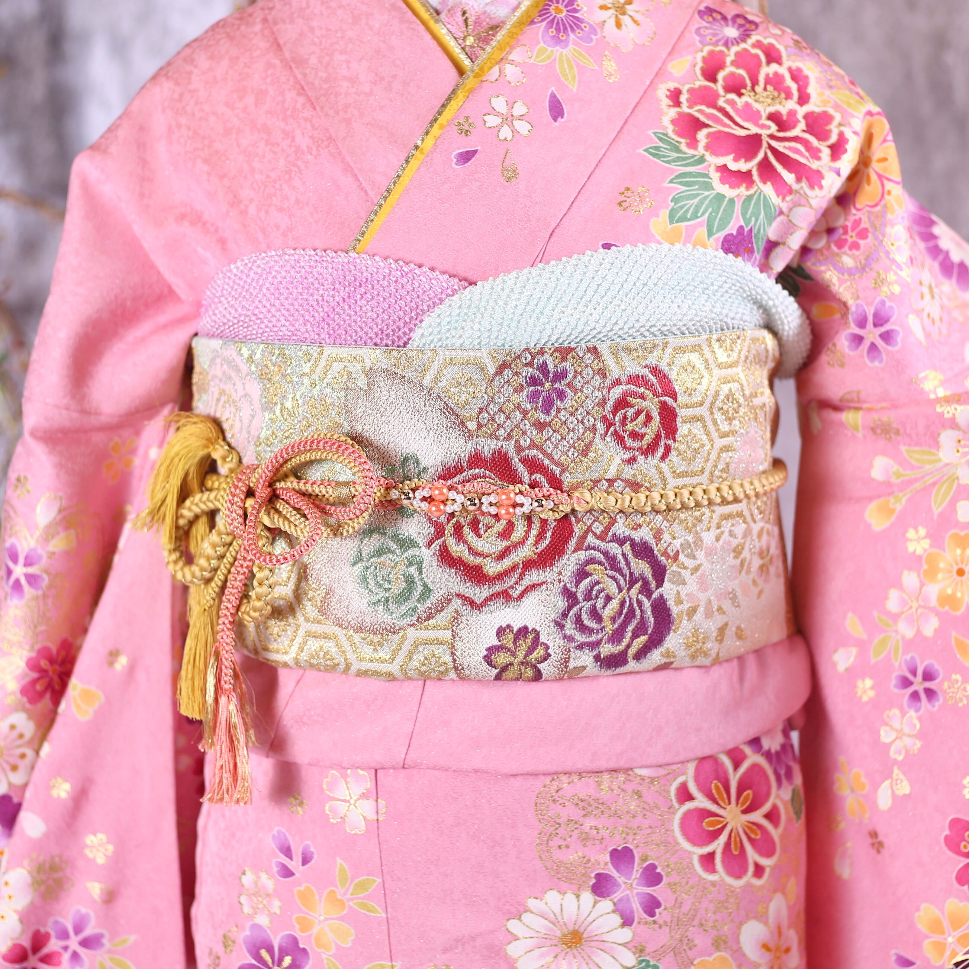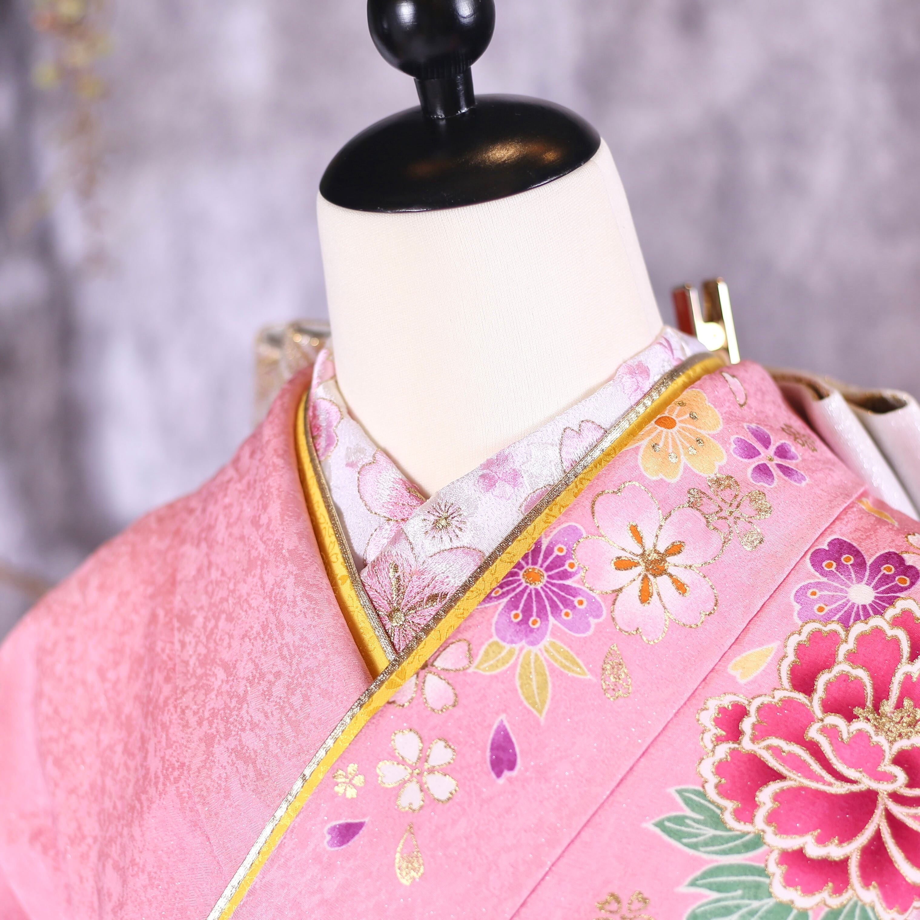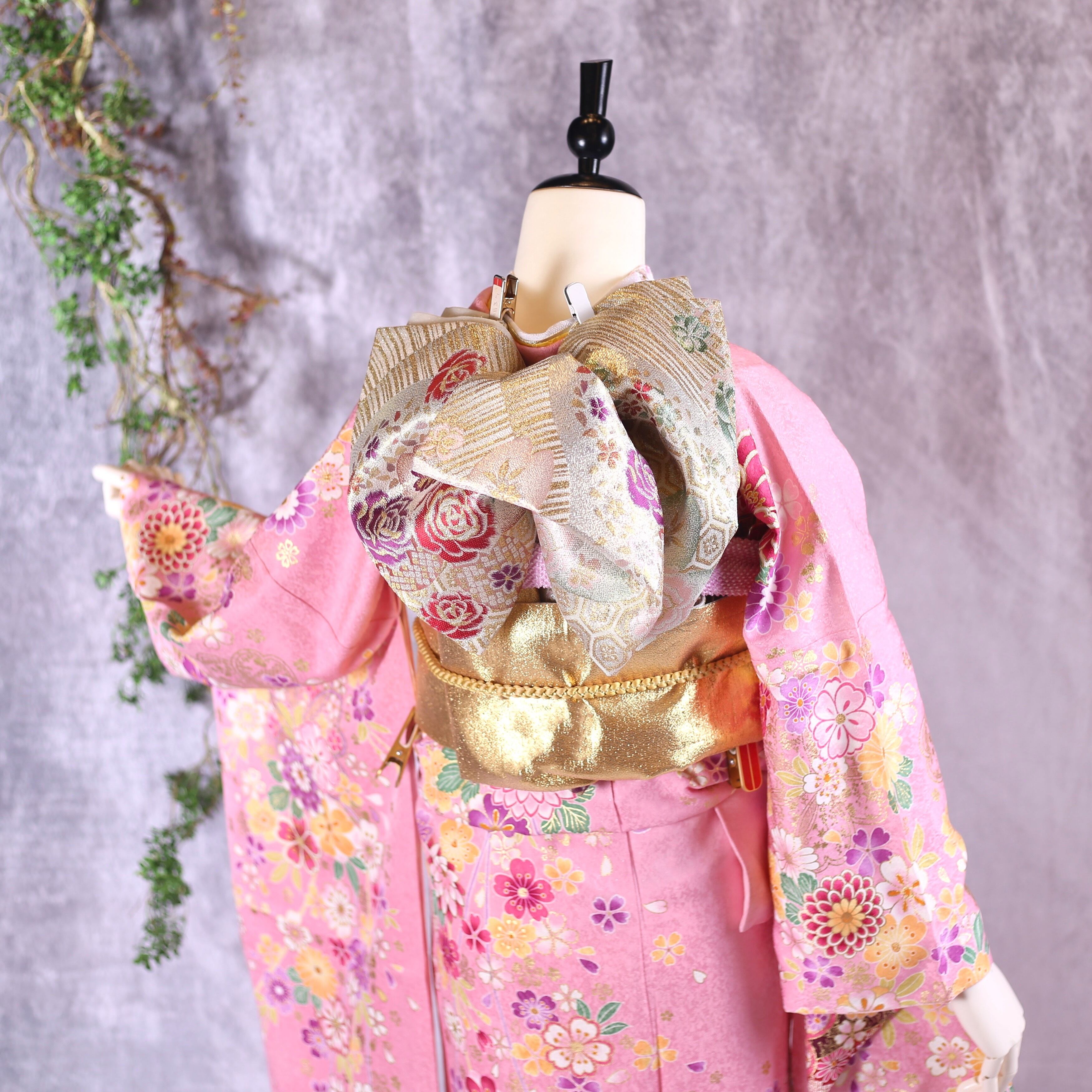 優しいピンク地に桜と熨斗柄が印象的な振袖です。