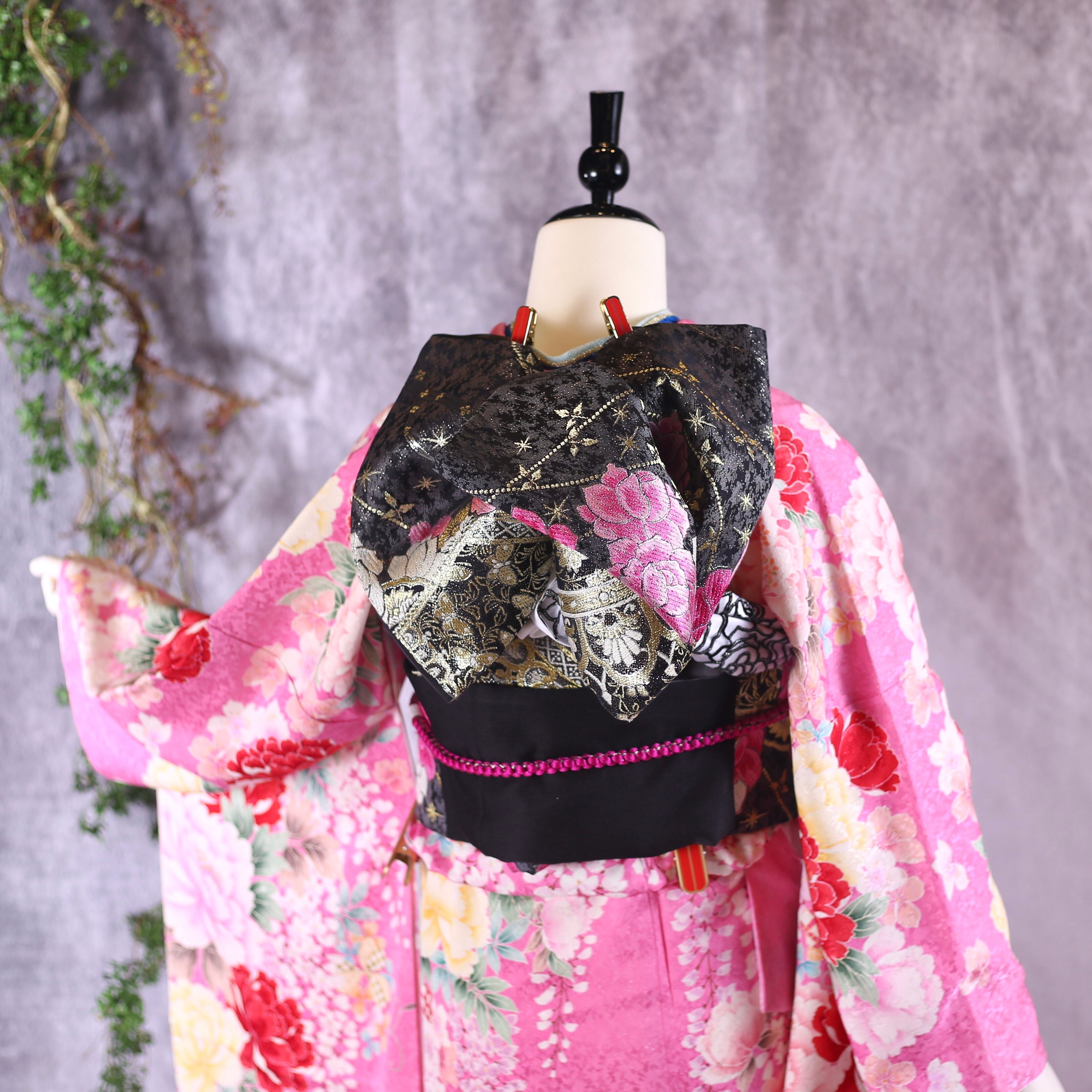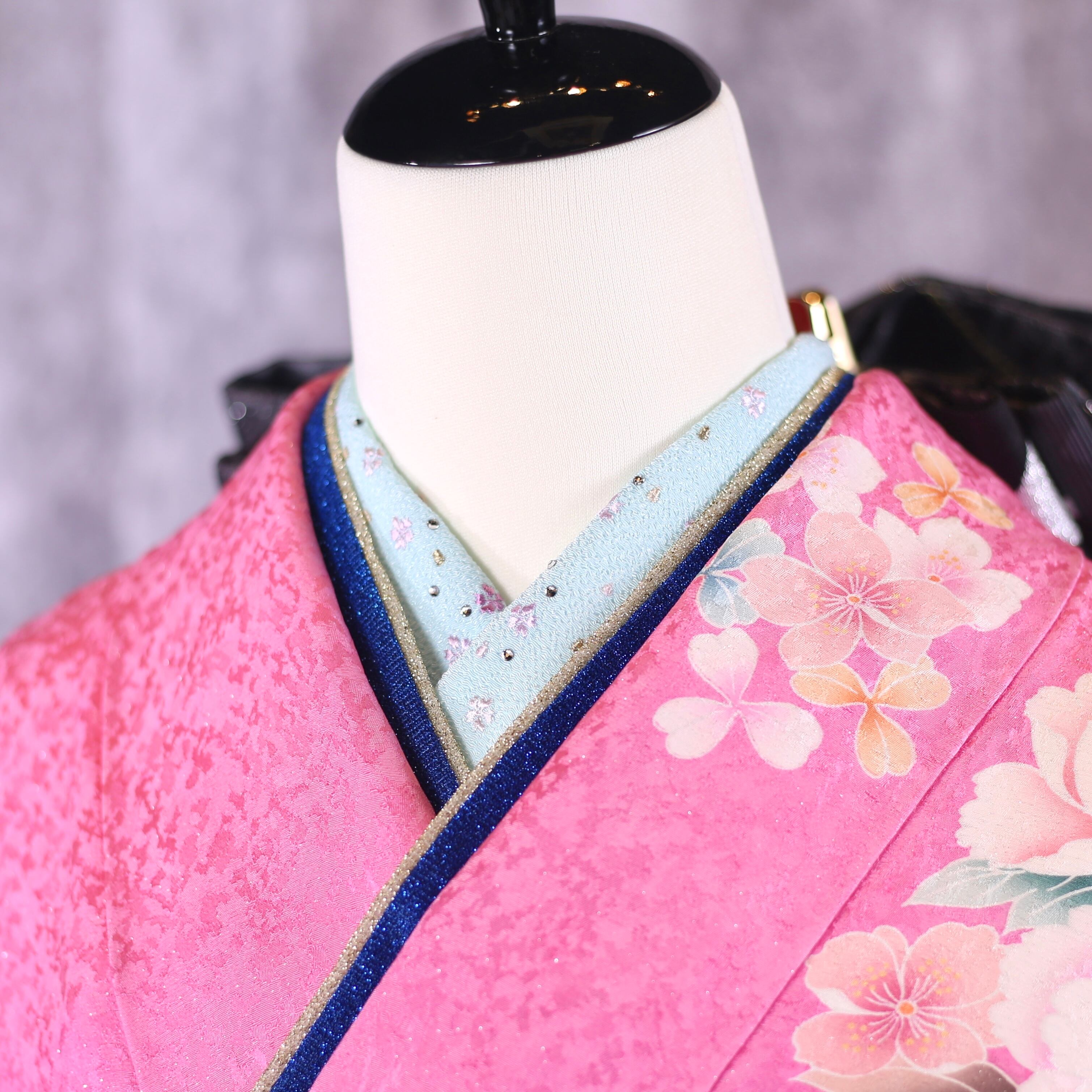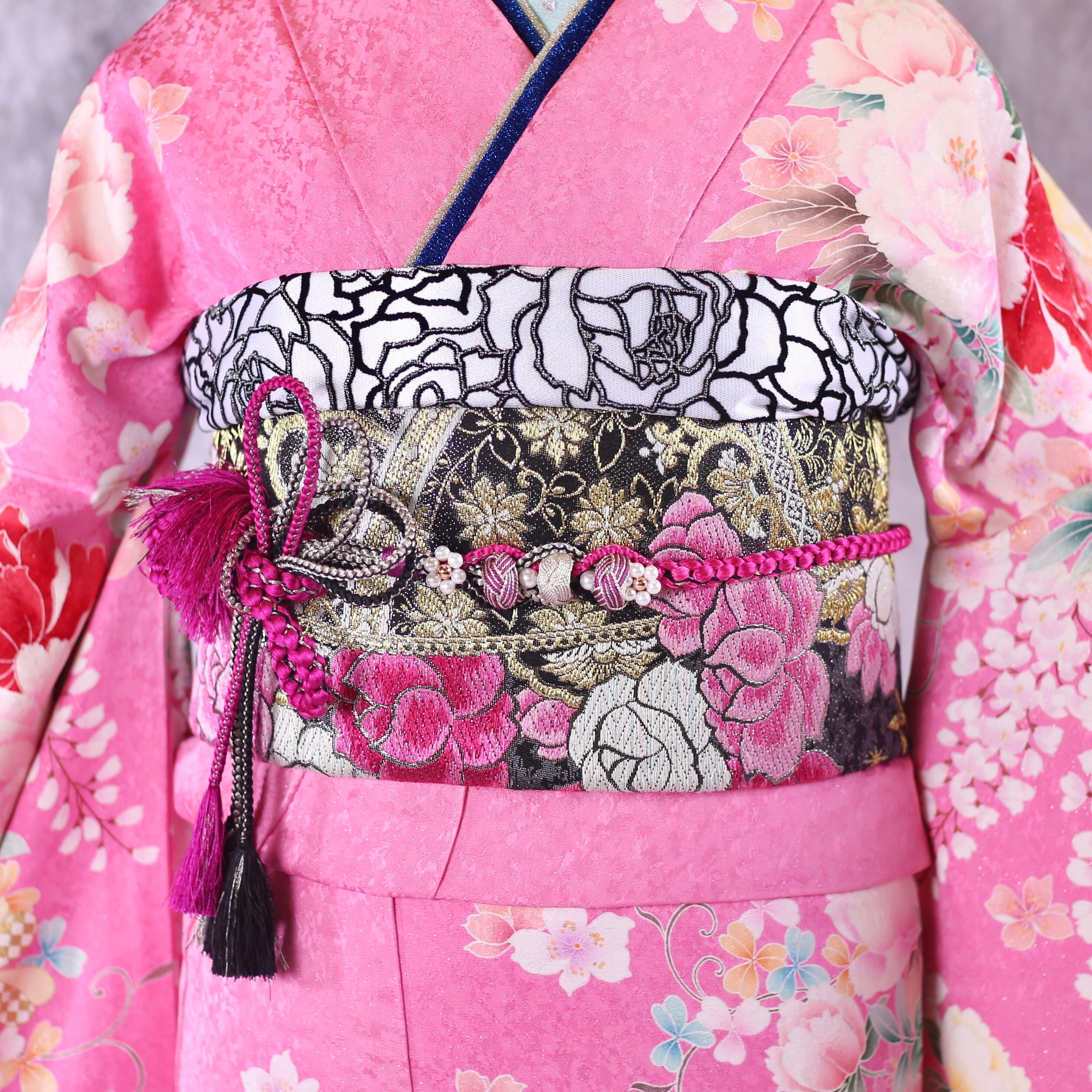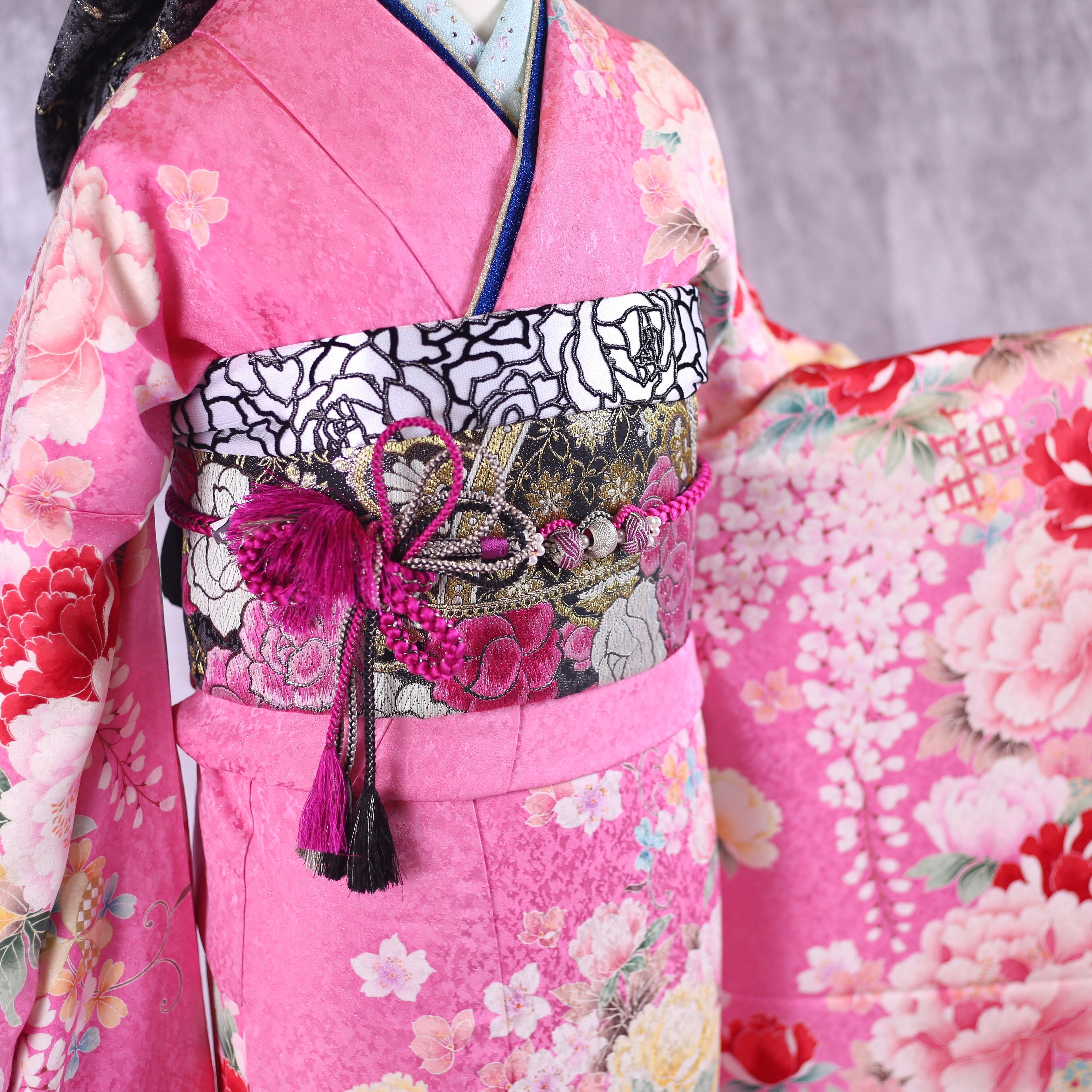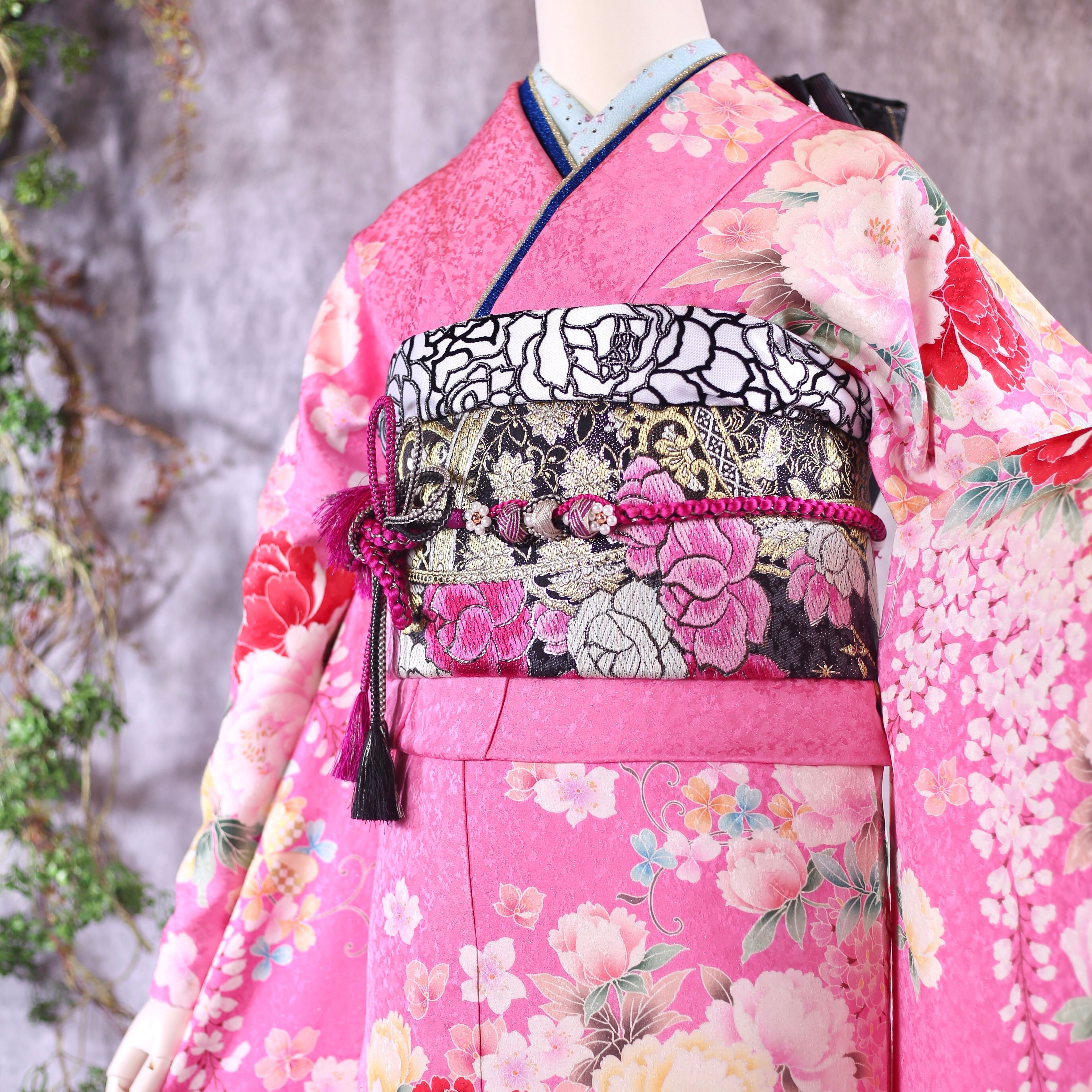 鮮やかなピンク地に牡丹と藤柄が印象的な振袖です。