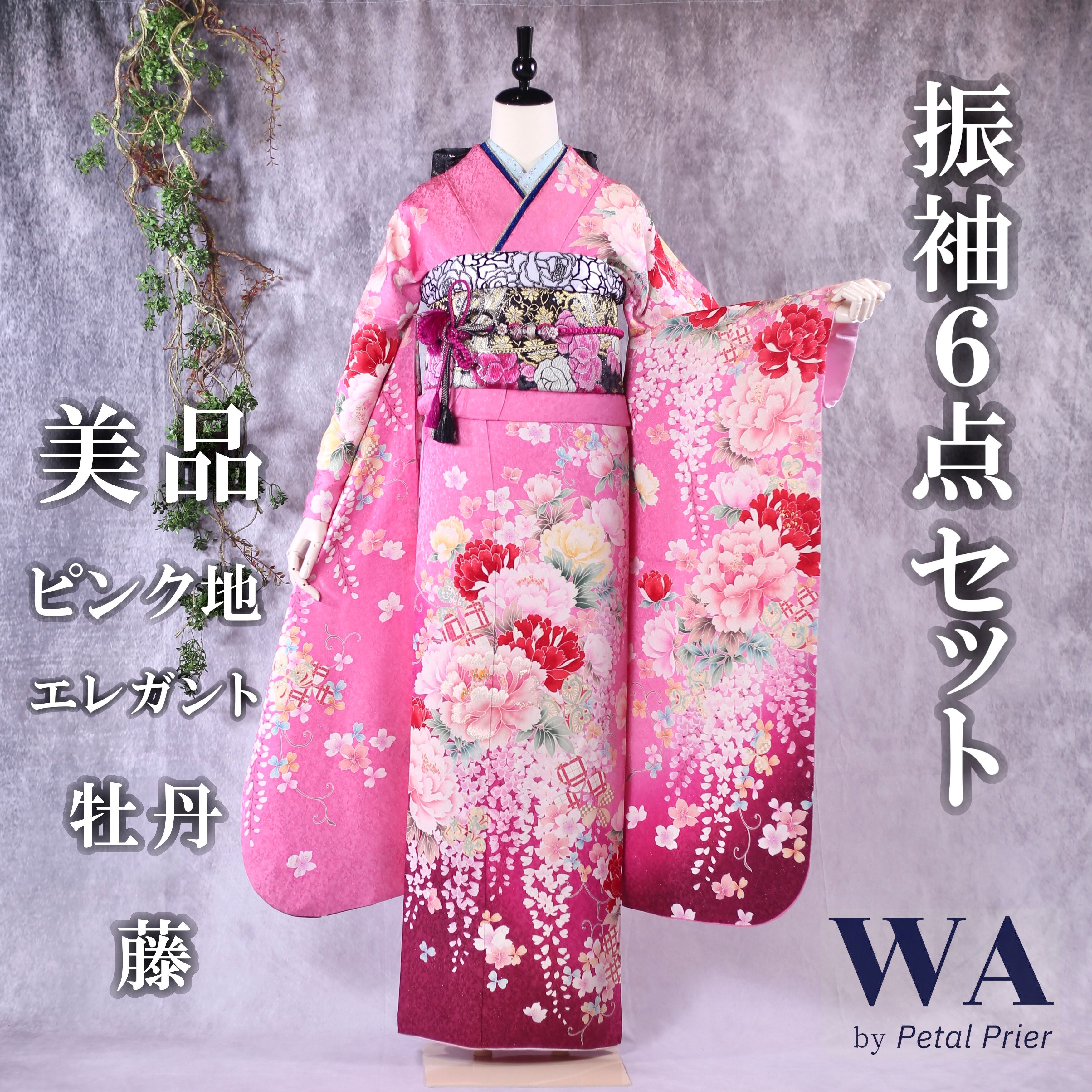 振袖フルセット 振袖セット 振袖 M〜Lサイズ ピンク×藤 美品 成人式 着物 晴れ着 6点セット KFN-66