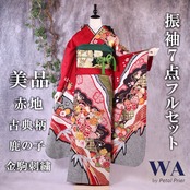 振袖フルセット 振袖セット 振袖 L〜LLサイズ 赤×古典 美品 成人式 着物 晴れ着 7点フルセット F-273