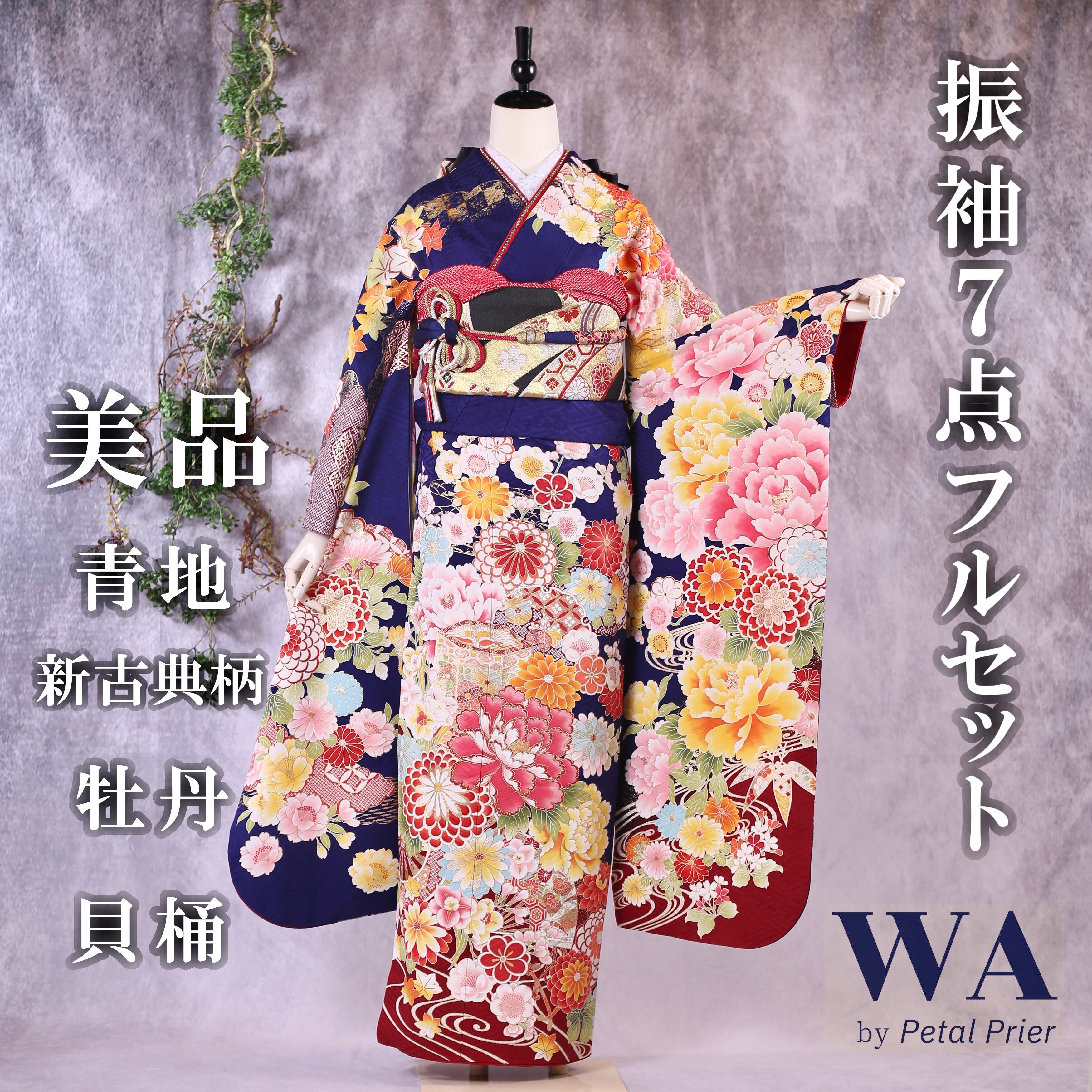 振袖フルセット 振袖セット 振袖 Lサイズ 青×新古典 美品 成人式 着物 晴れ着 7点フルセット F-258