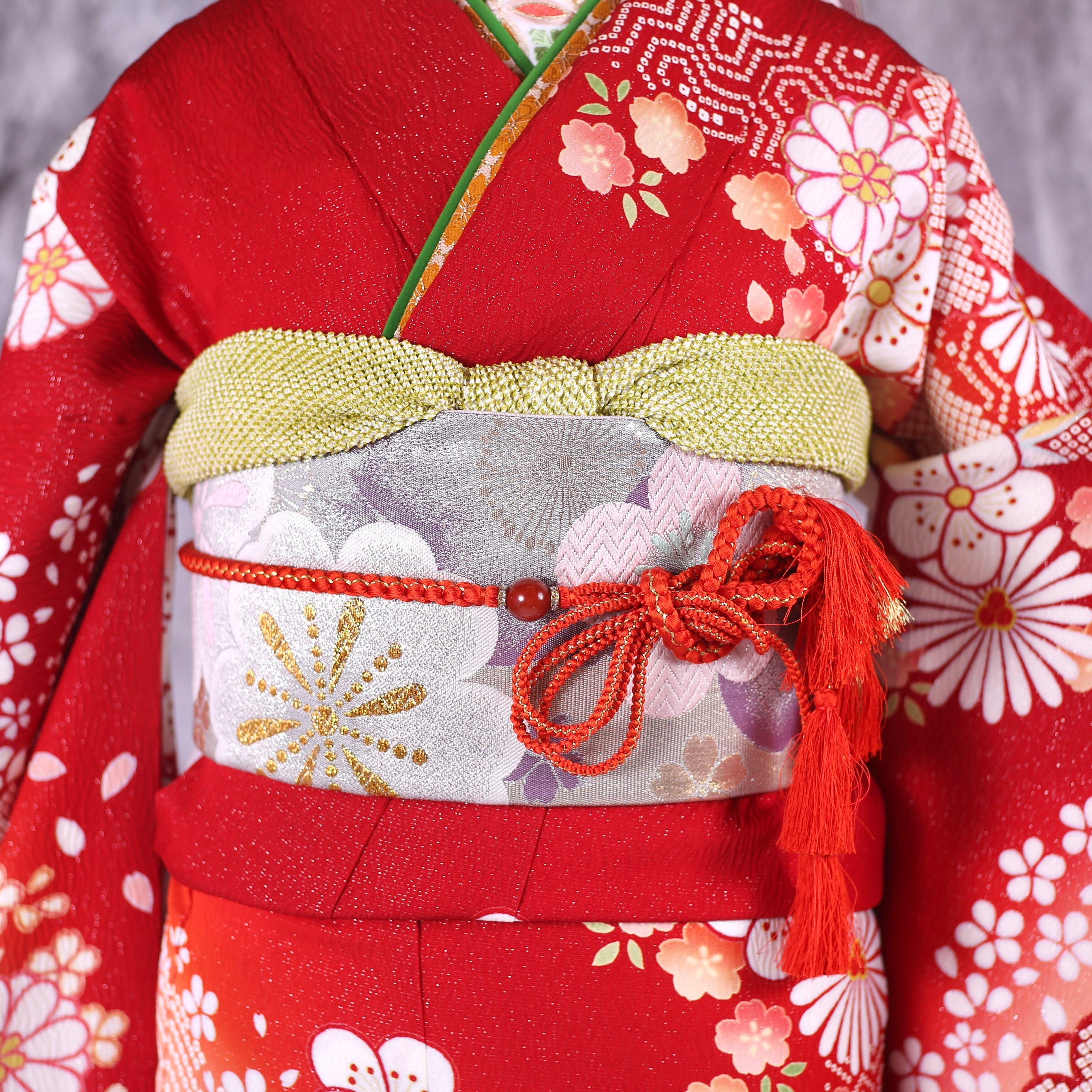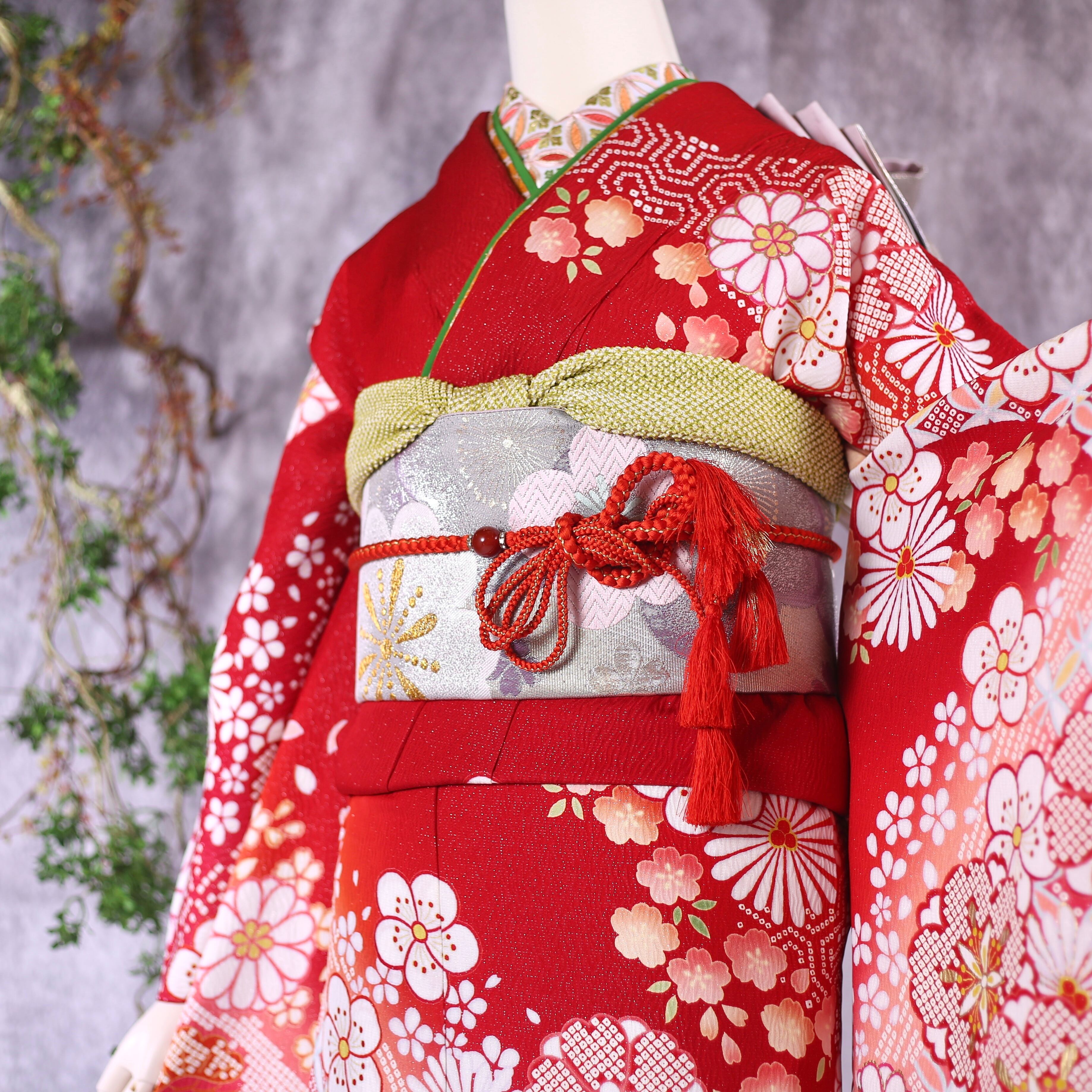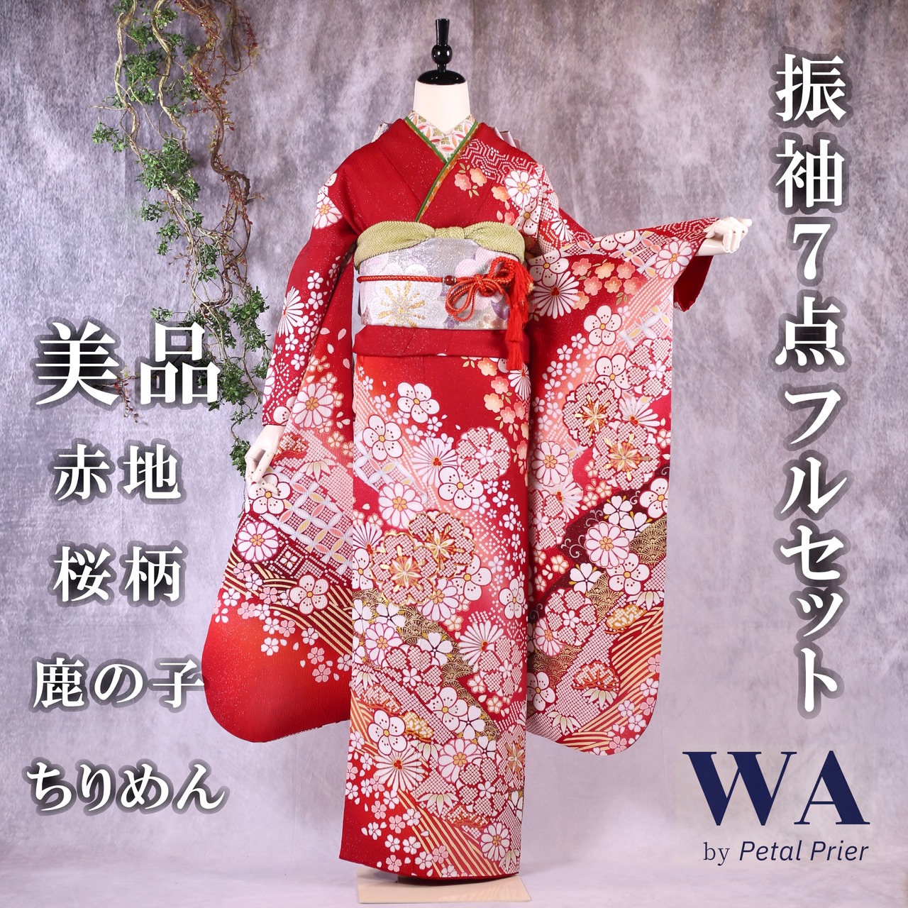 振袖フルセット 振袖セット 振袖 Lサイズ 赤×ちりめん 美品 成人式 着物 晴れ着 7点フルセット F-259