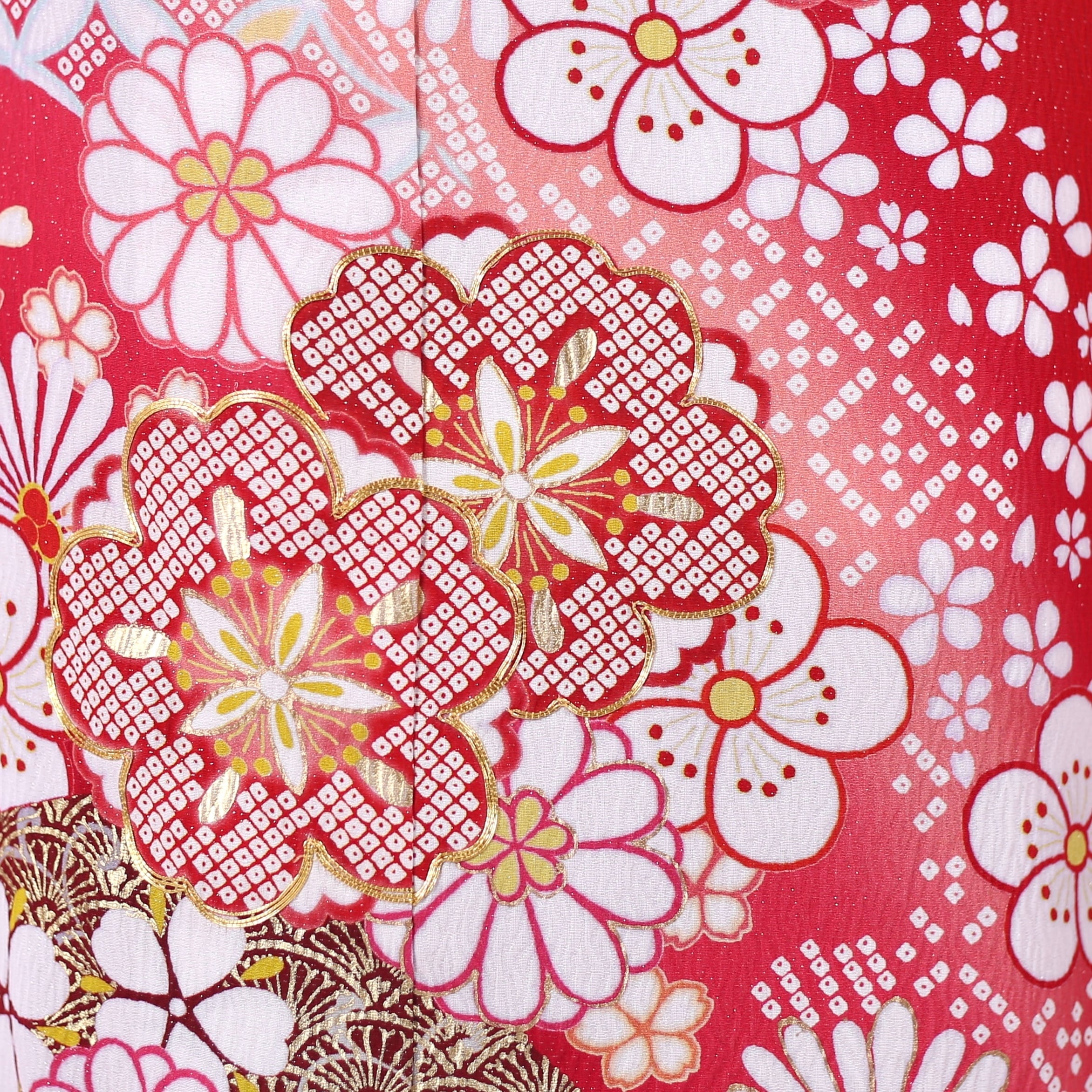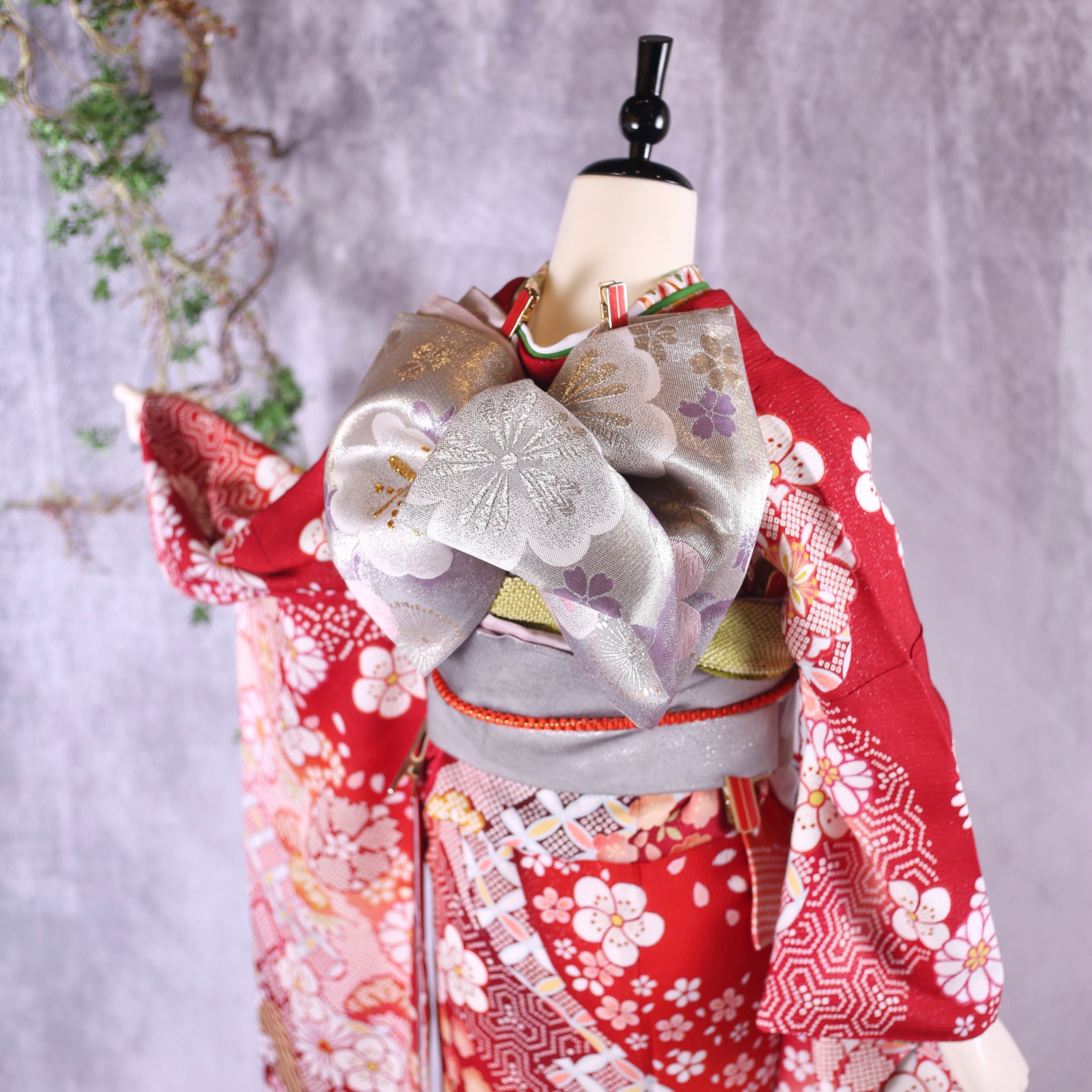 ラメ入りの赤地に桜と鹿の子が映えるちりめんの振袖です。