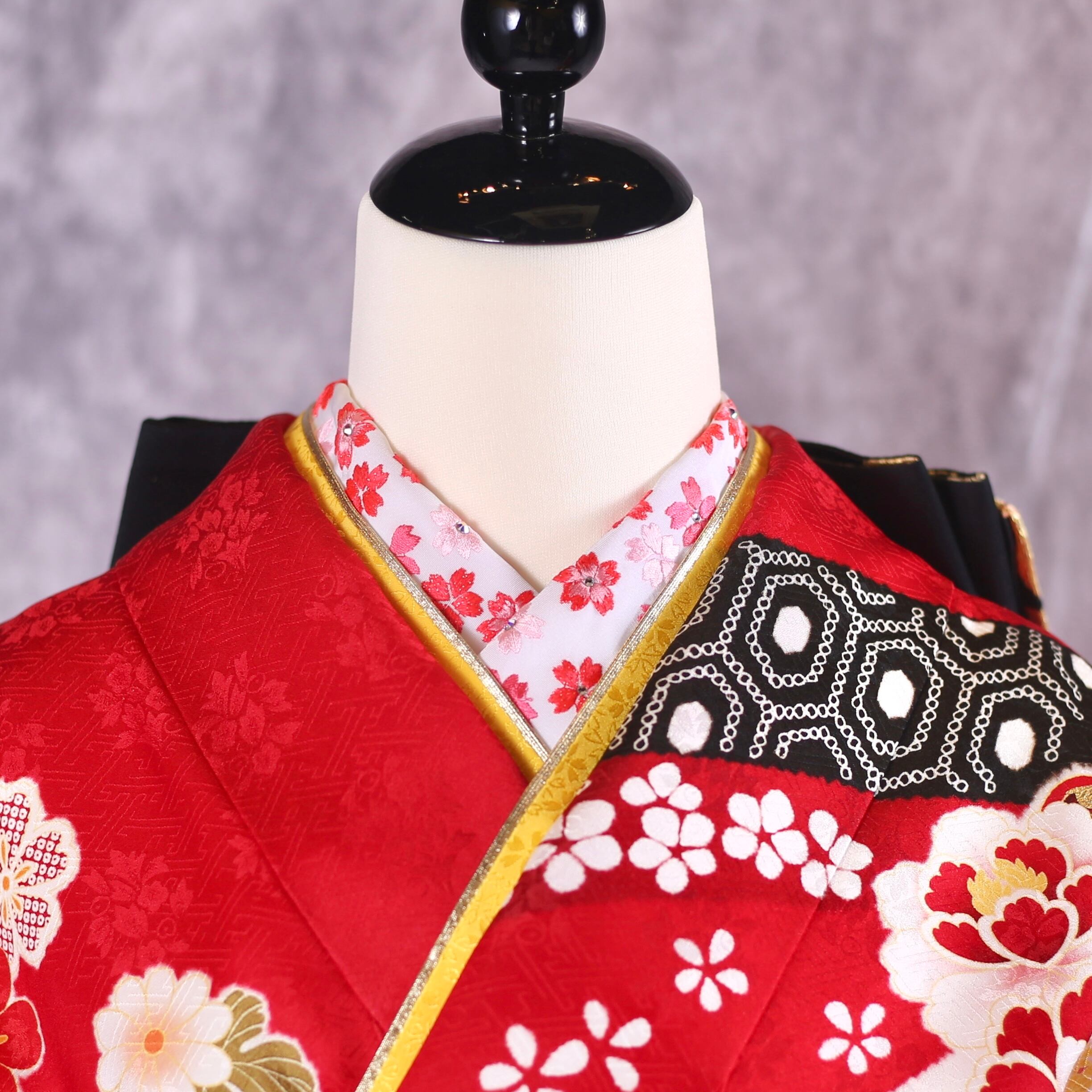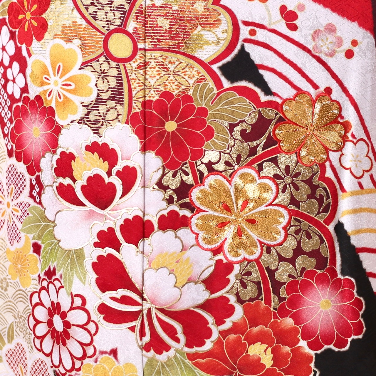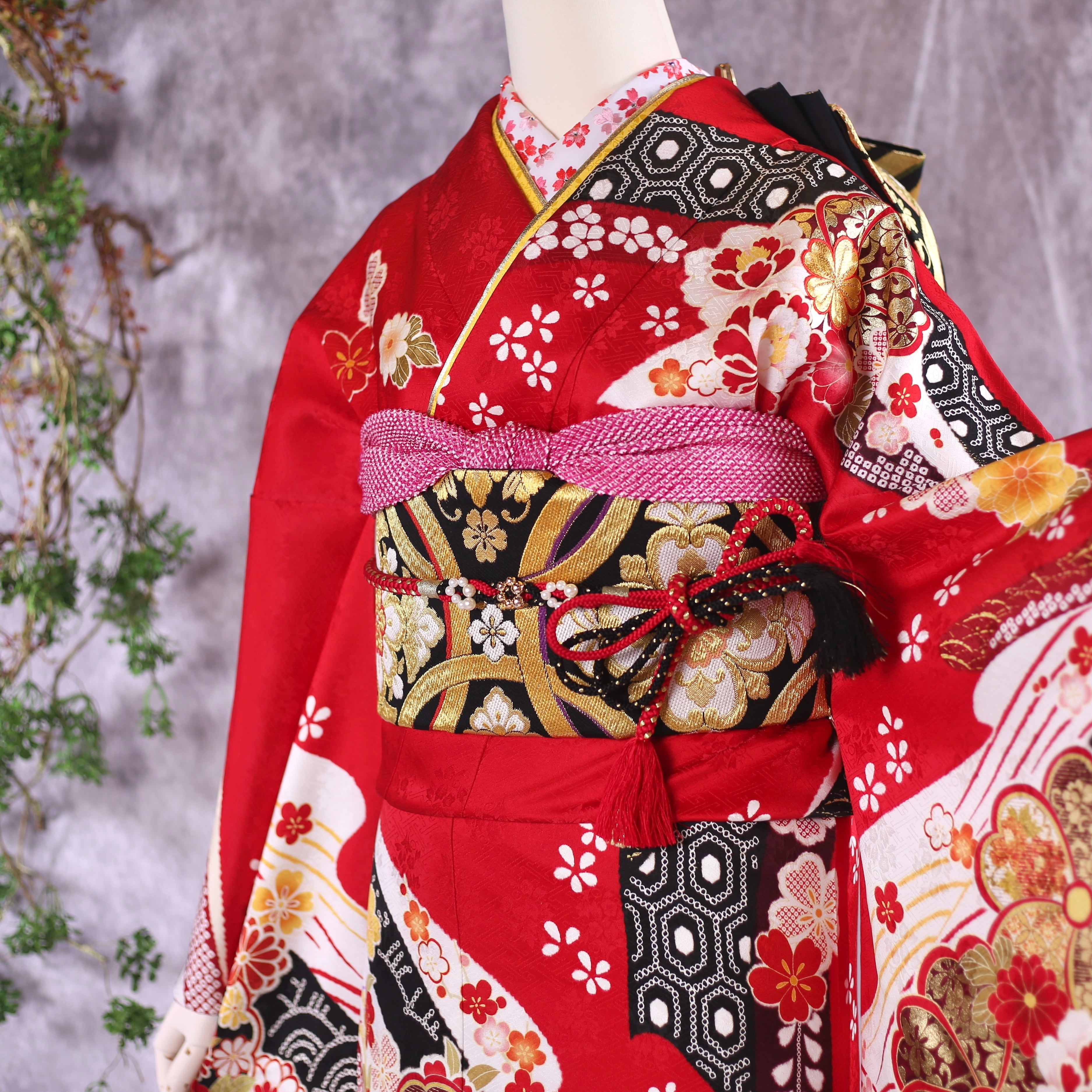 赤地に熨斗と金駒刺繍が映える古典振袖です。