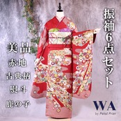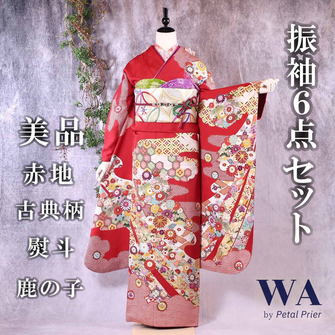 振袖フルセット 振袖セット 振袖 M〜Lサイズ 赤×古典 美品 成人式 着物 晴れ着 6点セット FN-297