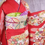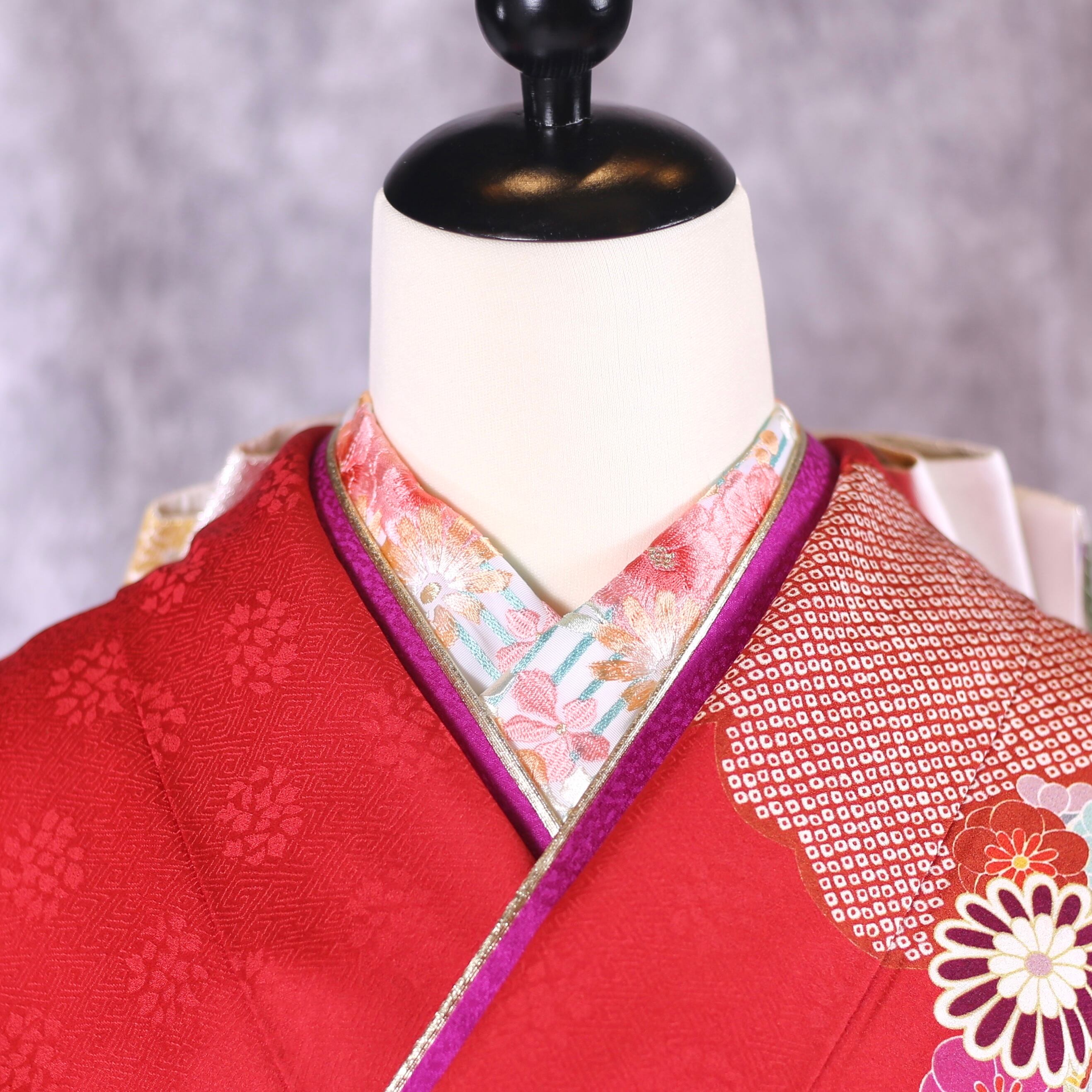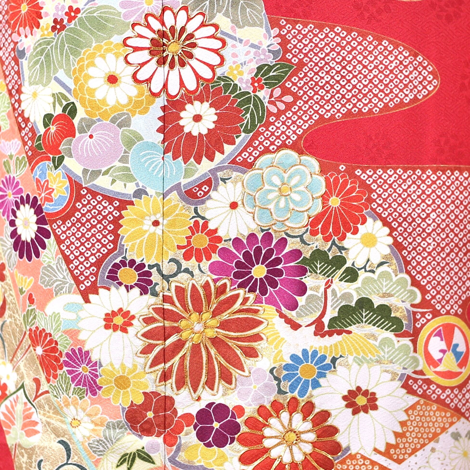 赤地に熨斗と鹿の子柄が印象的な古典振袖です。