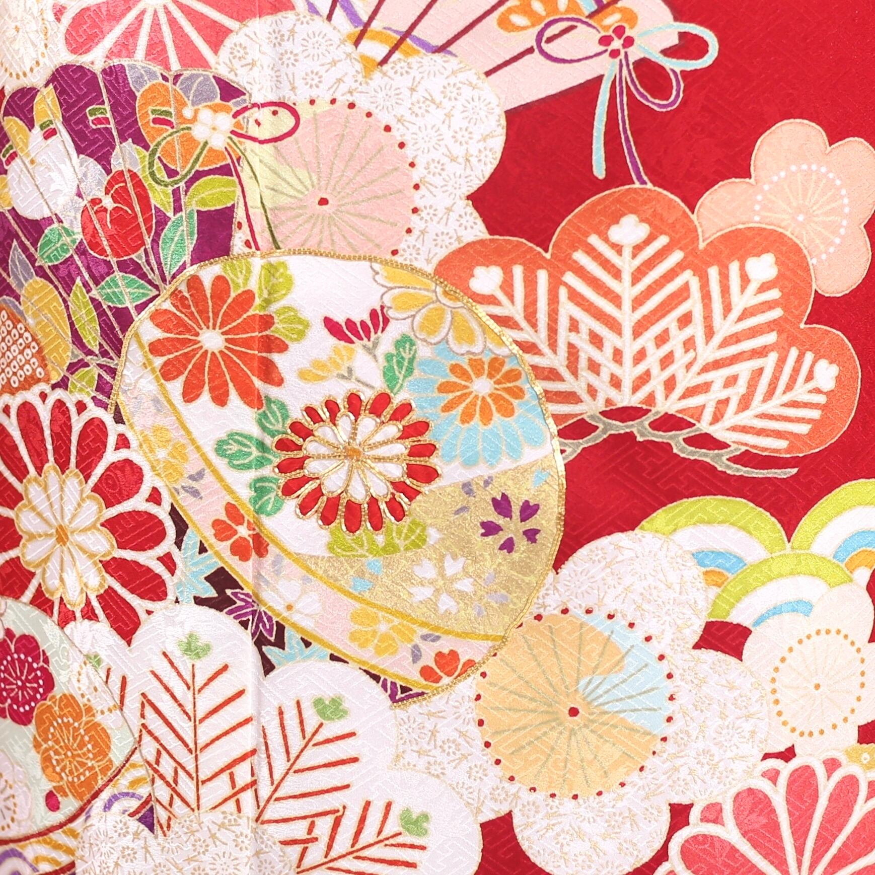 鮮やかな赤地に扇などの柄が印象的なレトロ古典振袖です。