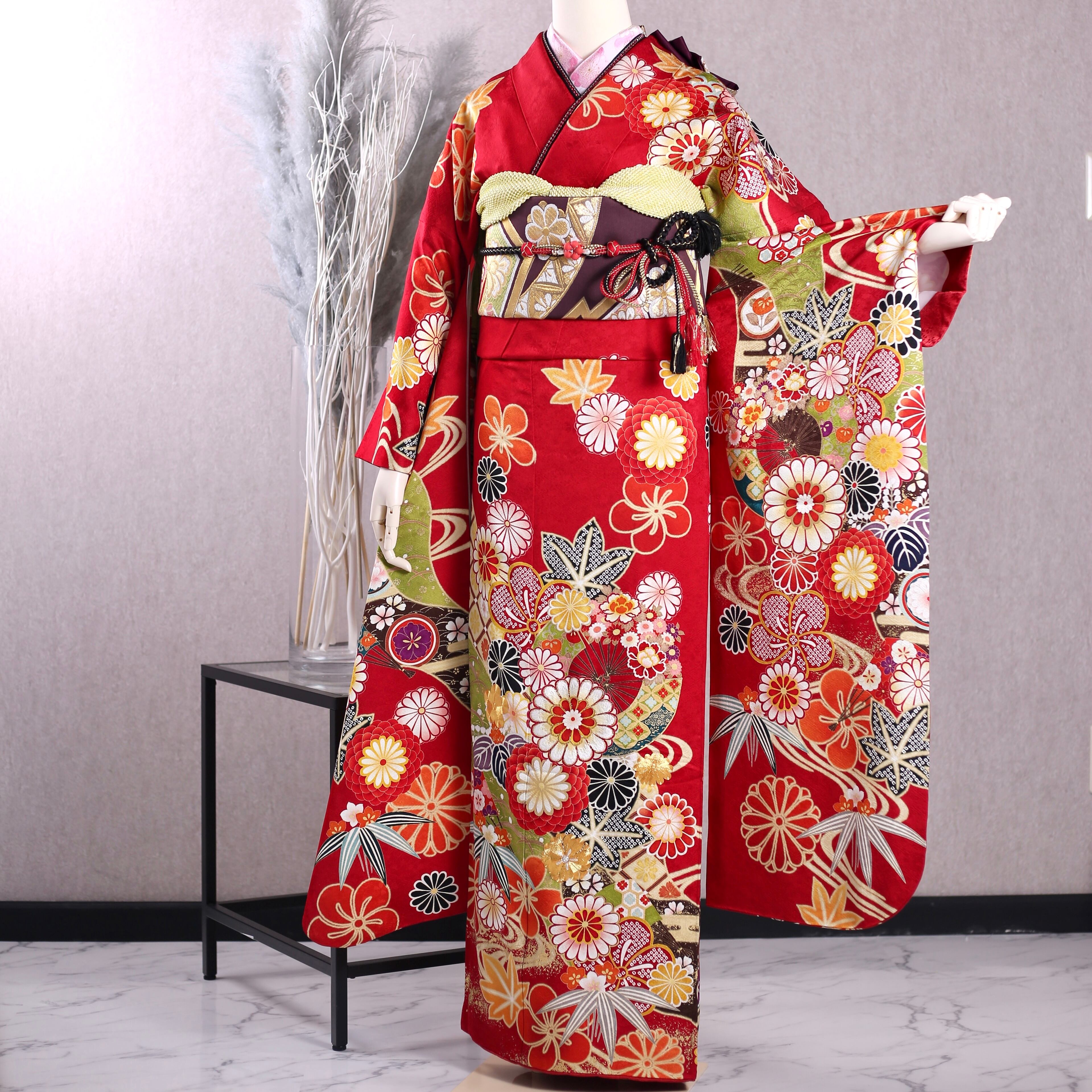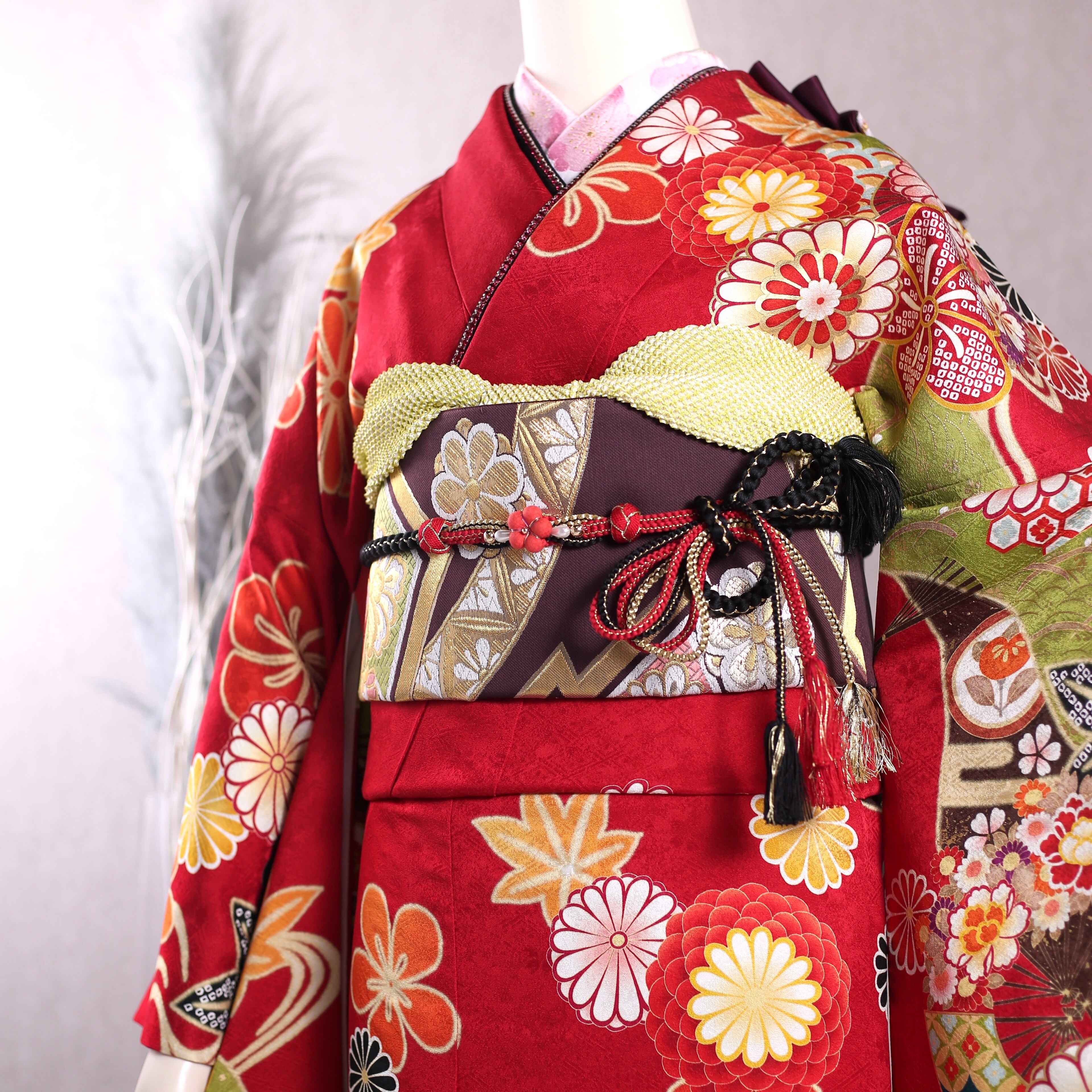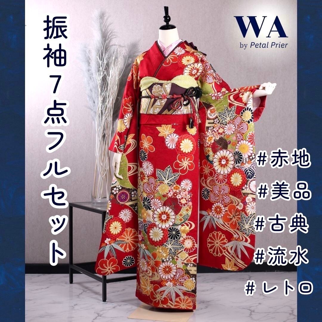 振袖フルセット 振袖セット 振袖 M〜Lサイズ 赤×レトロ 美品 成人式 着物 晴れ着 7点フルセット F-267