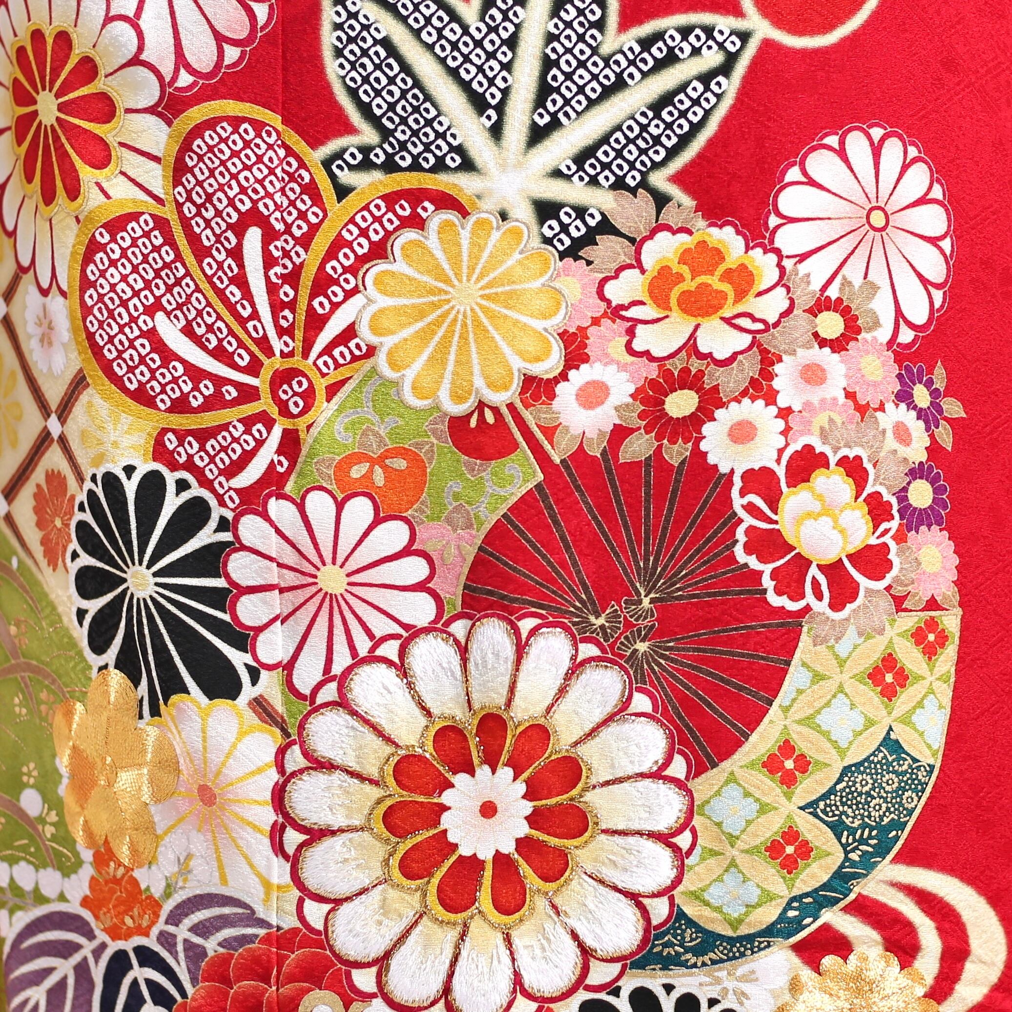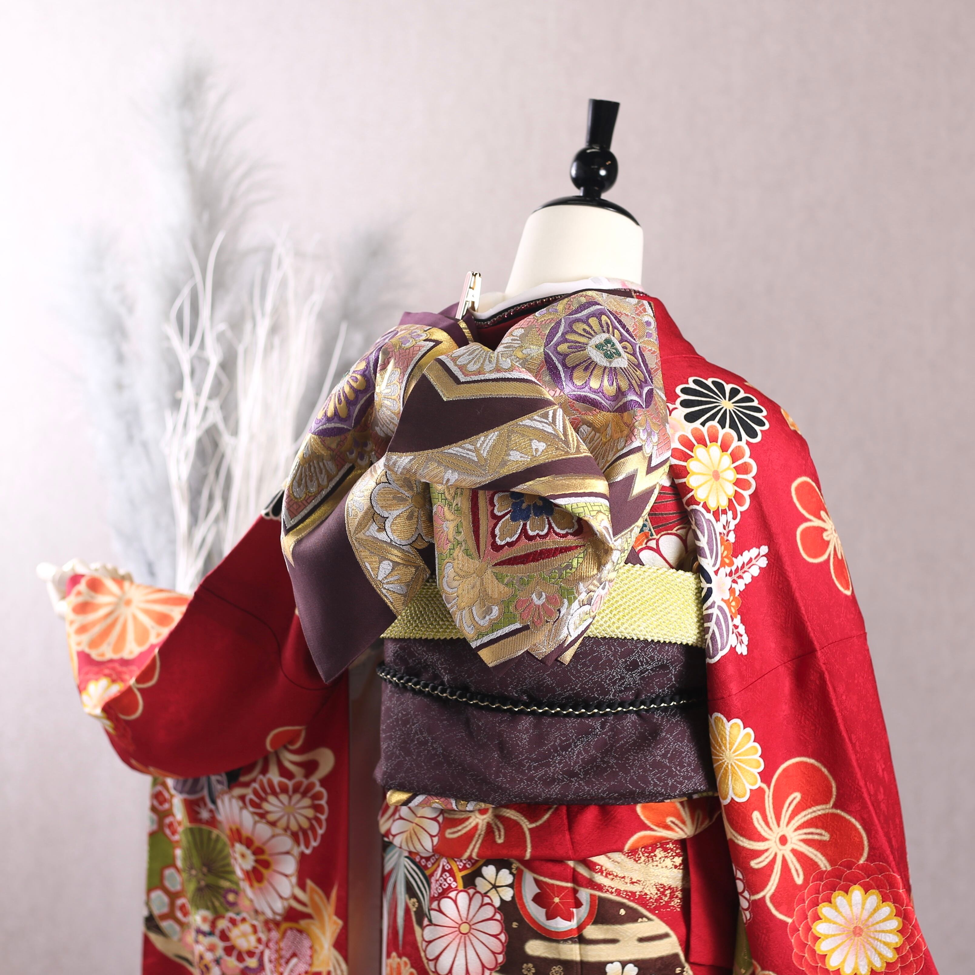 鮮やかな赤地に菊や梅などの柄が印象的なレトロ振袖です。
