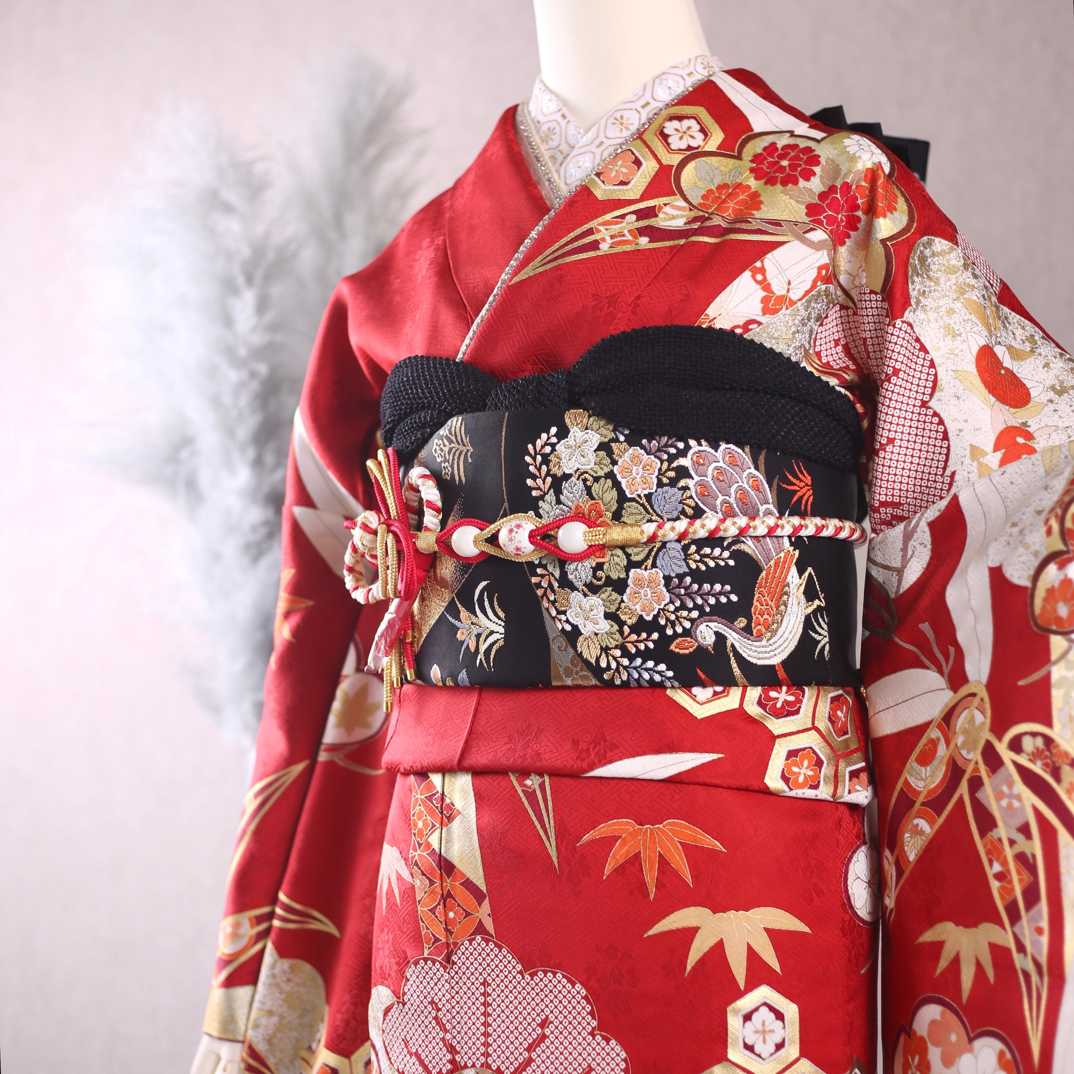 振袖フルセット 振袖セット 振袖 LLサイズ 赤×レトロ古典 美品 成人式 着物 晴れ着 7点フルセット F-290