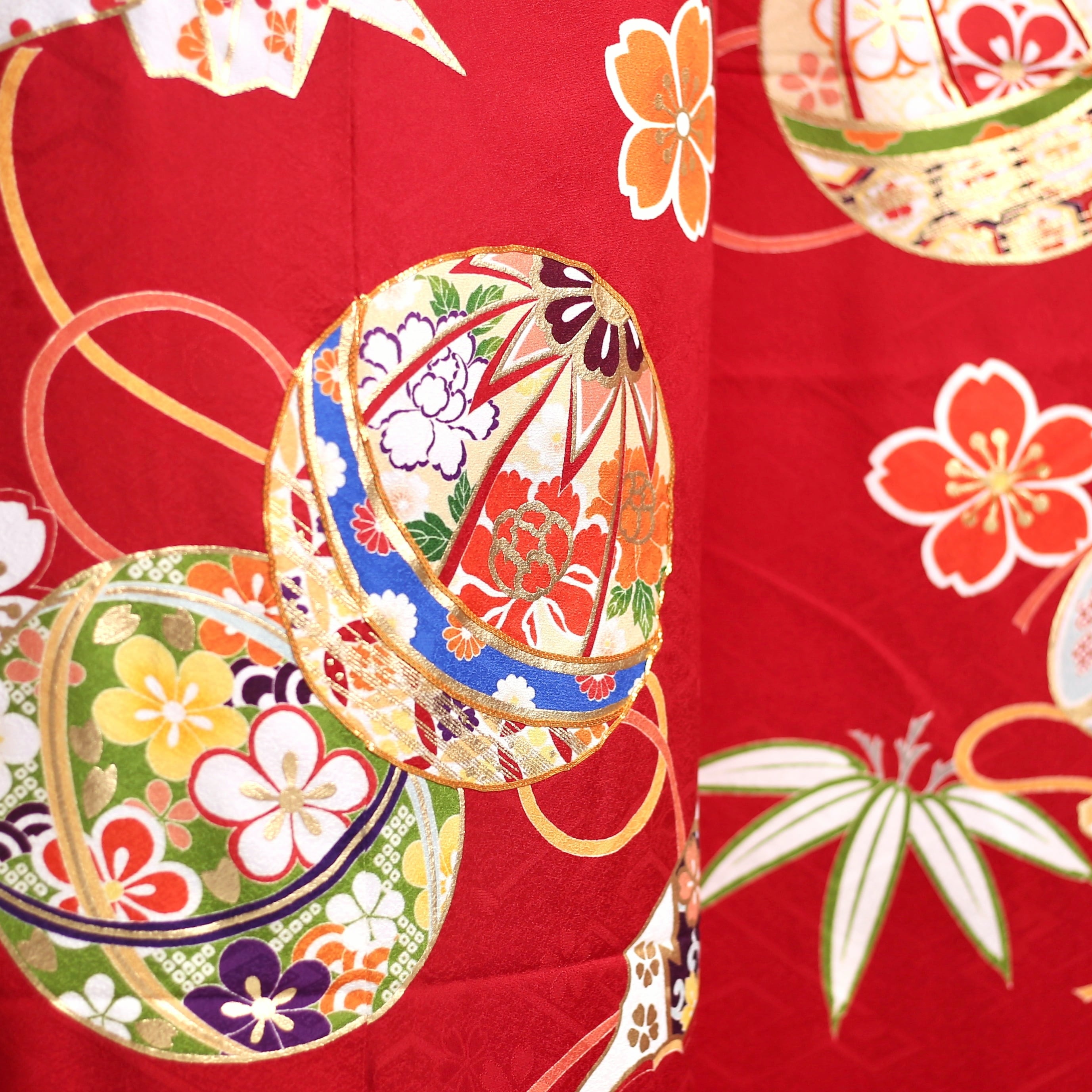 赤地に鞠などの柄が印象的なシンプルな振袖です。
