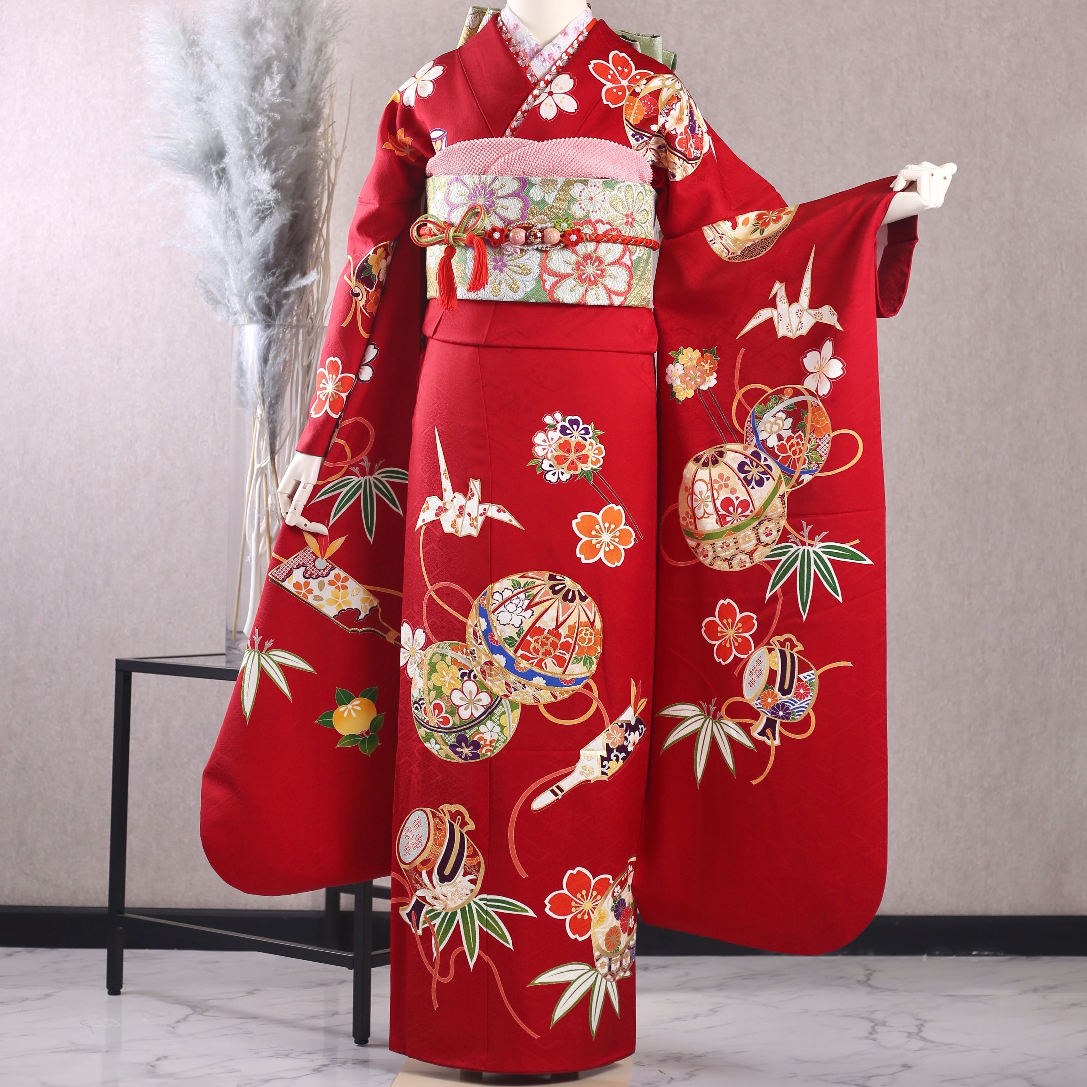 振袖フルセット 振袖セット 振袖 LLサイズ 赤×鞠 美品 成人式 着物 晴れ着 7点フルセット F-285