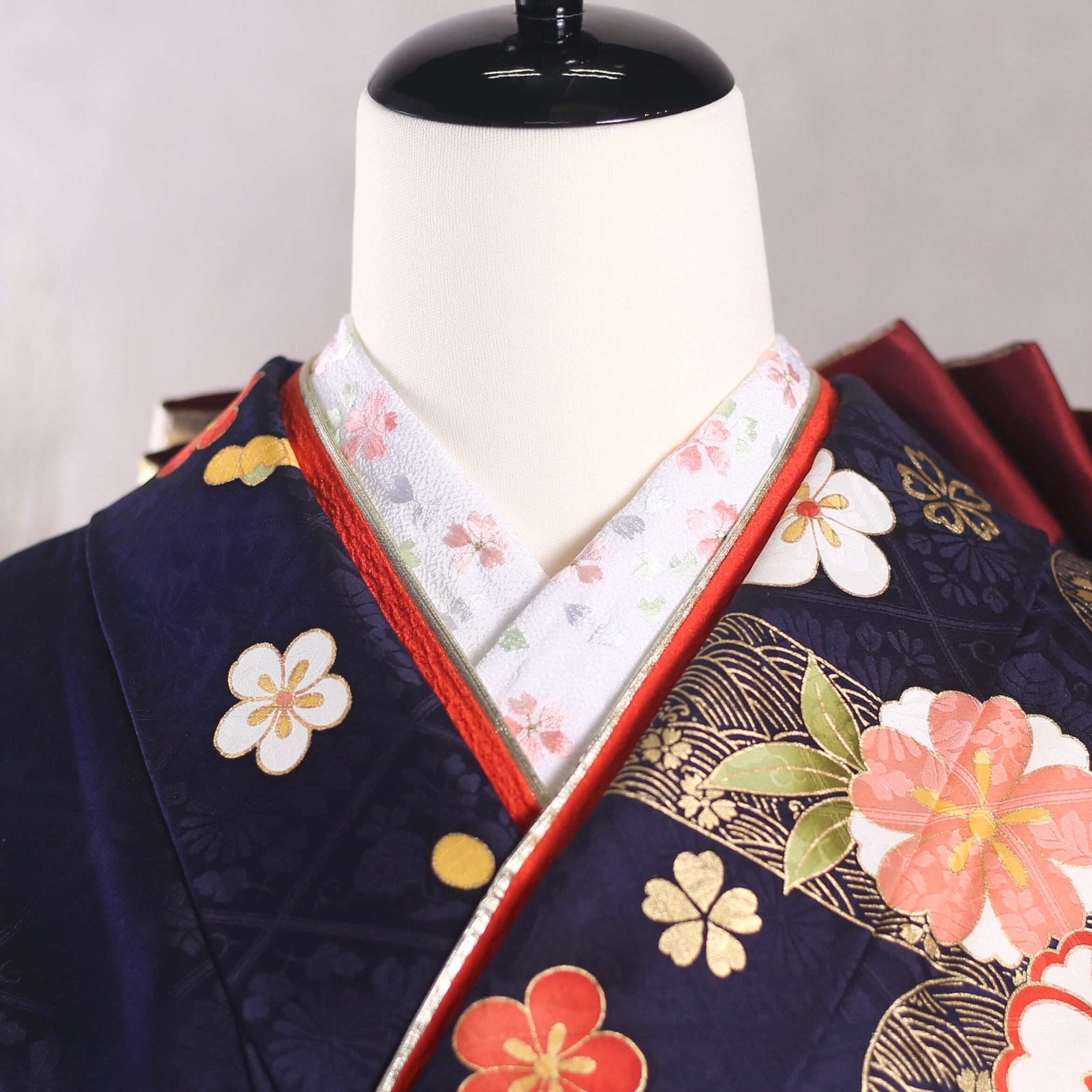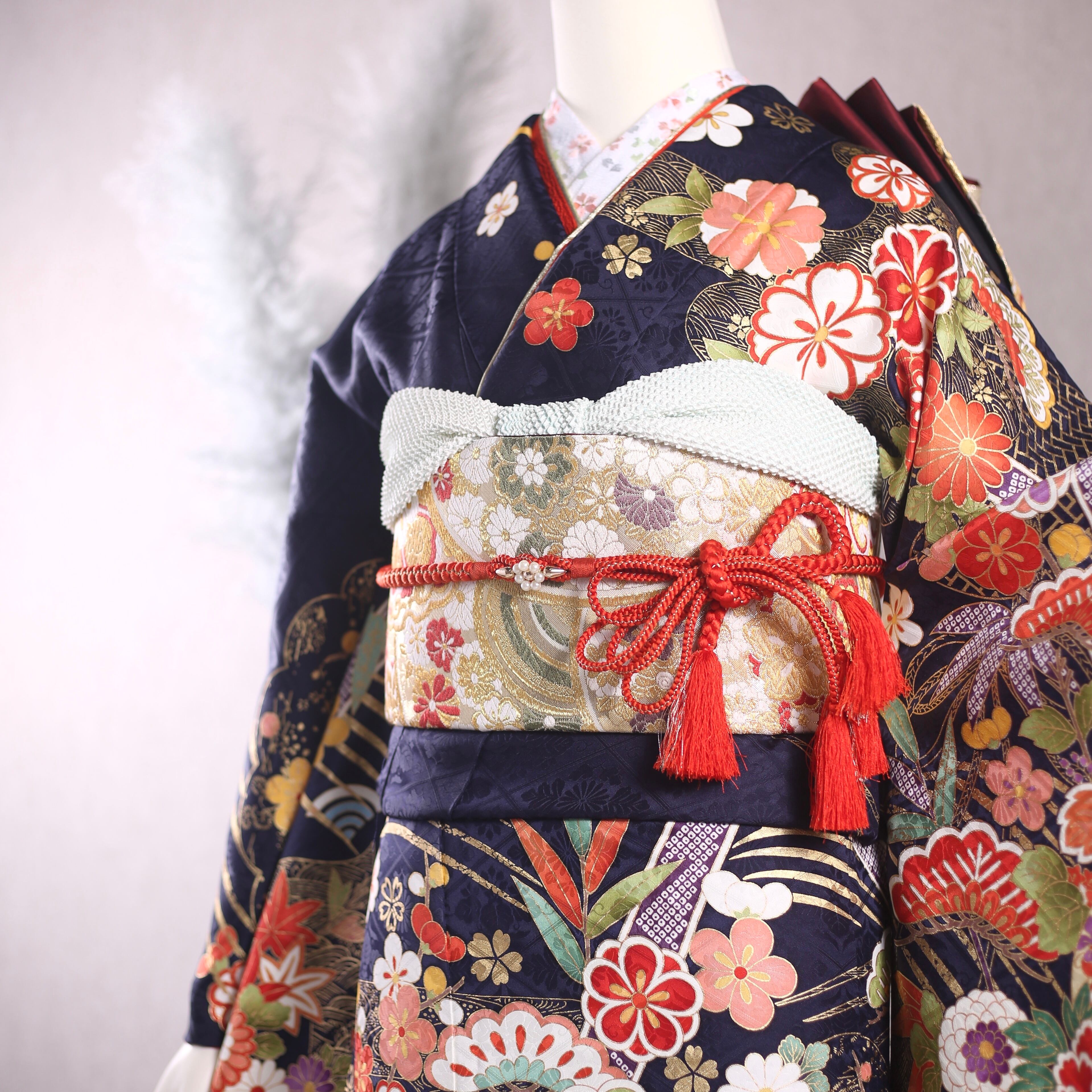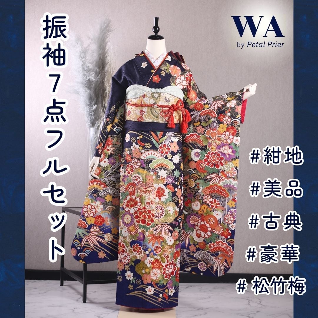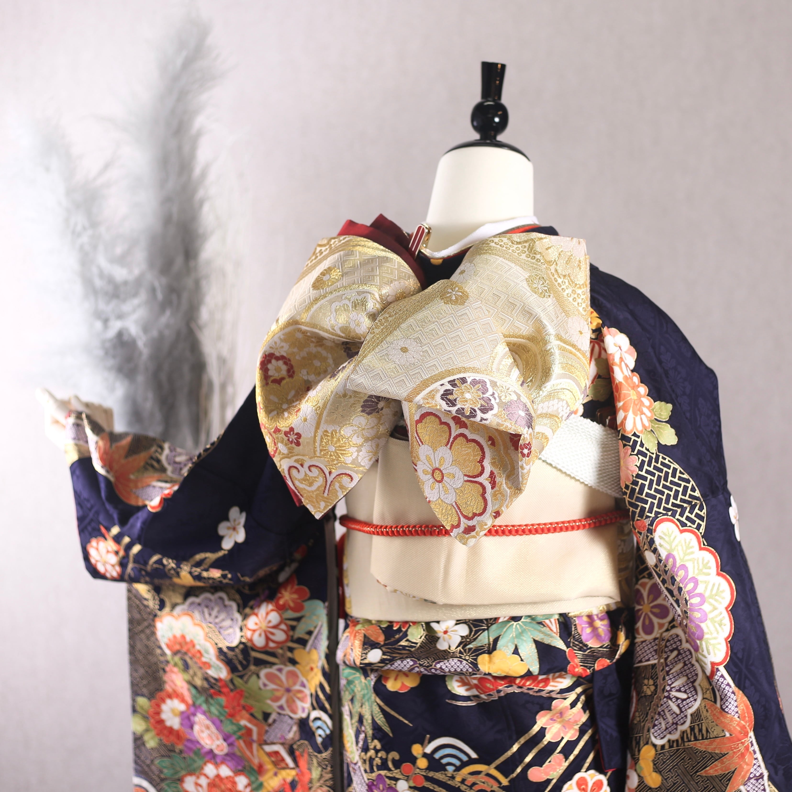振袖フルセット 振袖セット 振袖 Lサイズ 紺×古典 美品 成人式 着物 晴れ着 7点フルセット KF-125