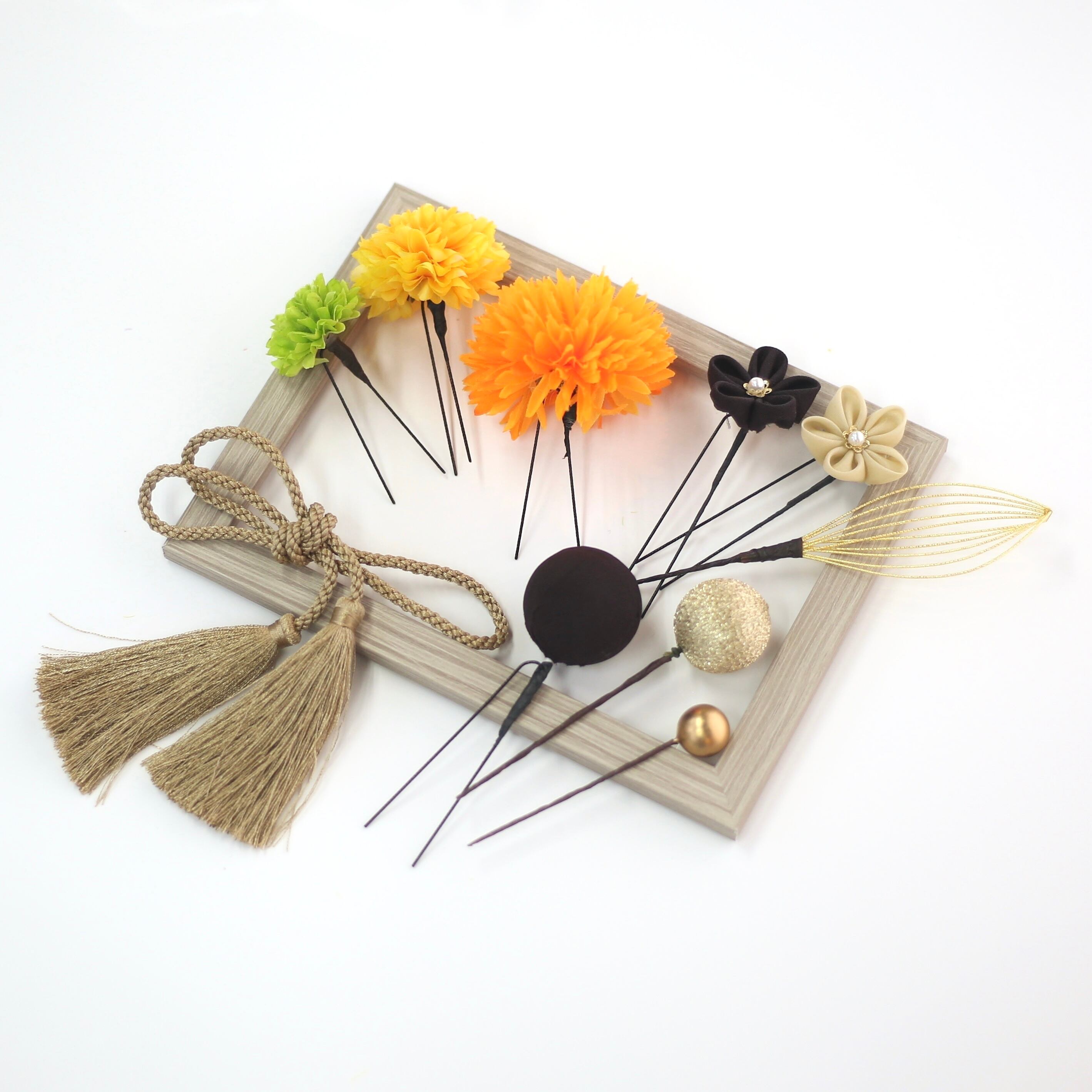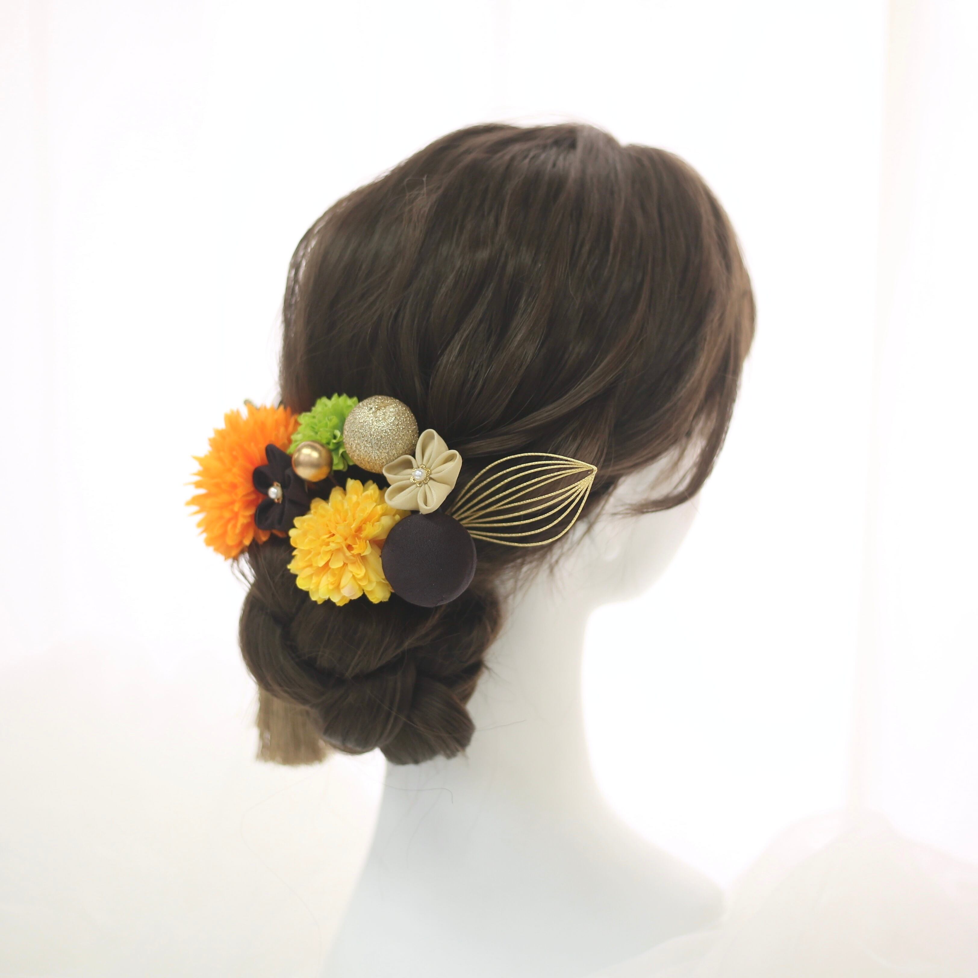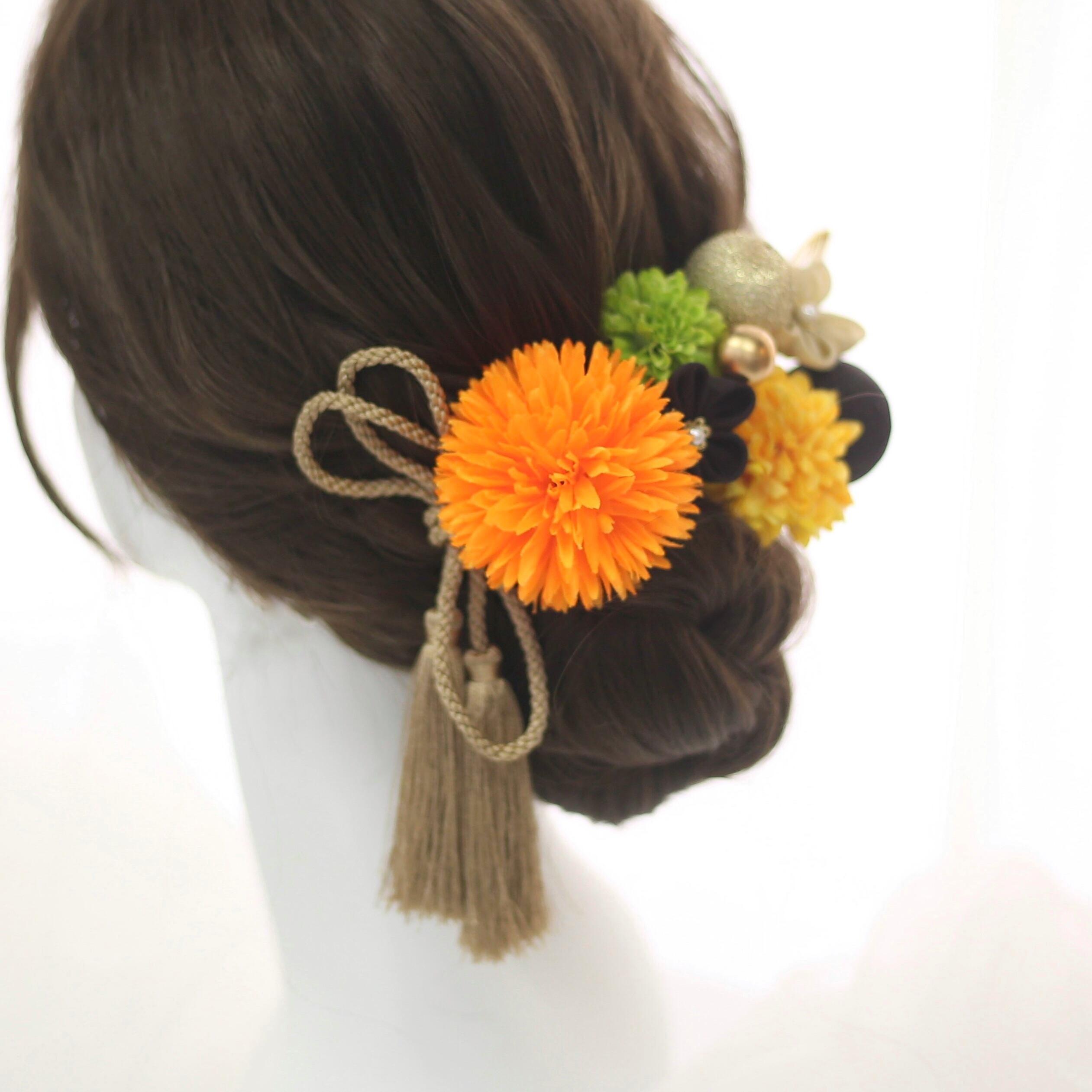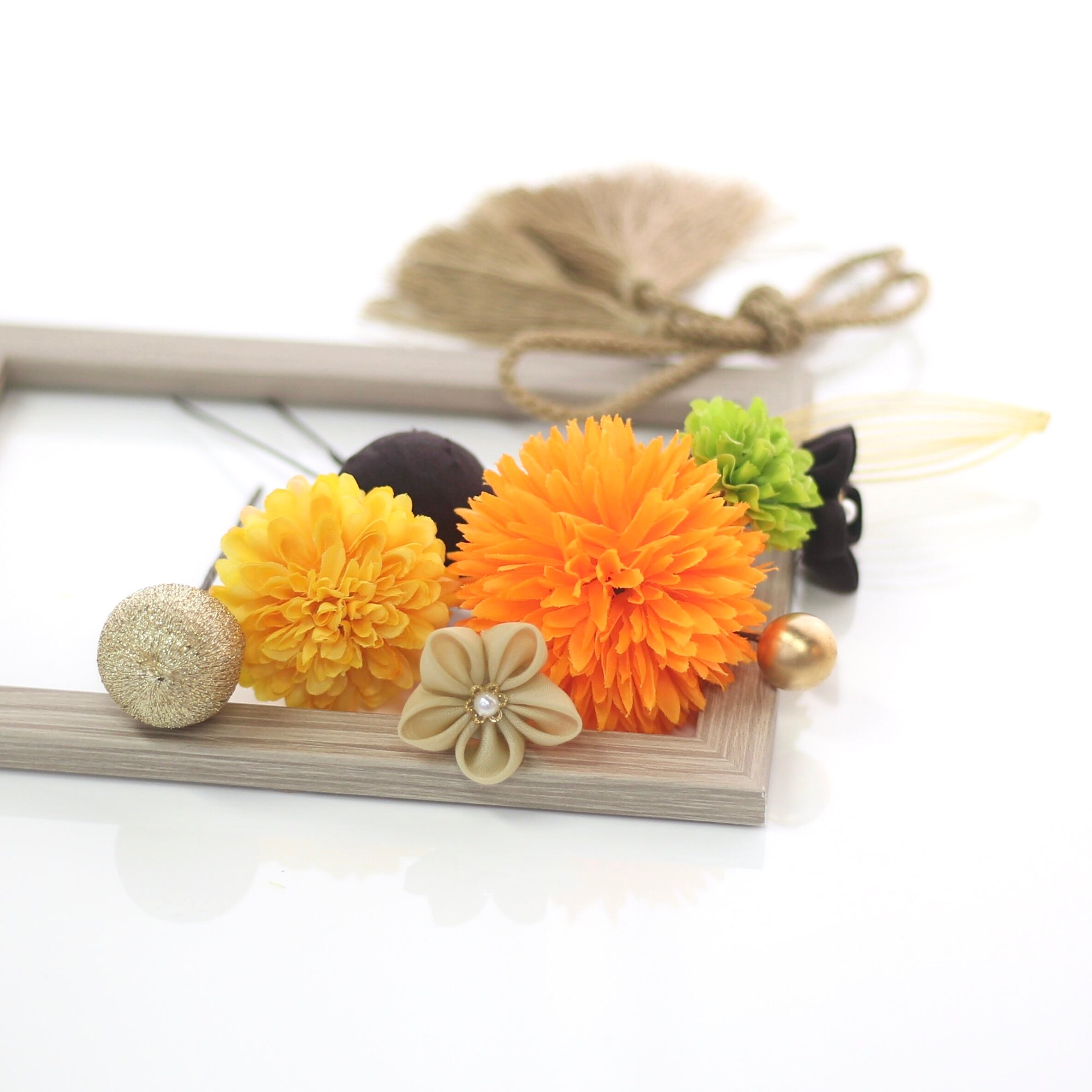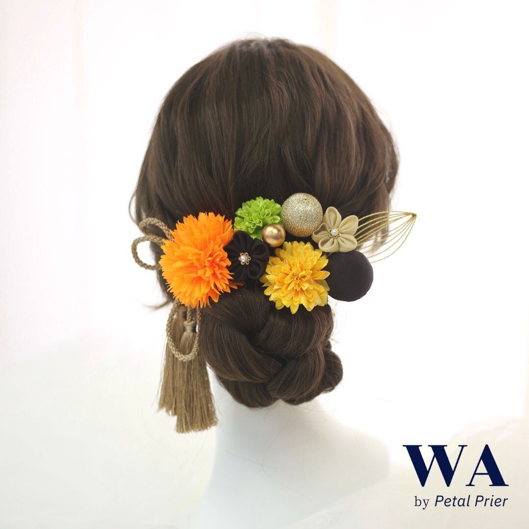 髪飾り 髪飾りセット 成人式 振袖 結婚式 ブライダル ヘッドドレス 卒業式 七五三 前撮り オレンジ 黄色 イエロー 茶色 ブラウン ゴールド ピンポンマム つまみ細工 水引 タッセル パール K-103 | WA by Petal Prier