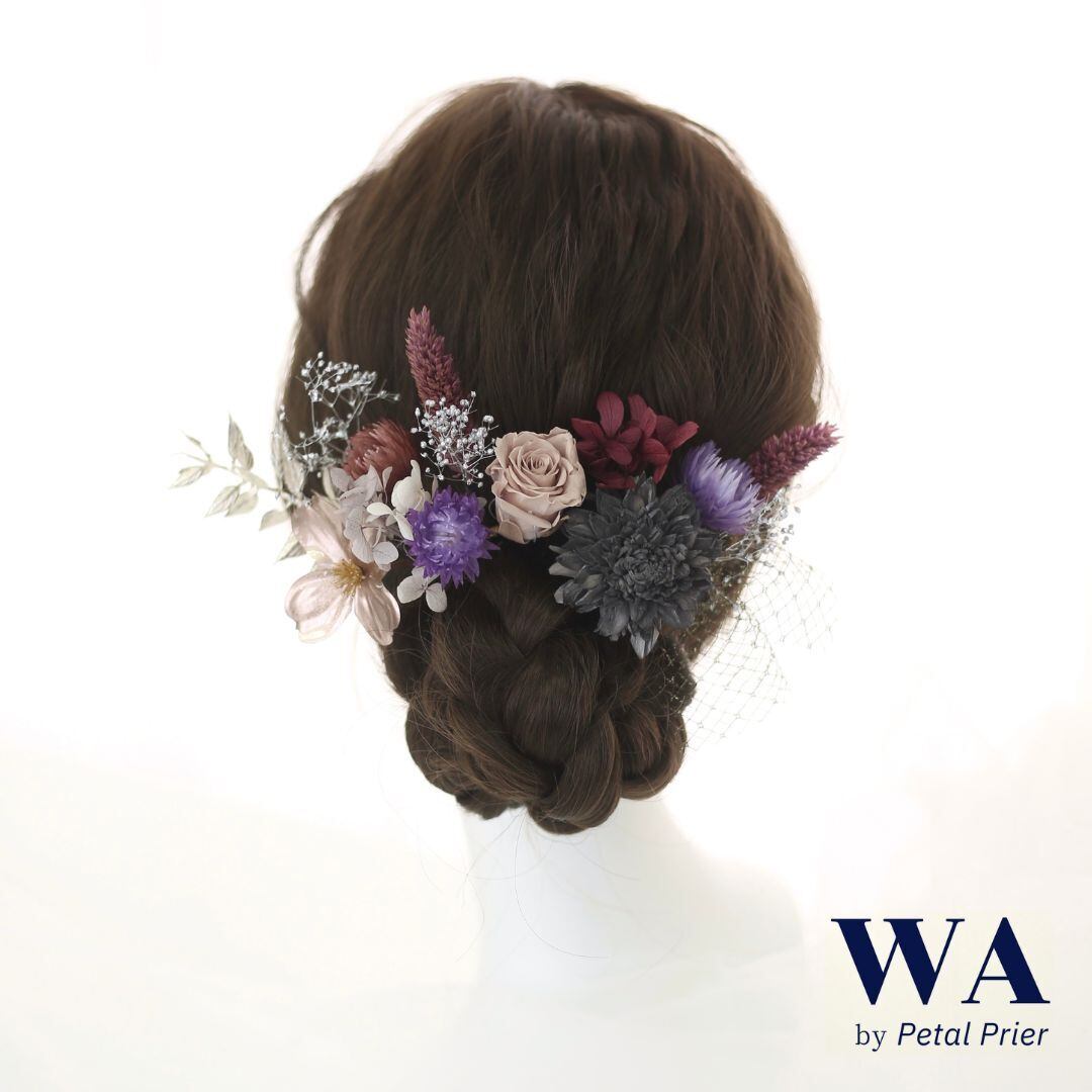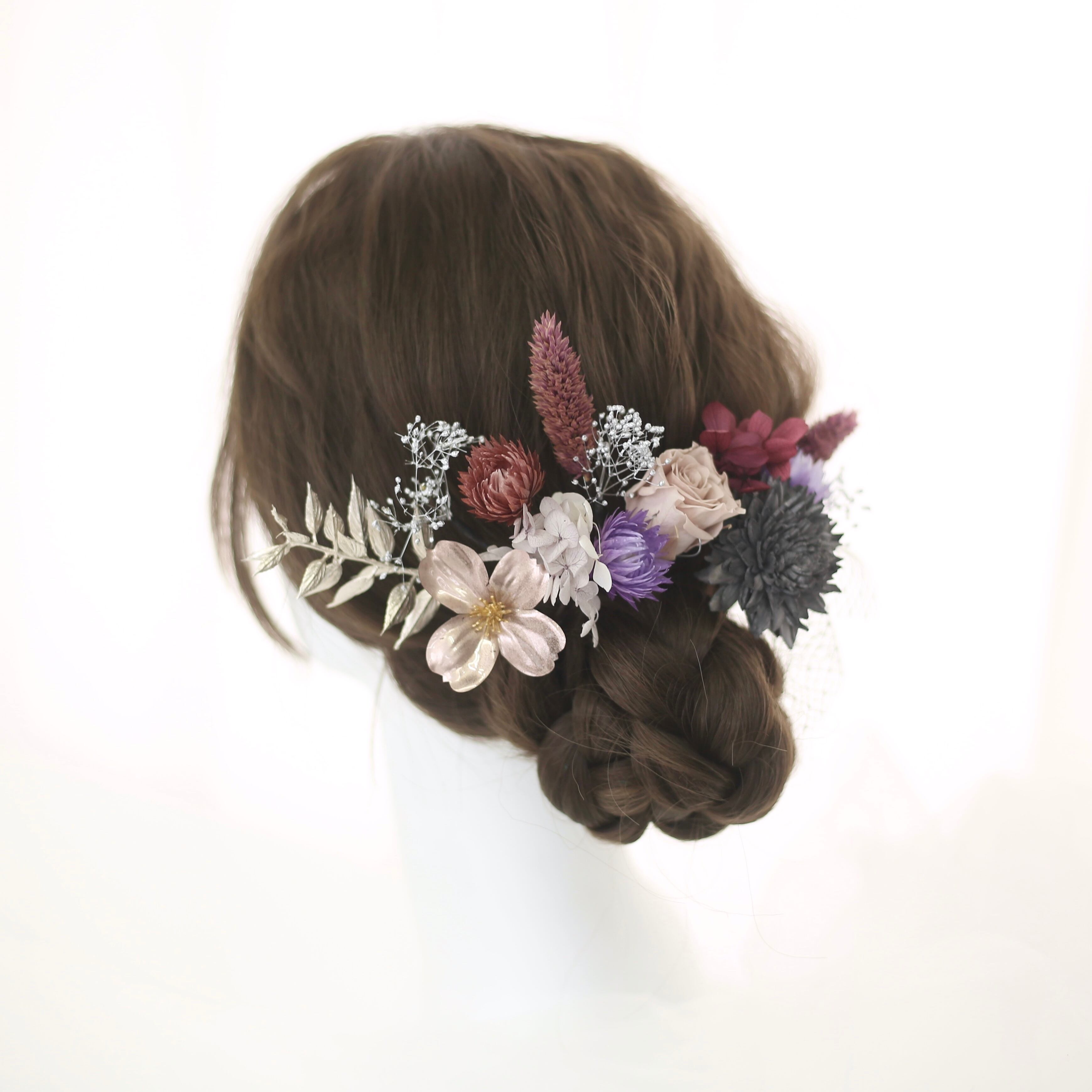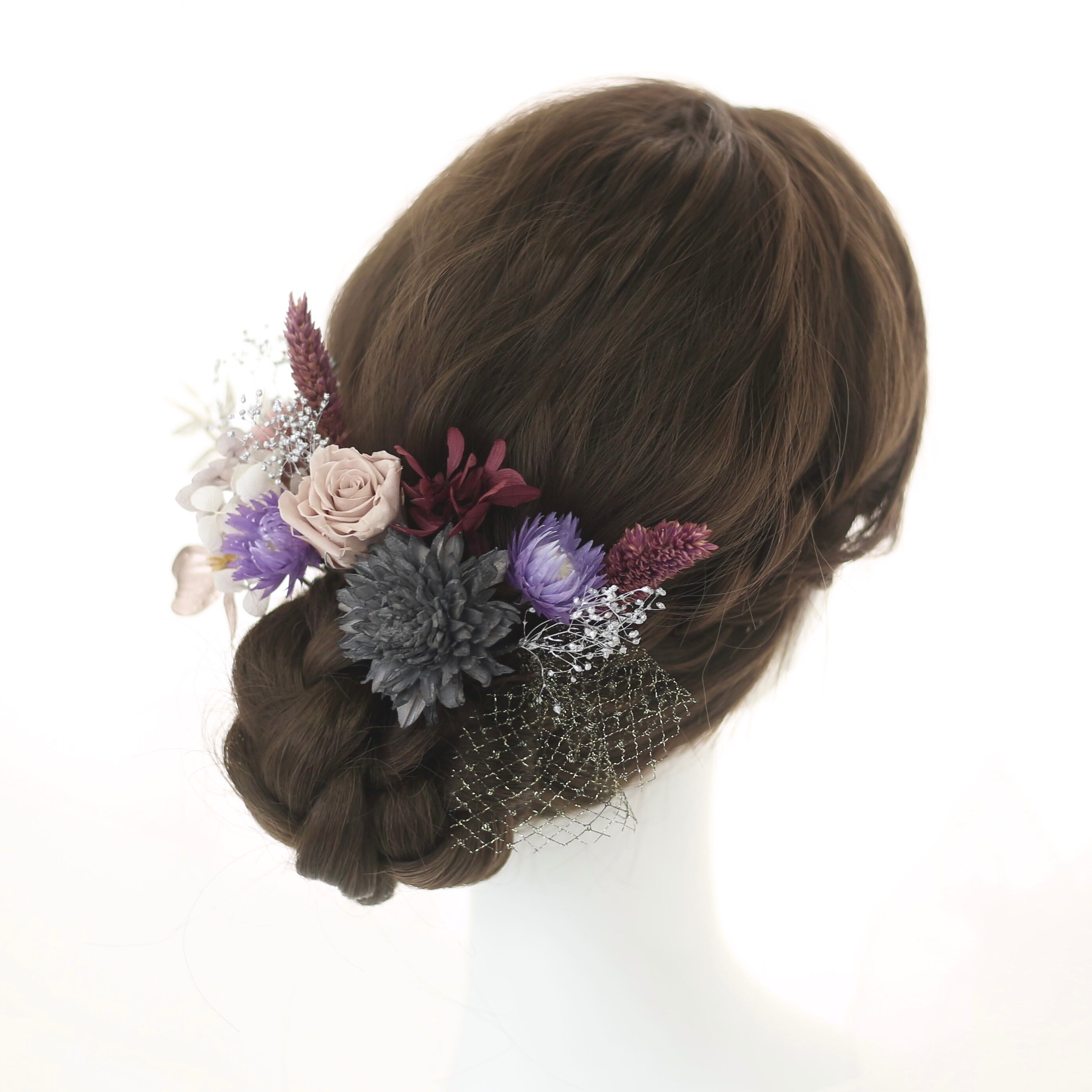 髪飾り 髪飾りセット 成人式 振袖 結婚式 ブライダル ヘッドドレス 卒業式 七五三 前撮り 紫 パープル 赤 レッド 黒 ブラック ピンク ゴールド バラ あじさい カスミソウ レース リボン ドライフラワー K-114 | WA by Petal Prier