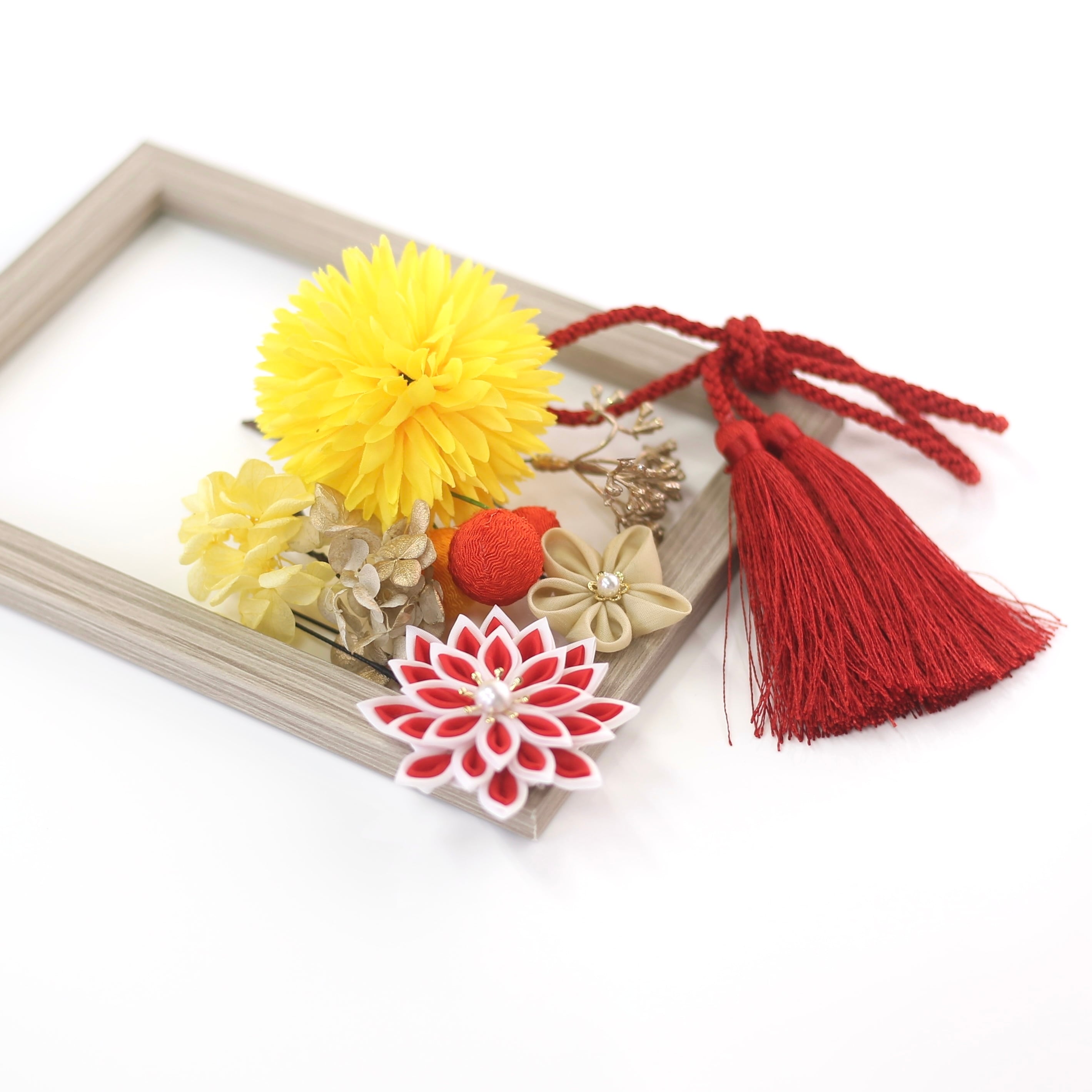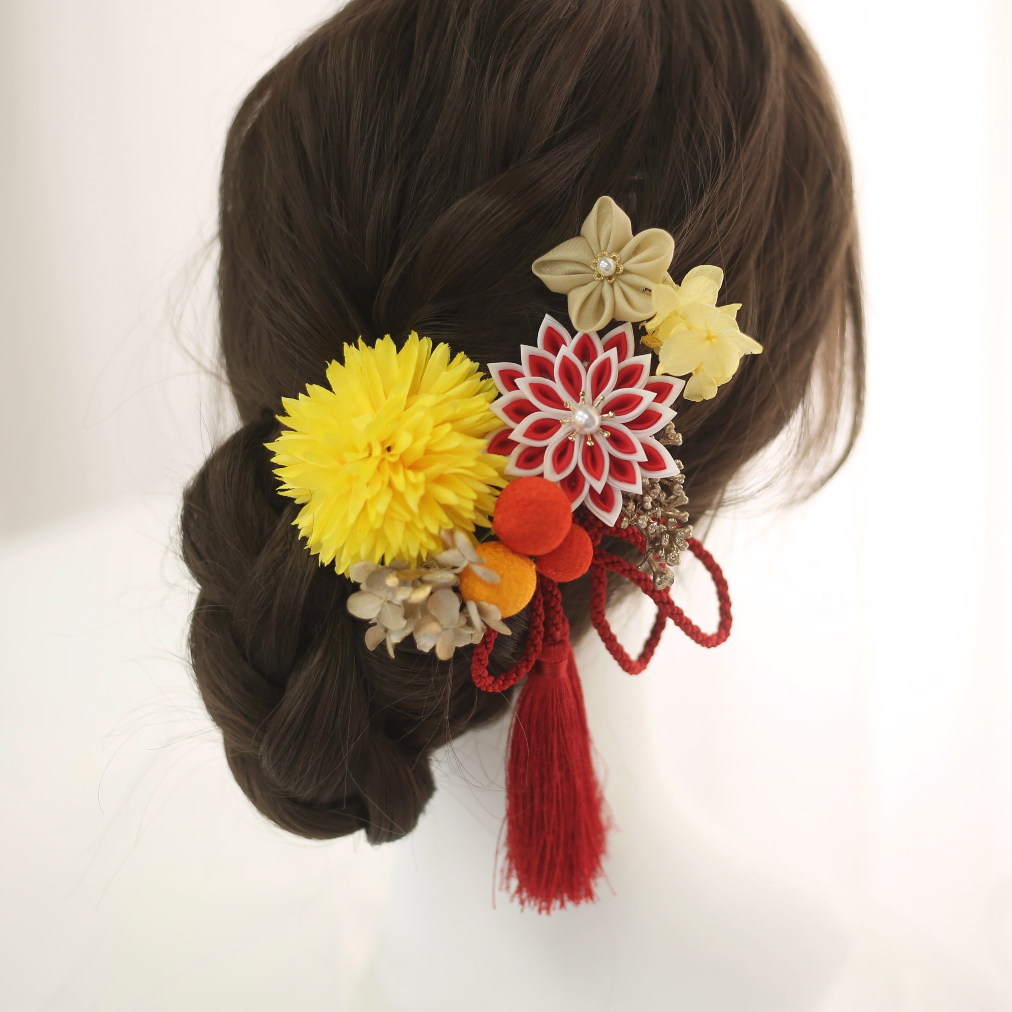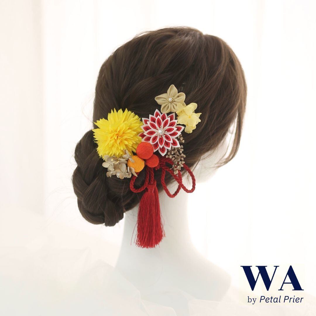 髪飾り 髪飾りセット 成人式 振袖 結婚式 ブライダル ヘッドドレス 卒業式 七五三 前撮り 赤 レッド 黄色 イエロー オレンジ あじさい つまみ細工 タッセル ドライフラワー K-124 | WA by Petal Prier