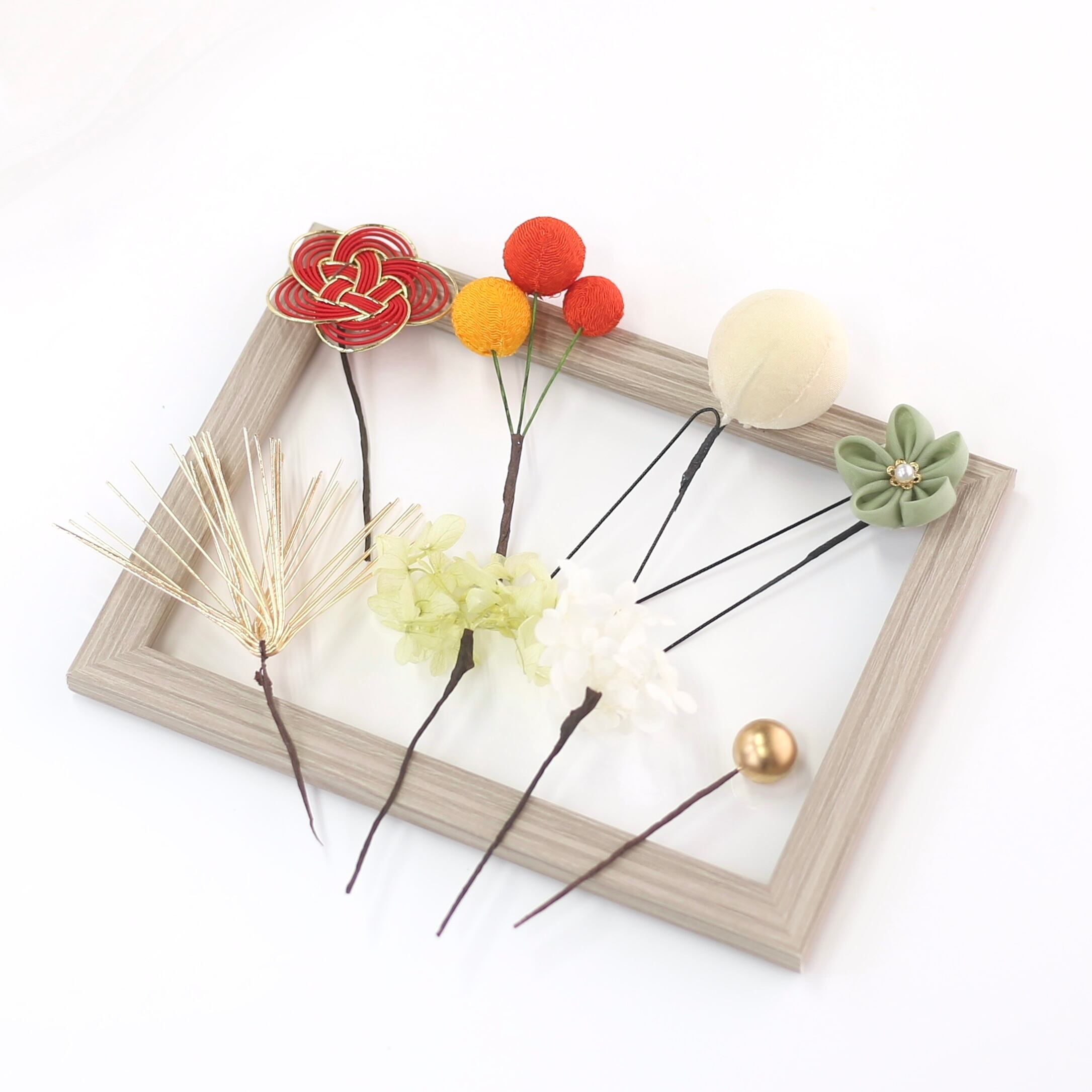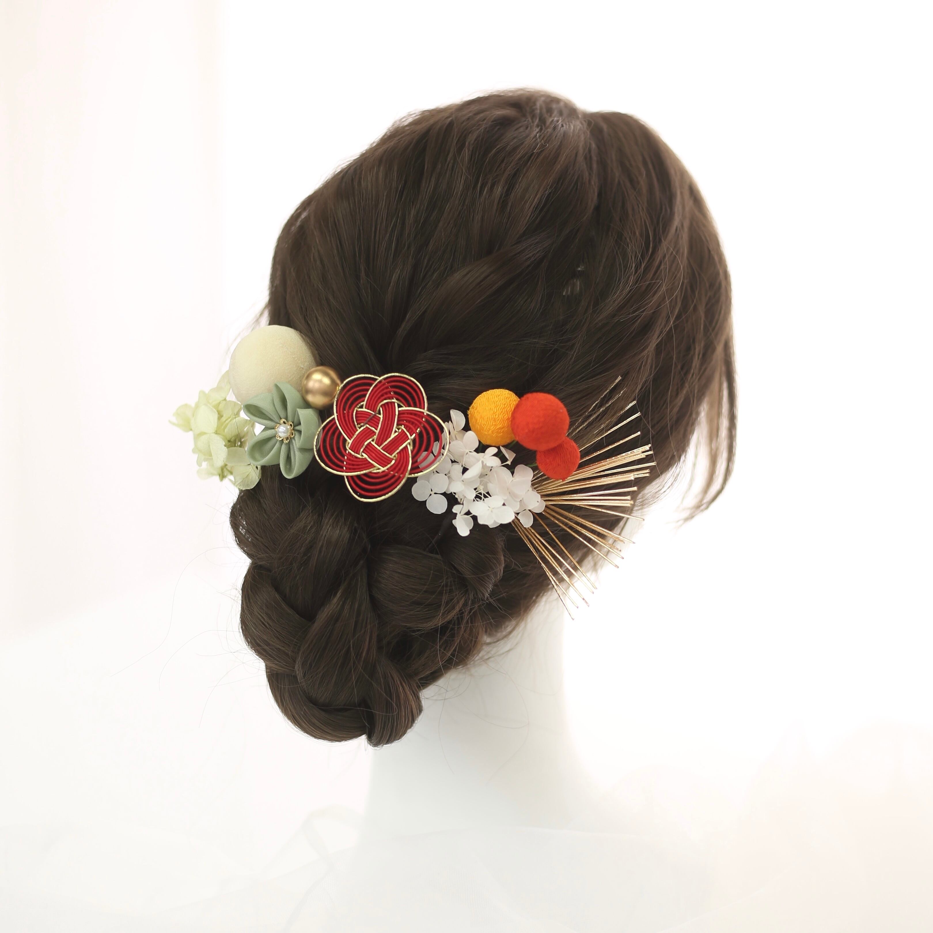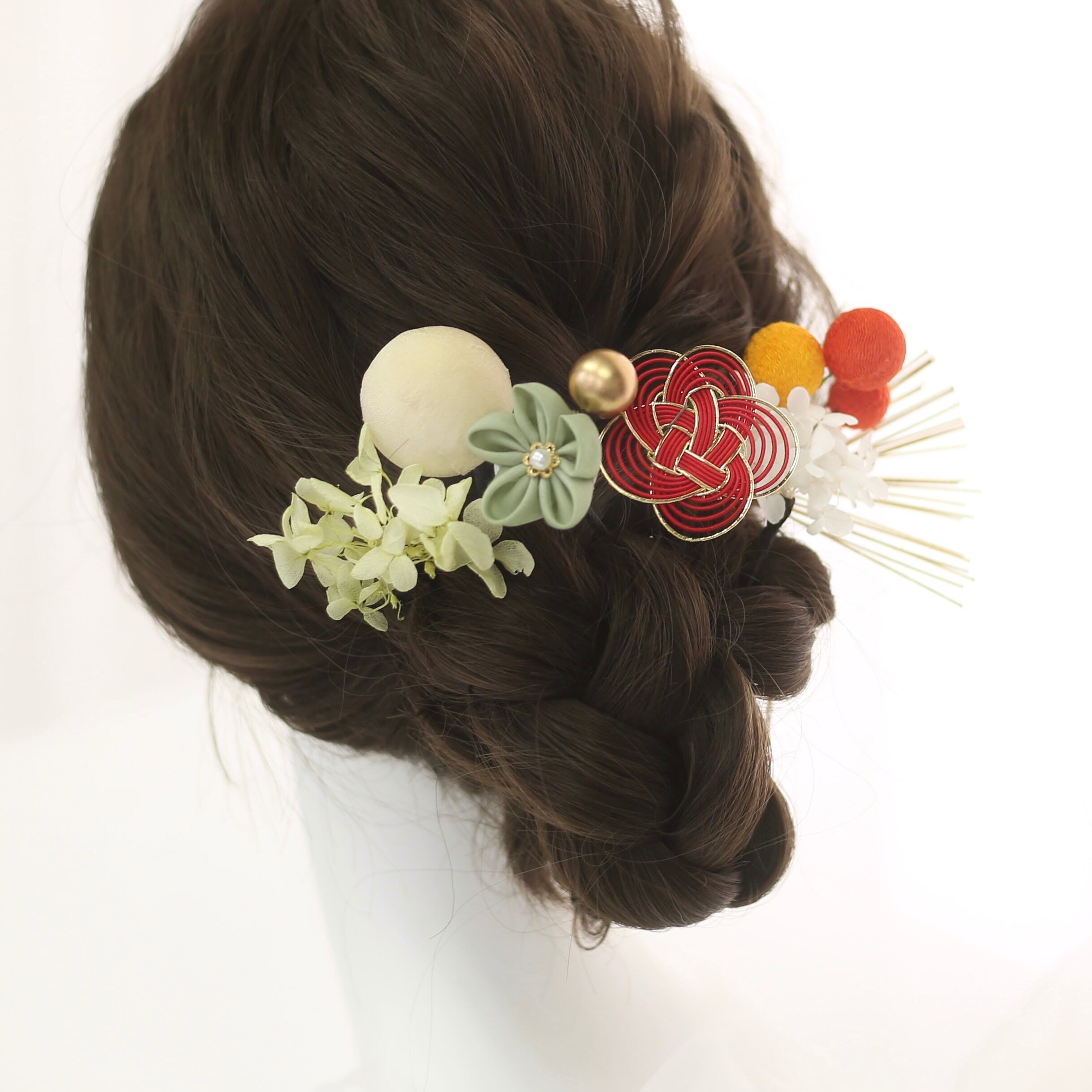 髪飾り 髪飾りセット 成人式 振袖 結婚式 ブライダル ヘッドドレス 卒業式 七五三 前撮り 緑 グリーン 赤 レッド あじさい 水引 つまみ細工 パール ドライフラワー K-122 | WA by Petal Prier