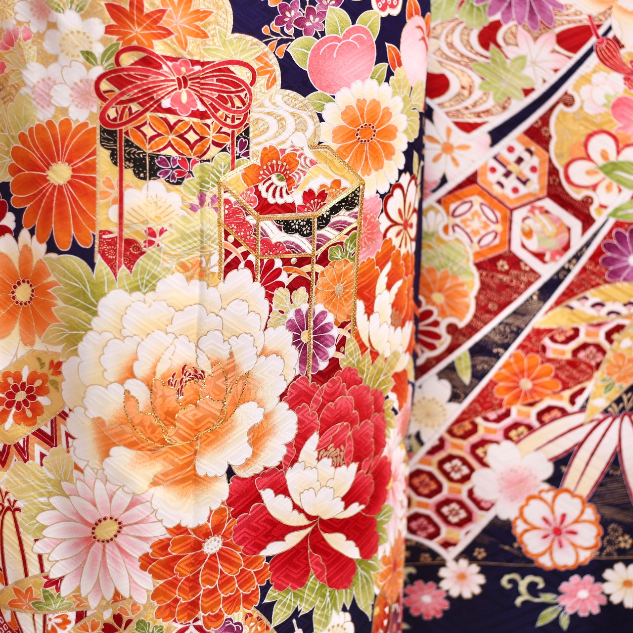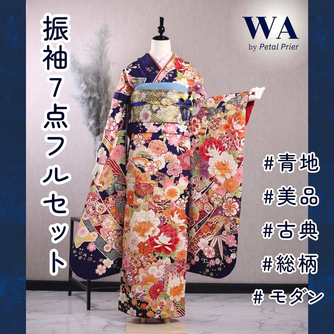 振袖フルセット 振袖セット 振袖 Lサイズ 青×モダン 美品 成人式 着物 晴れ着 7点フルセット KF-149