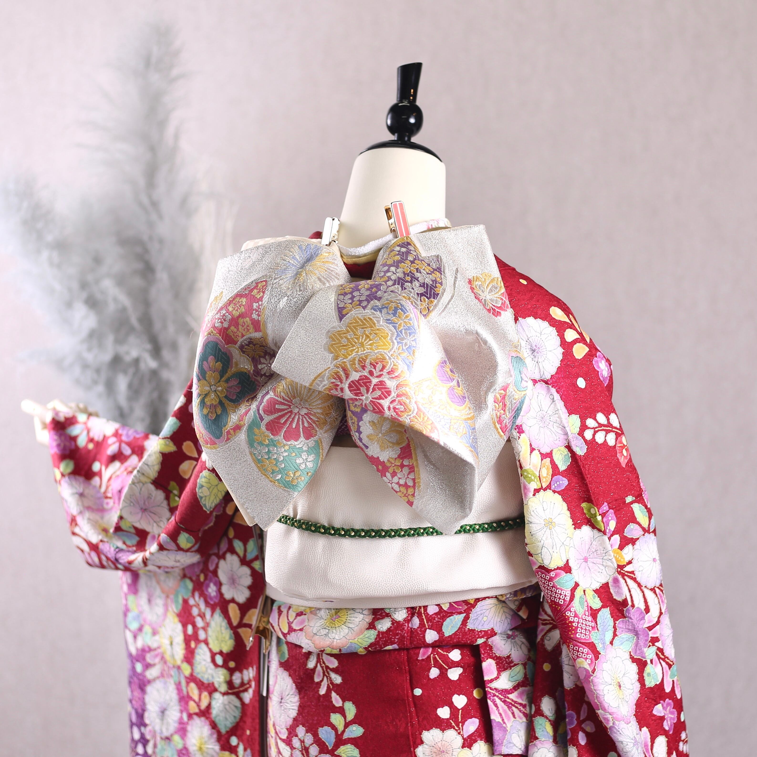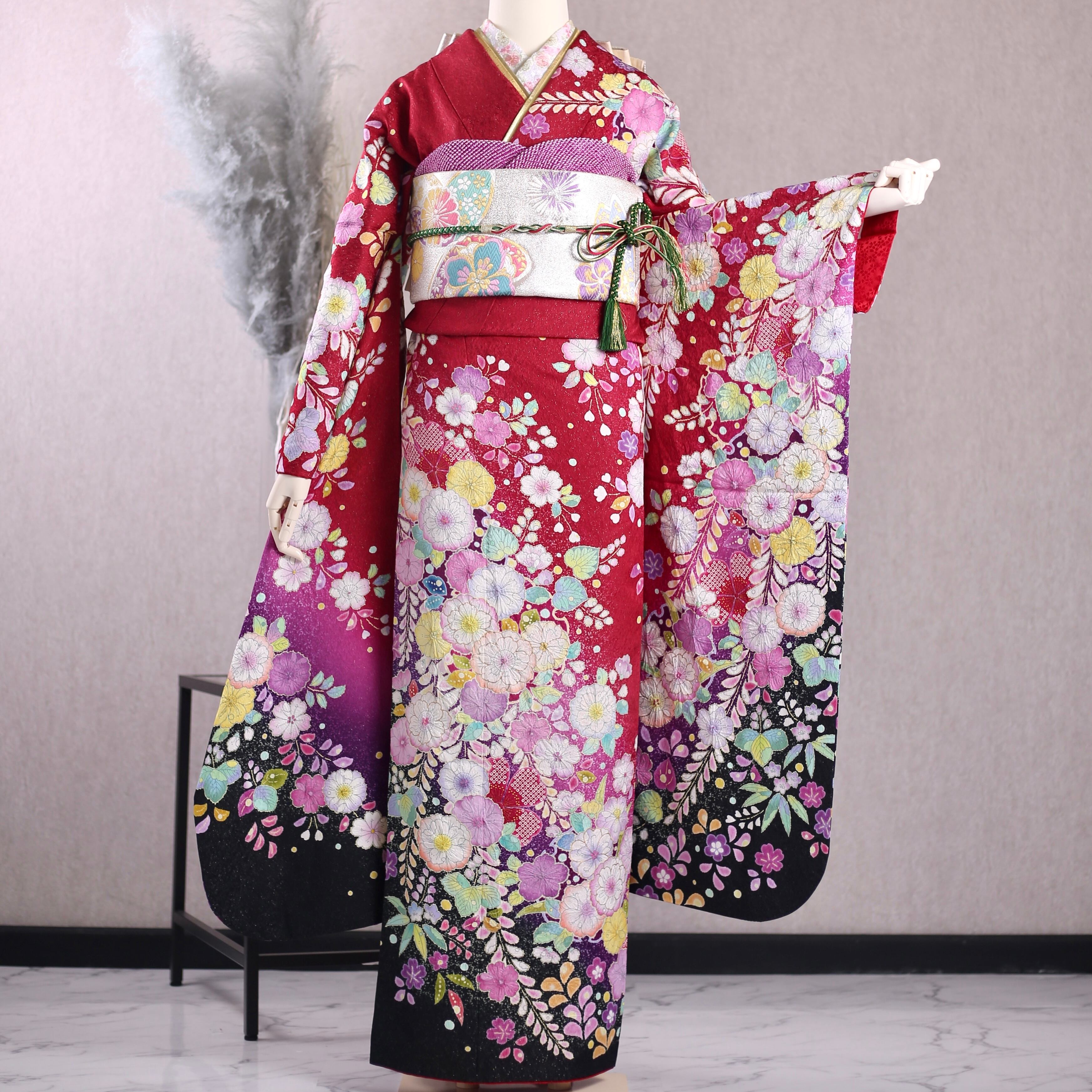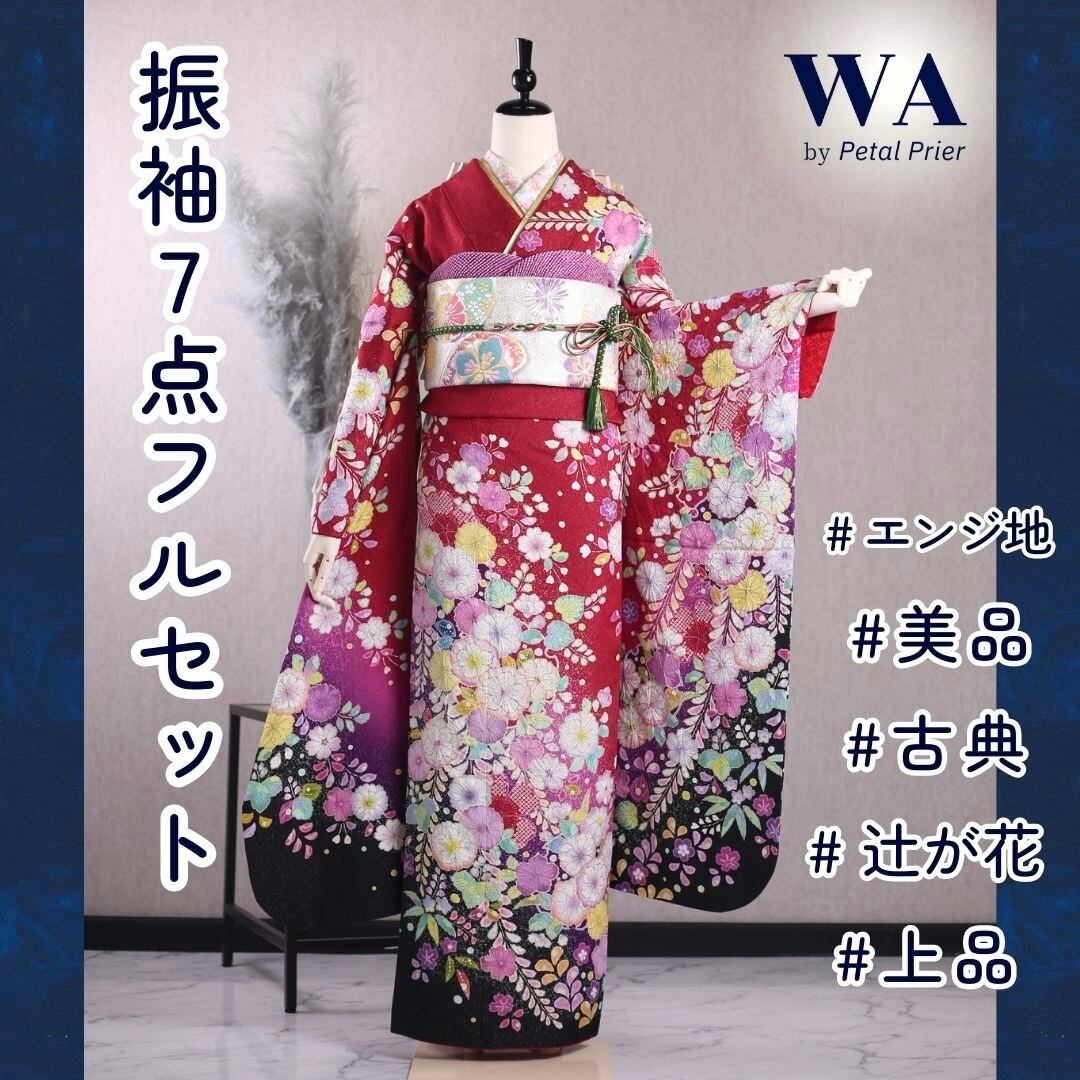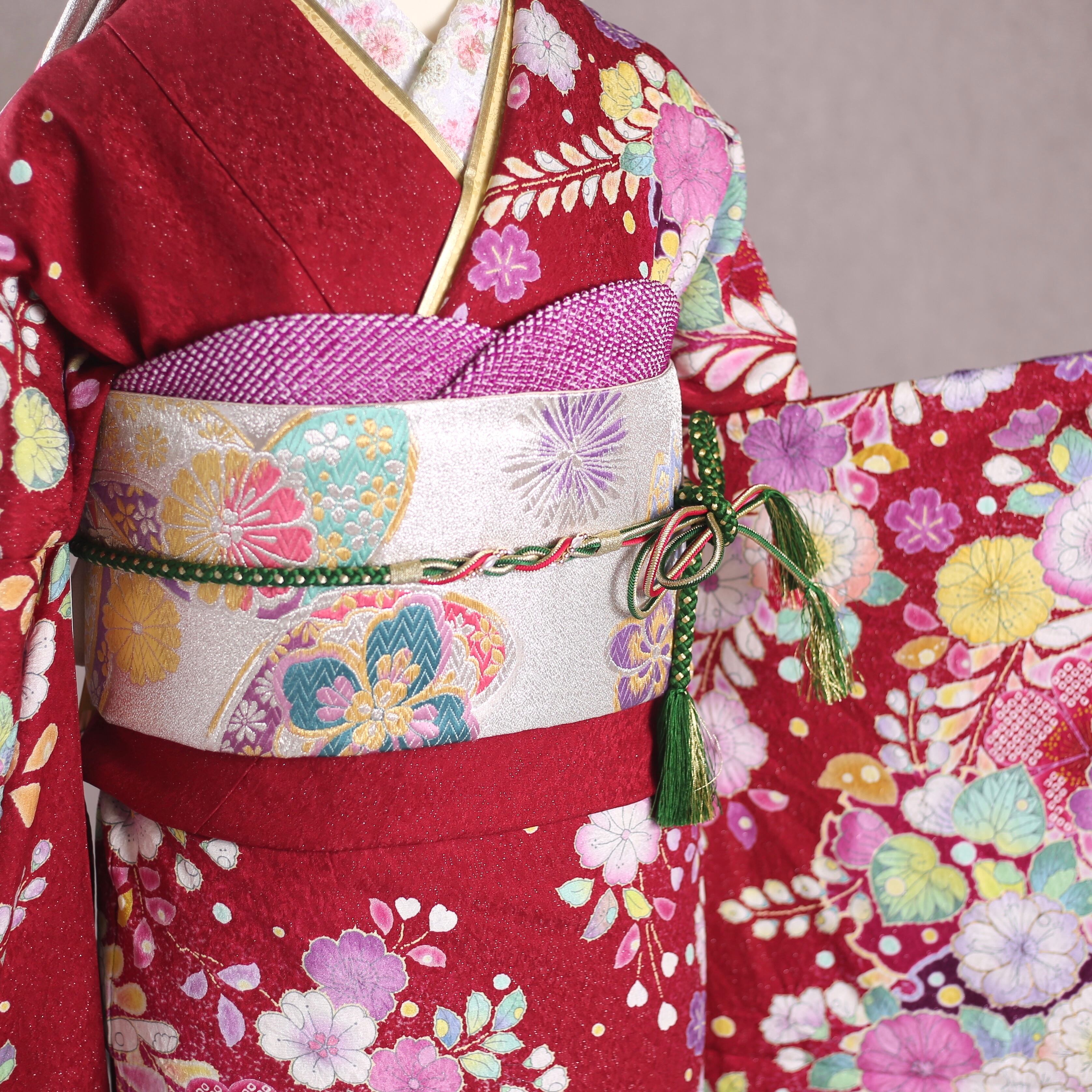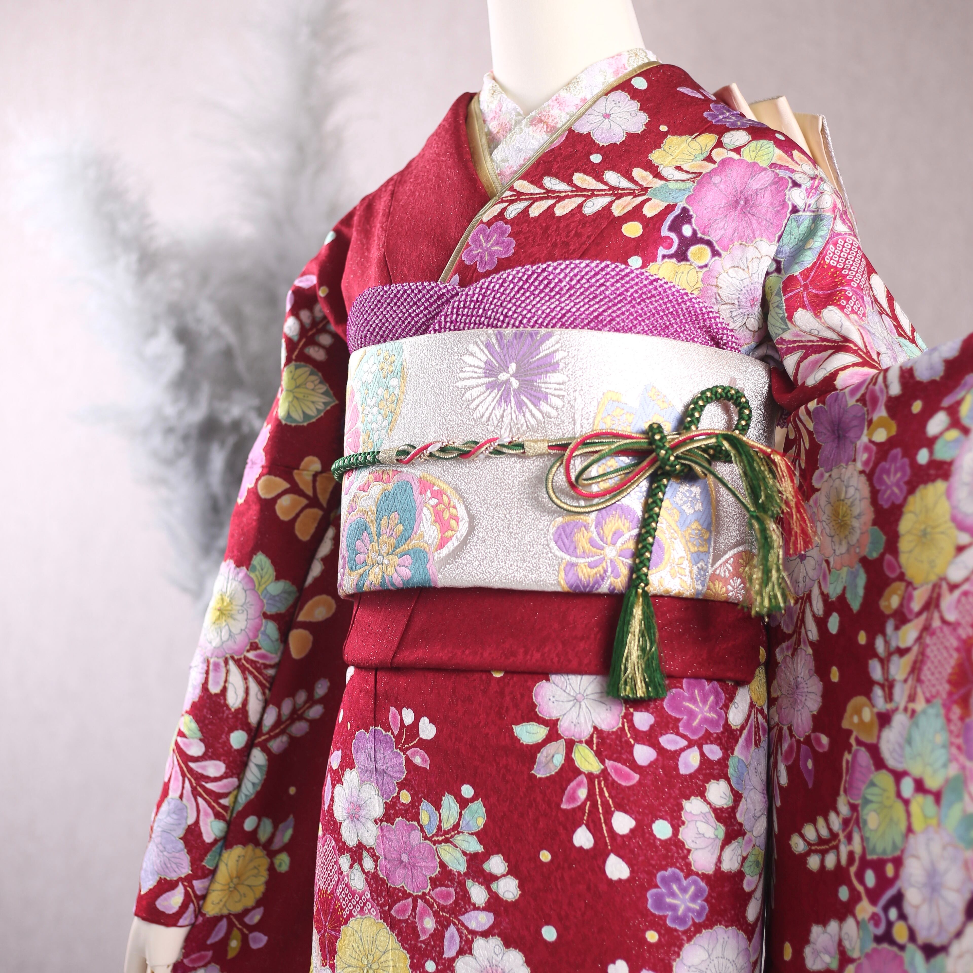 振袖フルセット 振袖セット 振袖 L〜LLサイズ エンジ×古典 美品 成人式 着物 晴れ着 7点フルセット KF-116