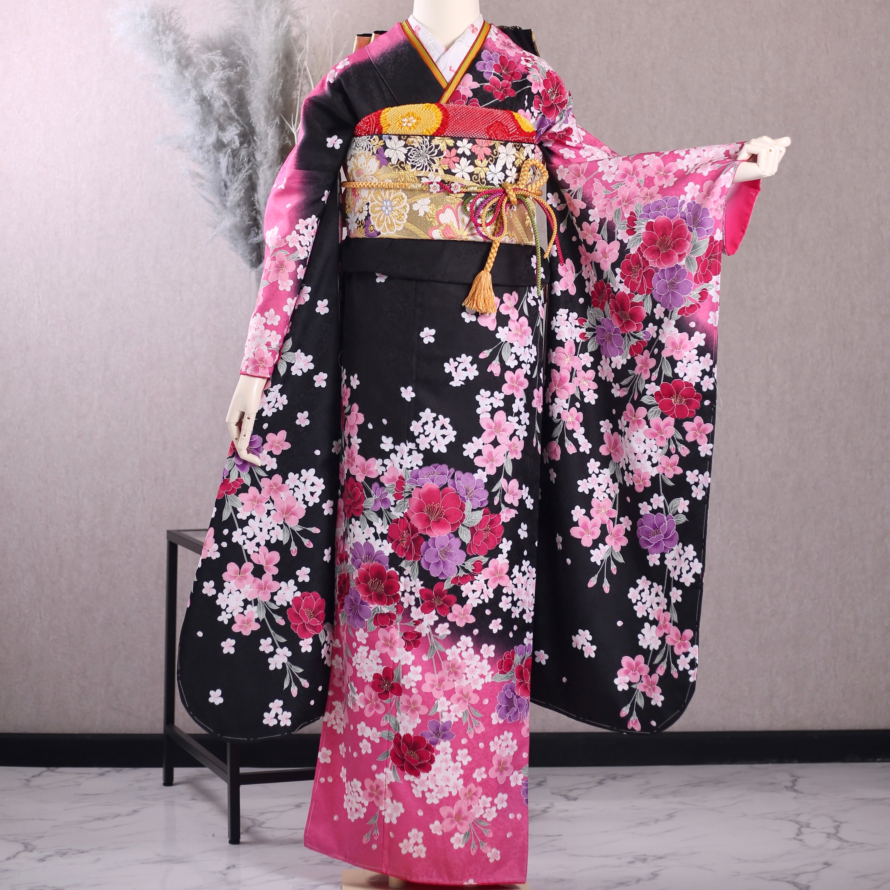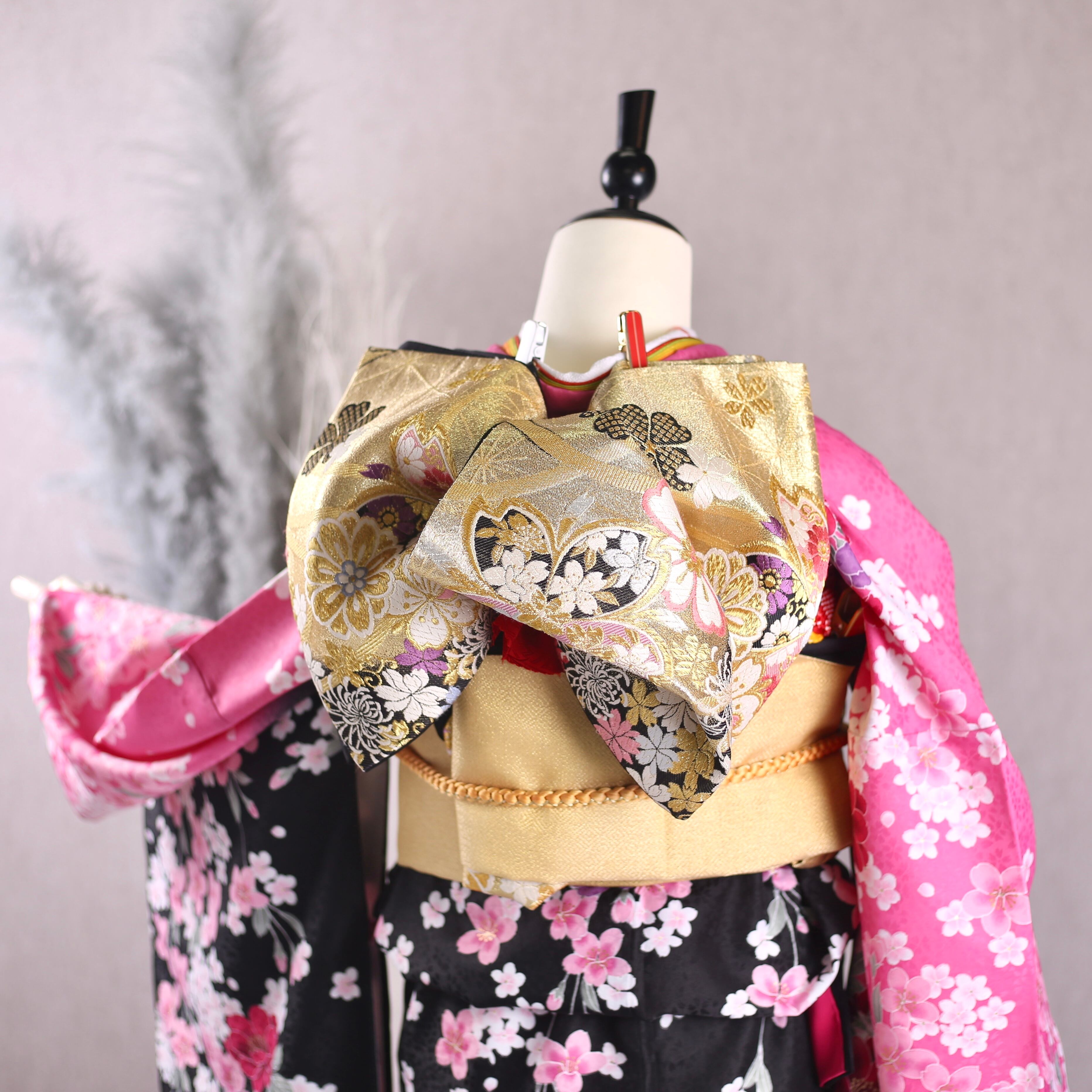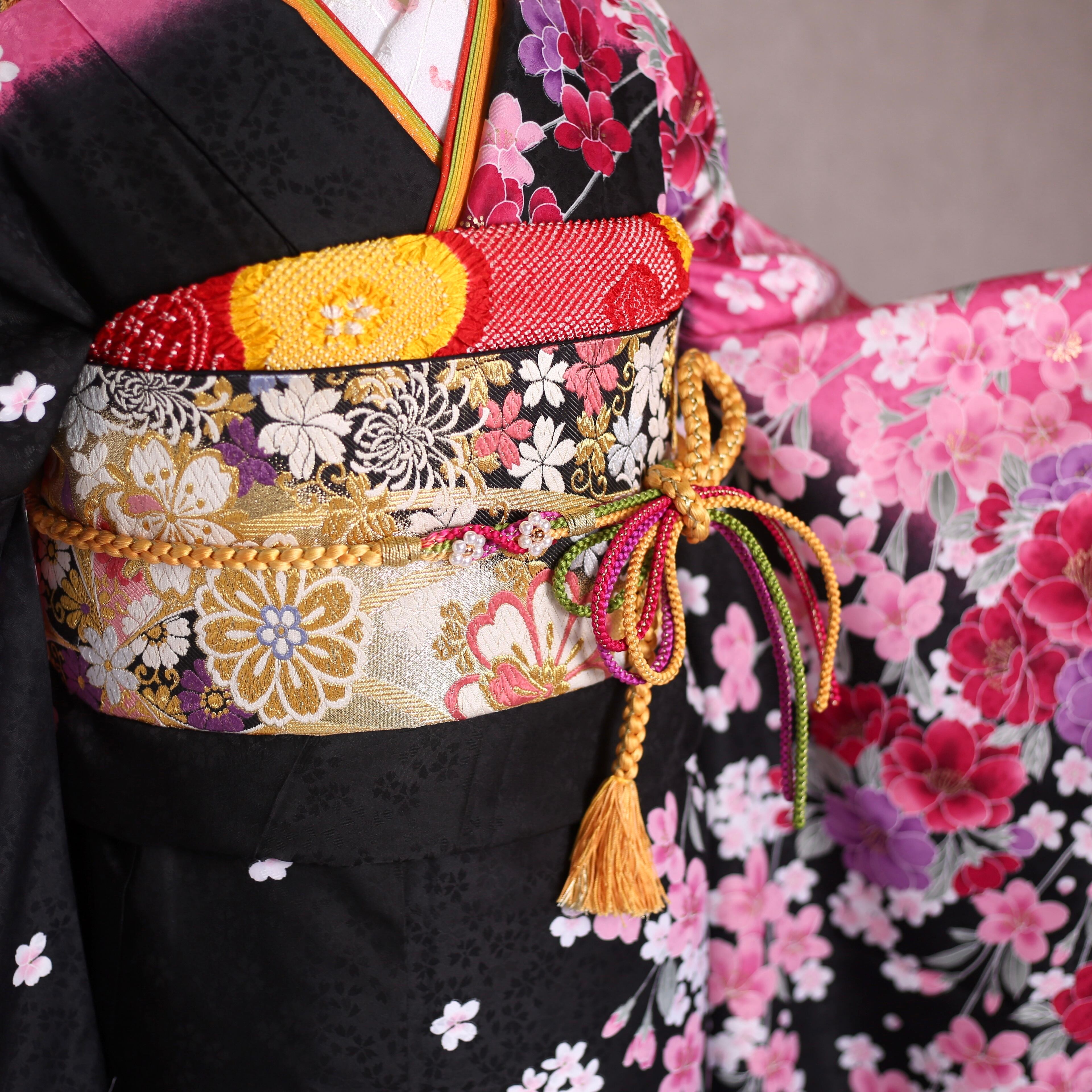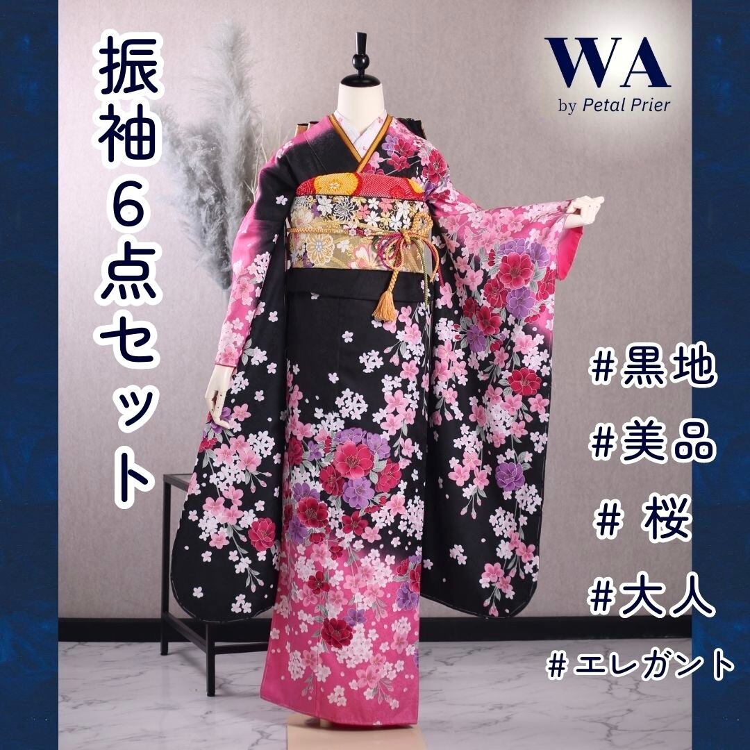 振袖フルセット 振袖セット 振袖 Lサイズ 黒×エレガント 美品 成人式 着物 晴れ着 6点セット KFN-97