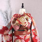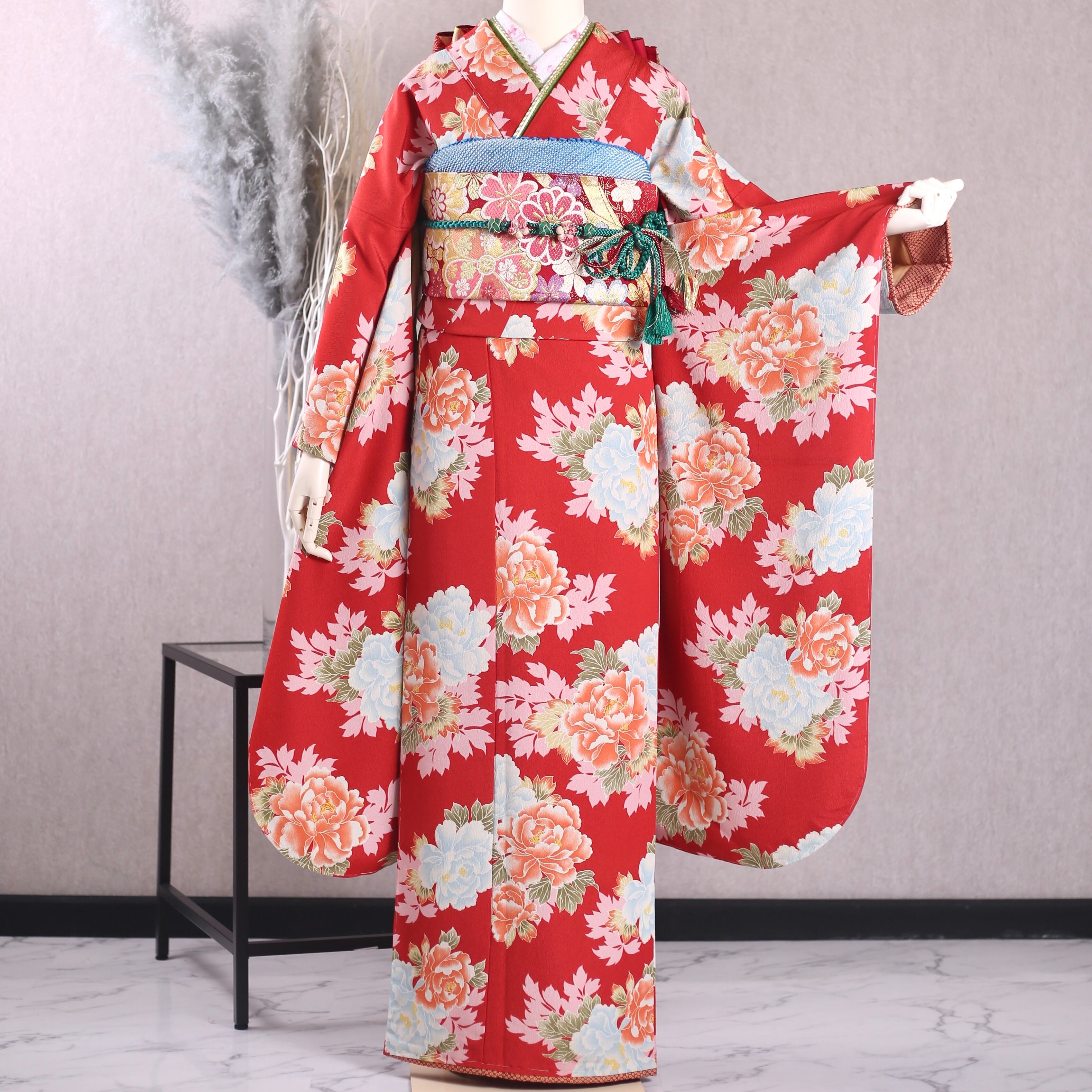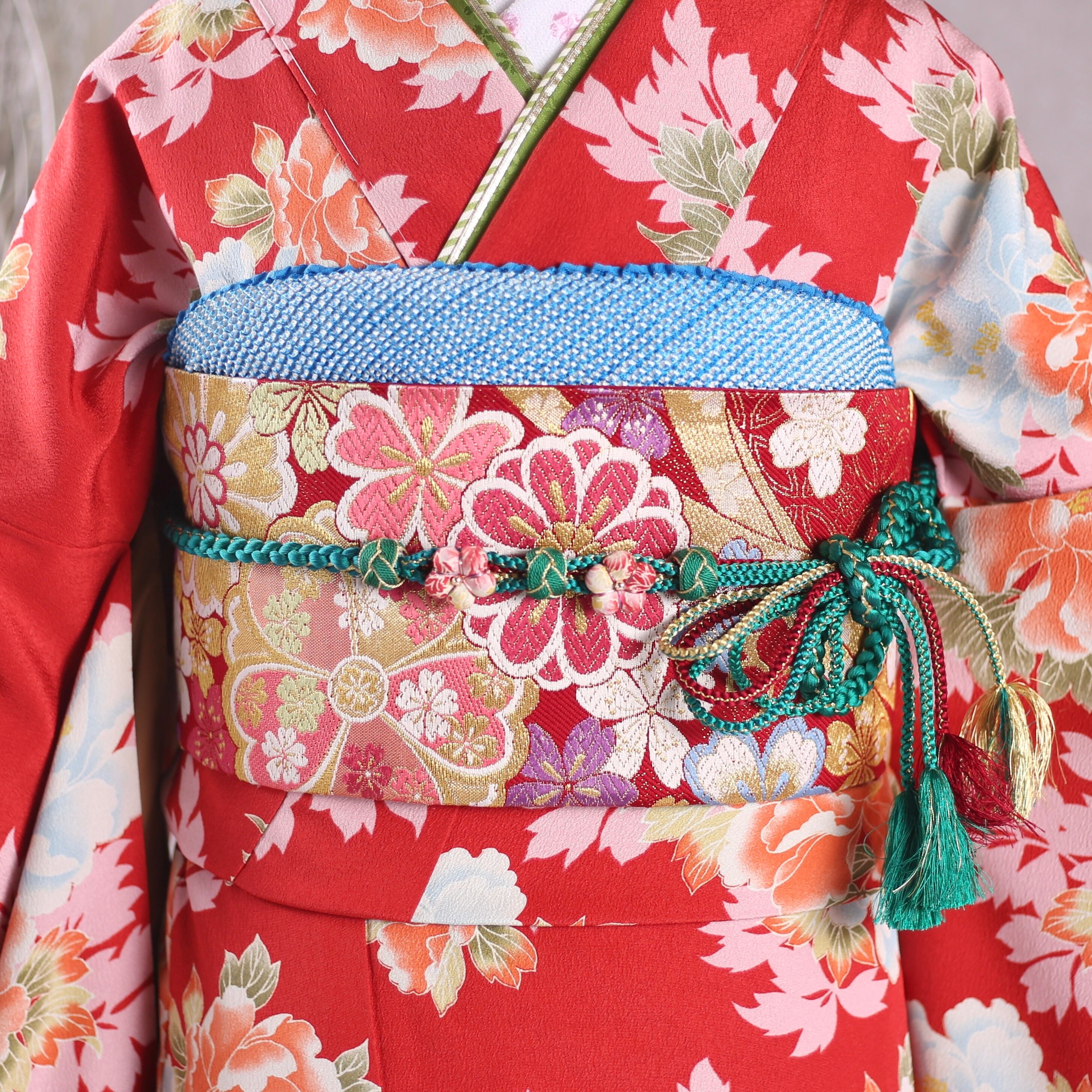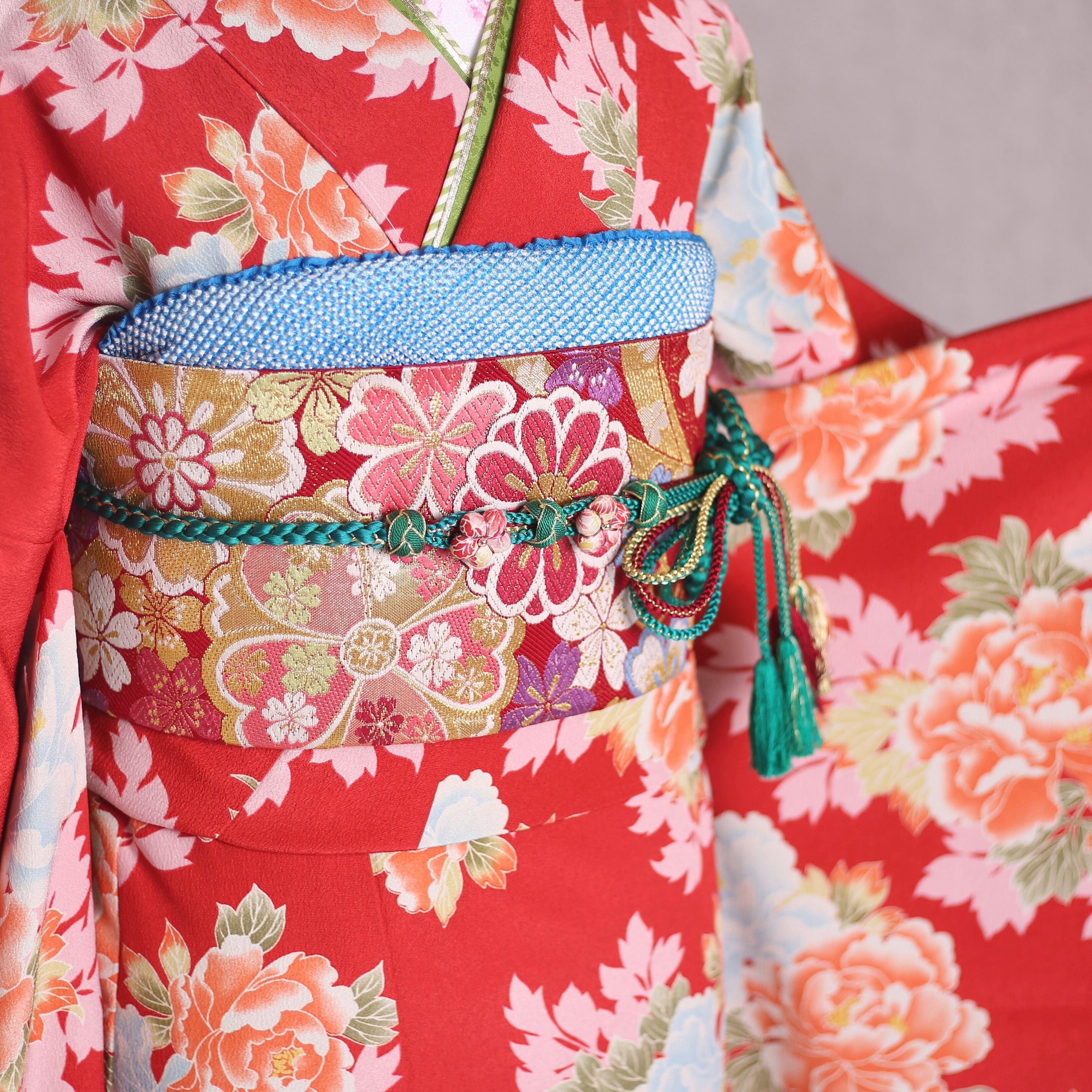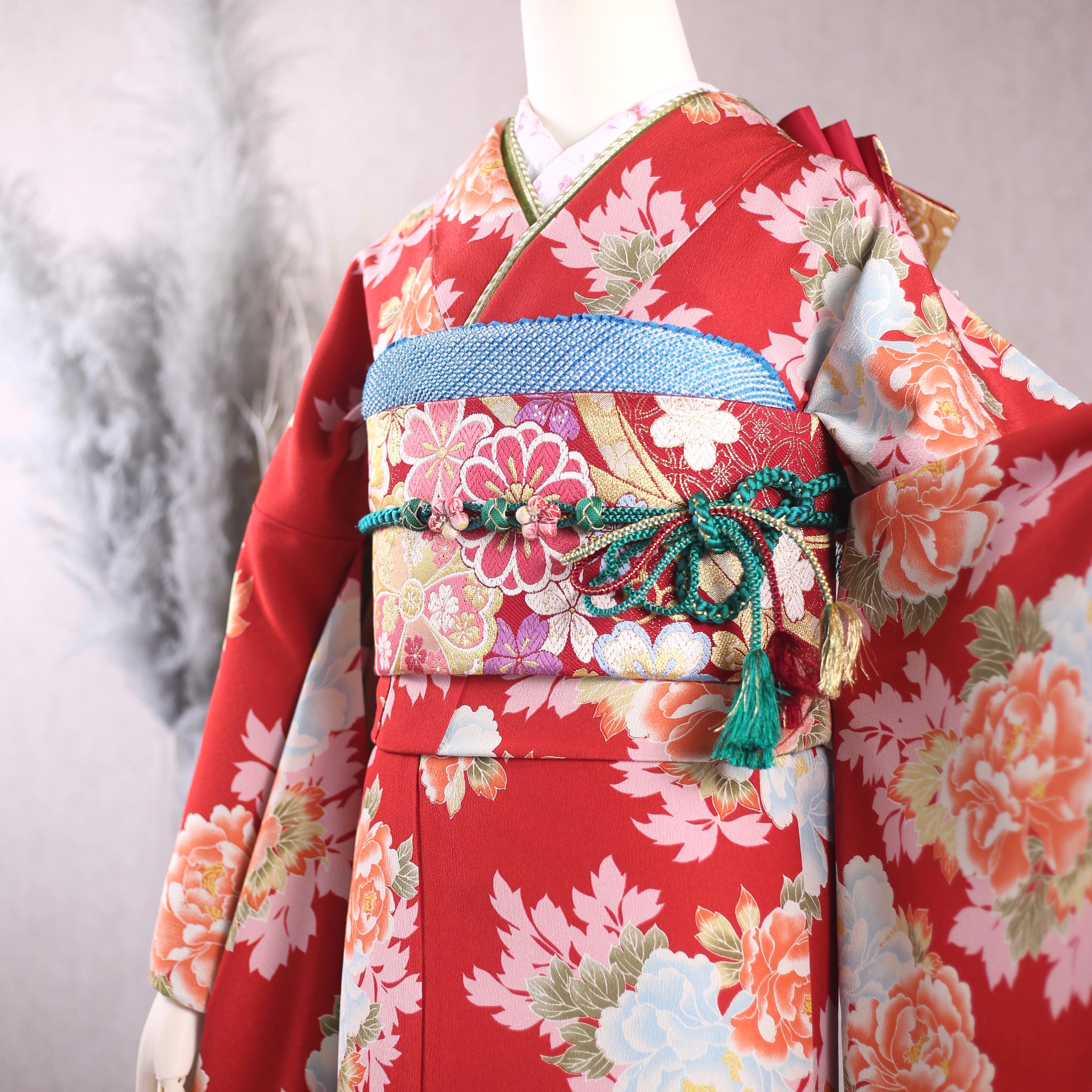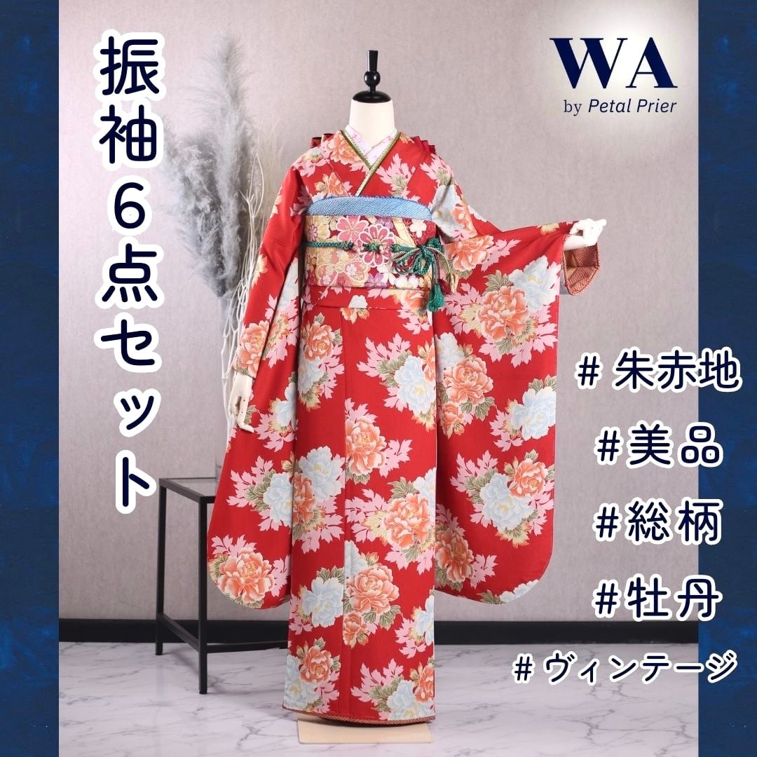 振袖フルセット 振袖セット 振袖 S〜Mサイズ 朱赤×ヴィンテージ 美品 成人式 着物 晴れ着 6点セット KFN-95