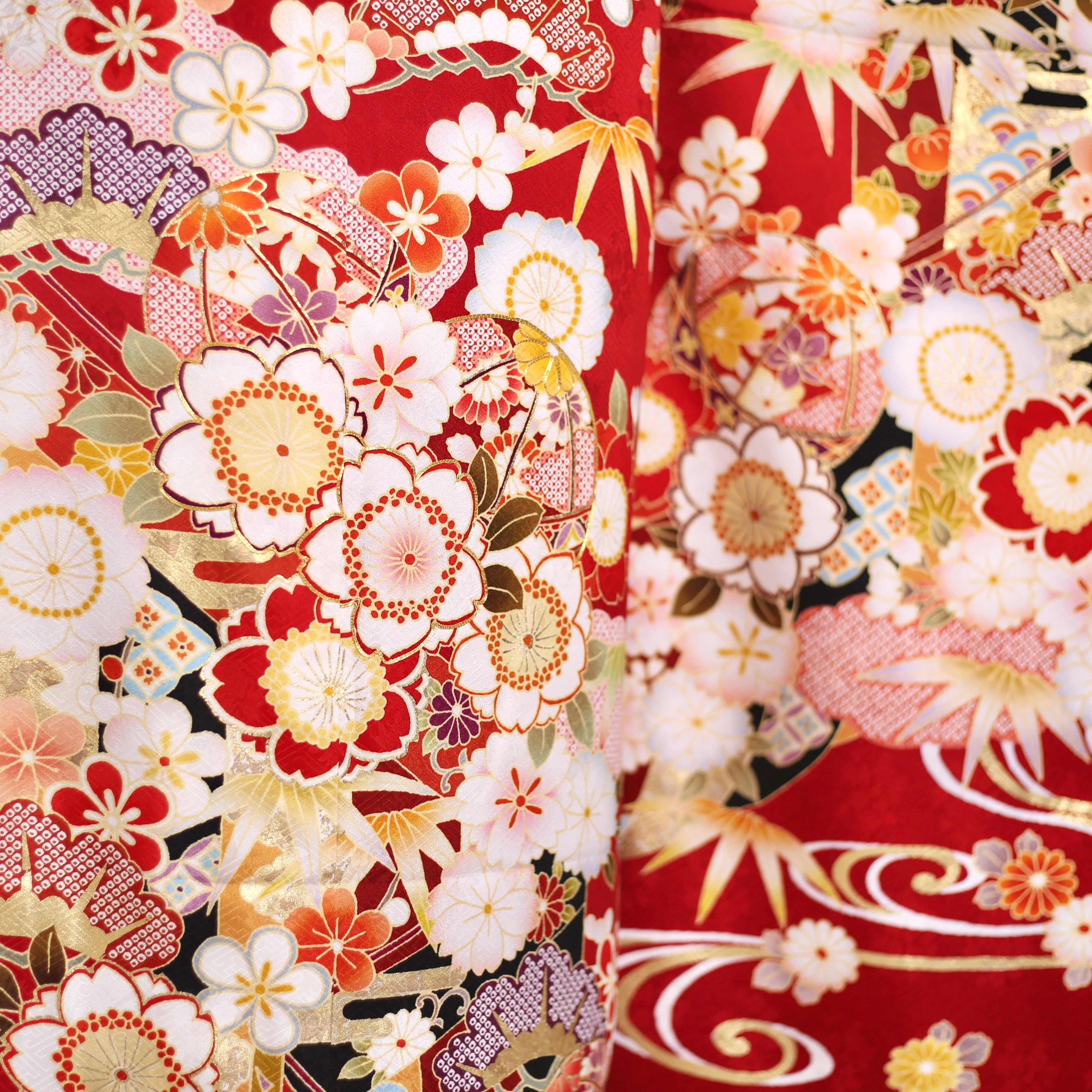 赤地に鹿の子や桜柄が印象的な古典振袖です。