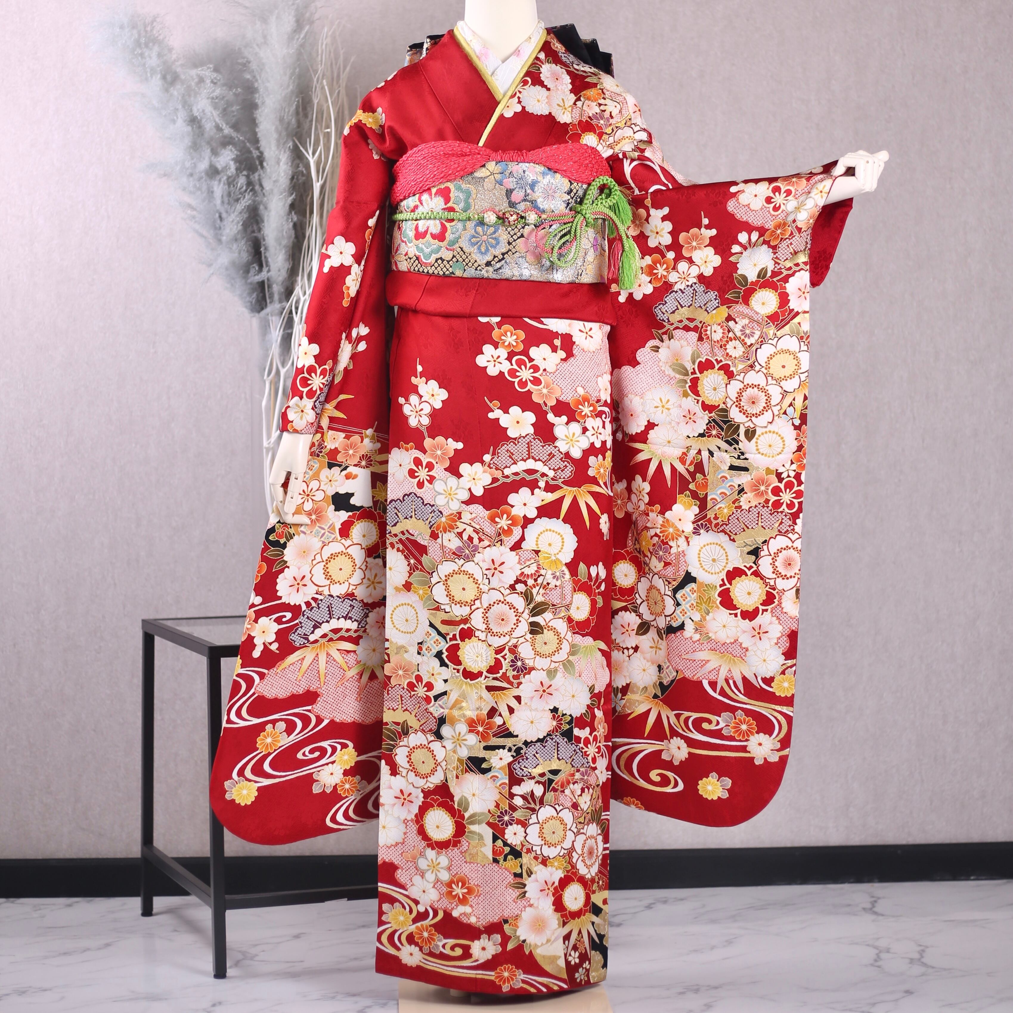 振袖フルセット 振袖セット 振袖 Lサイズ 赤×古典 美品 成人式 着物 晴れ着 6点セット FN-96