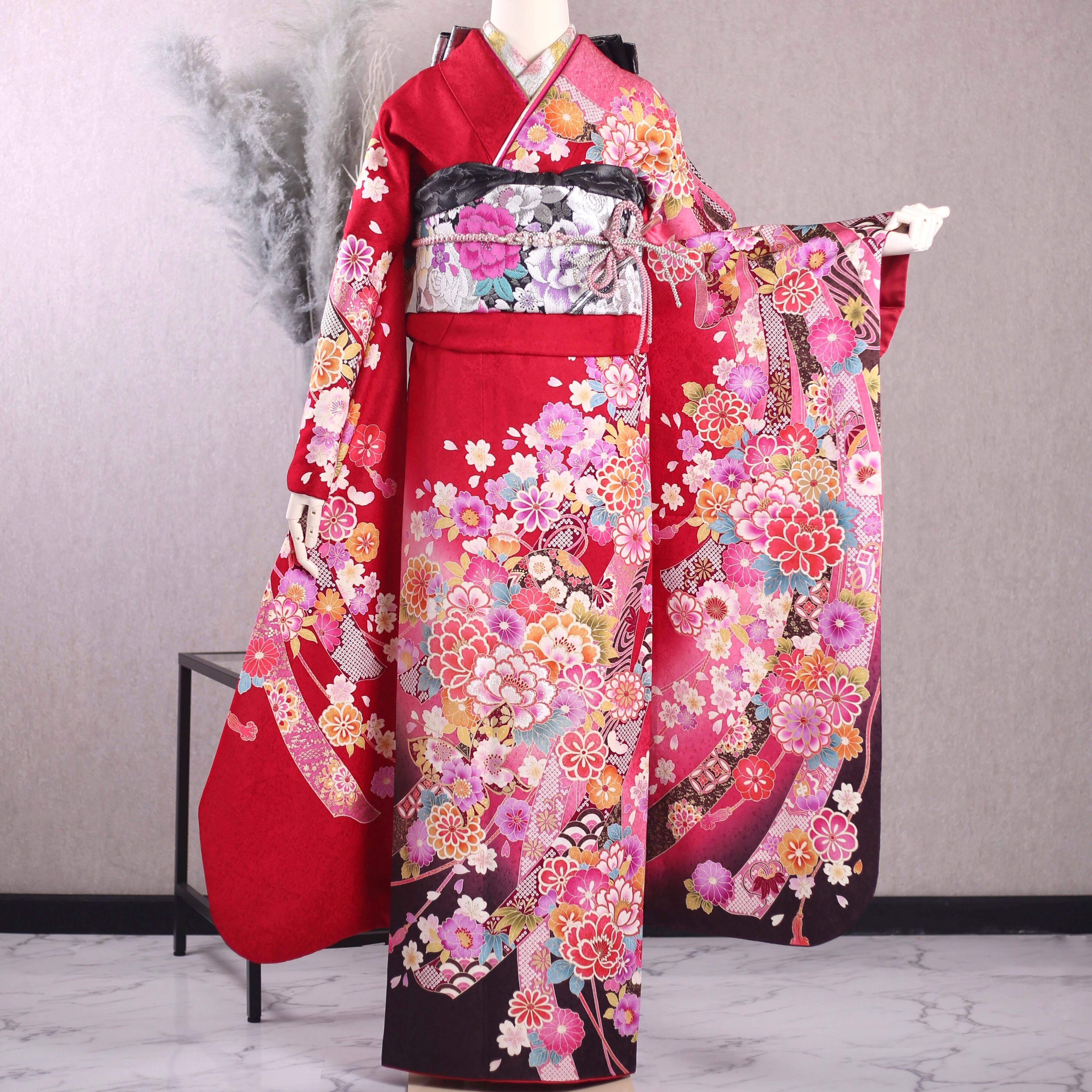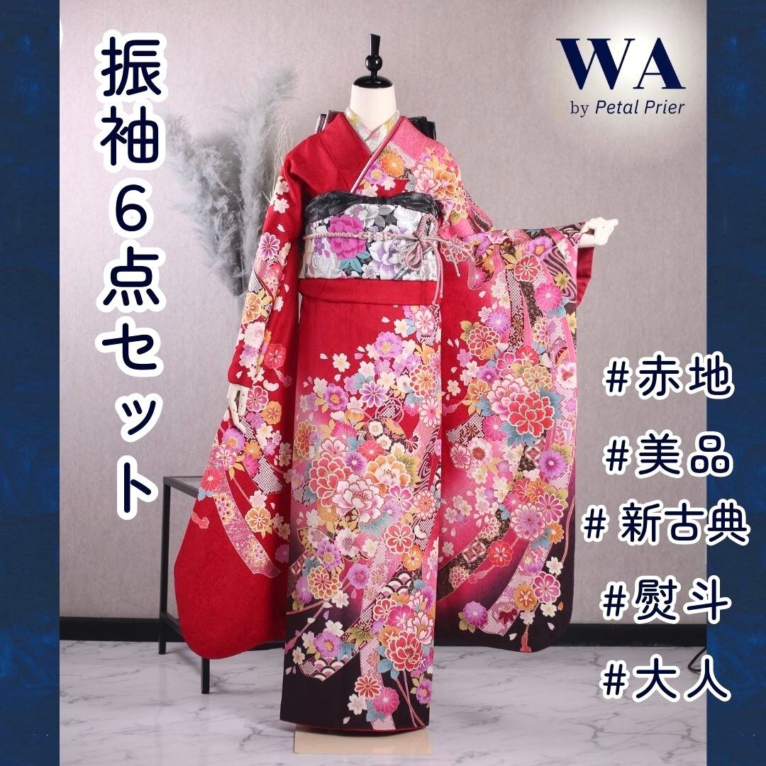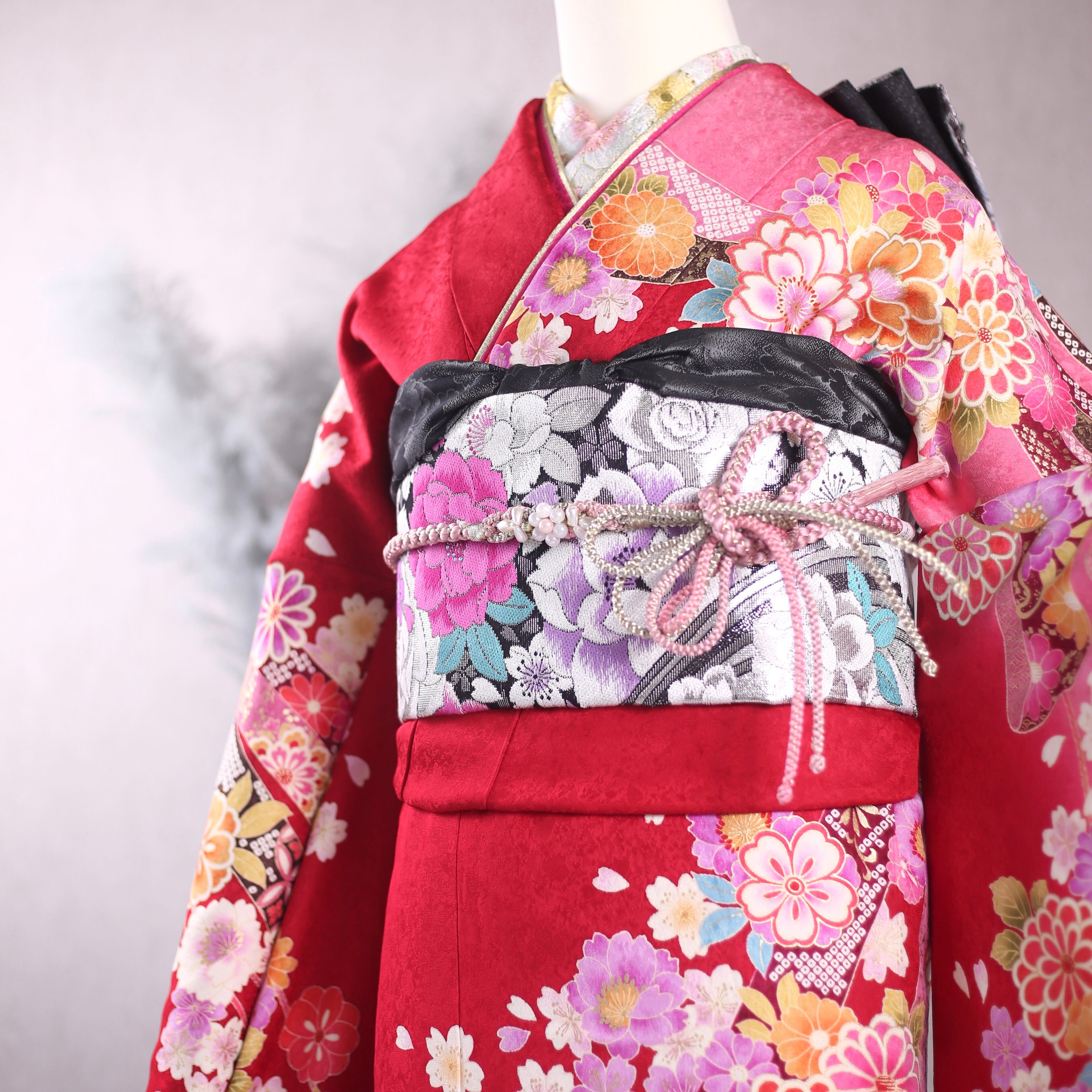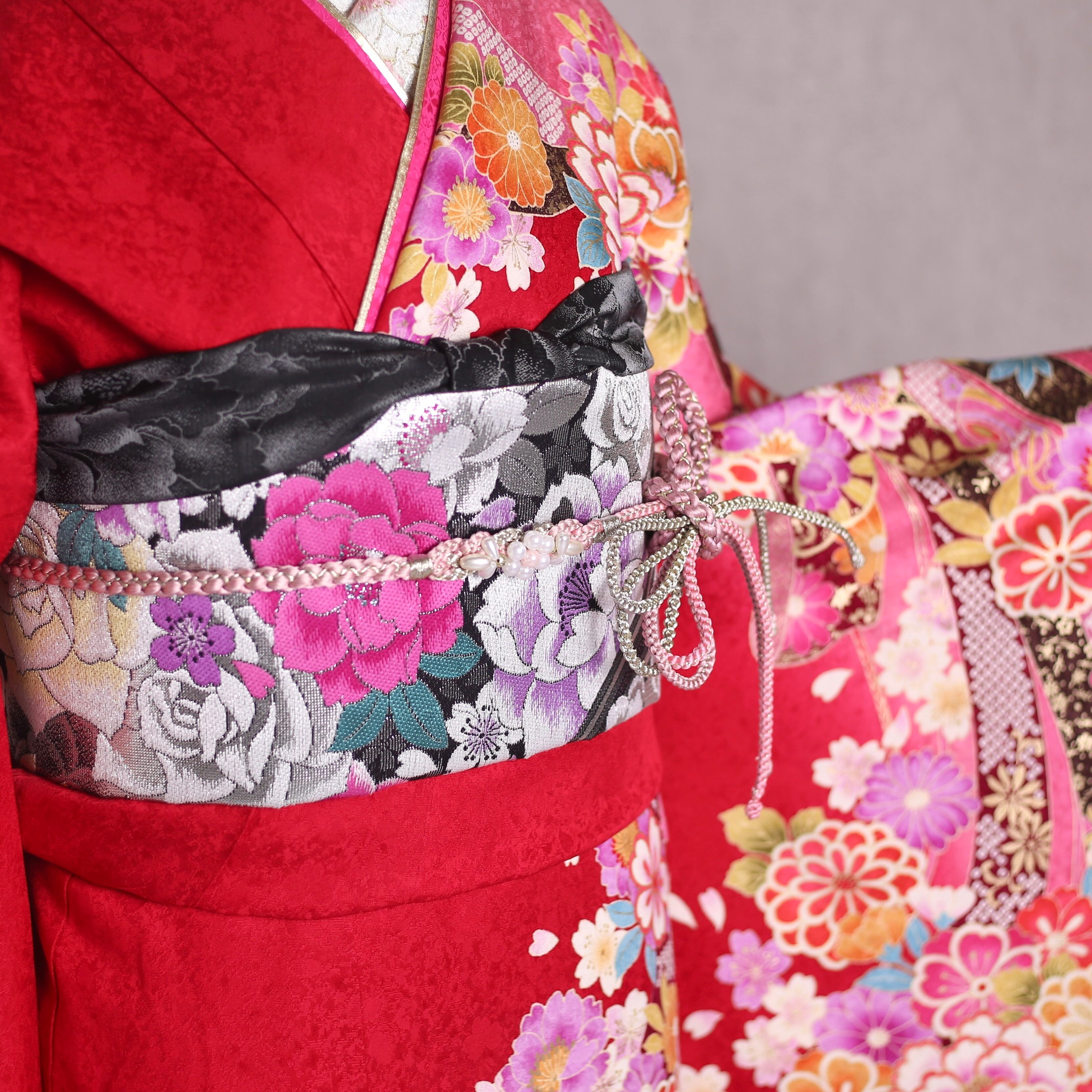 振袖フルセット 振袖セット 振袖 L〜LLサイズ 赤×新古典 美品 成人式 着物 晴れ着 6点セット KFN-87