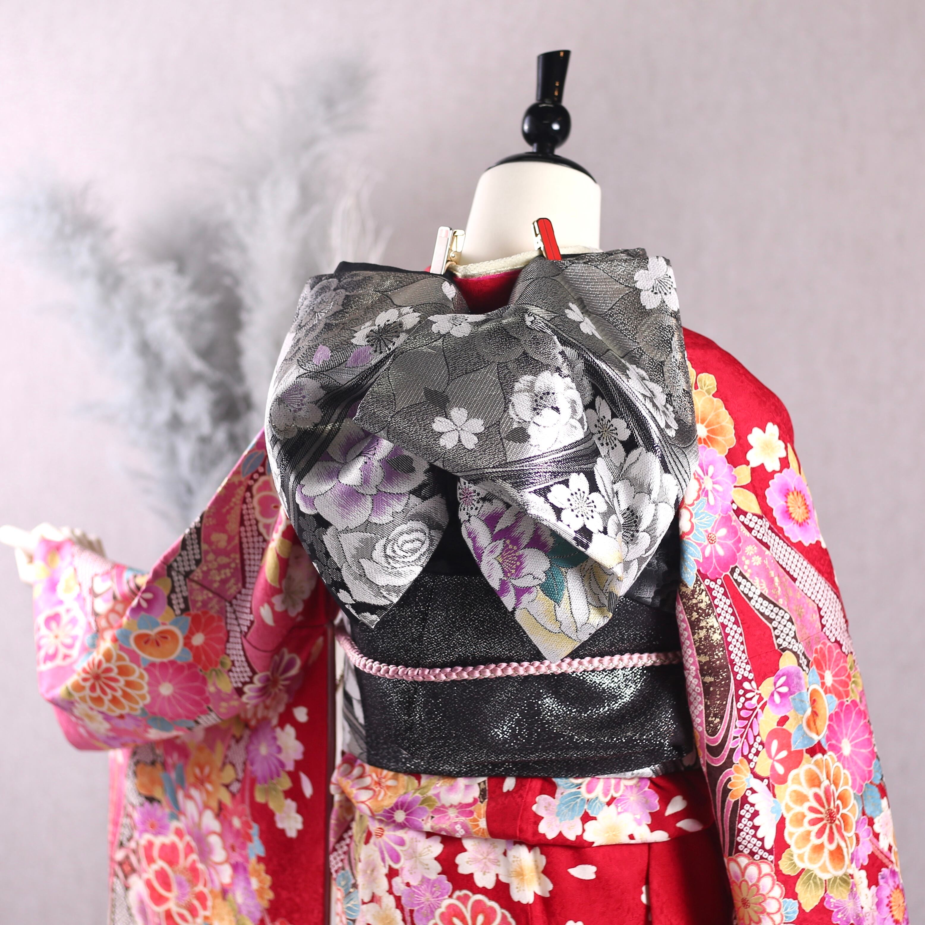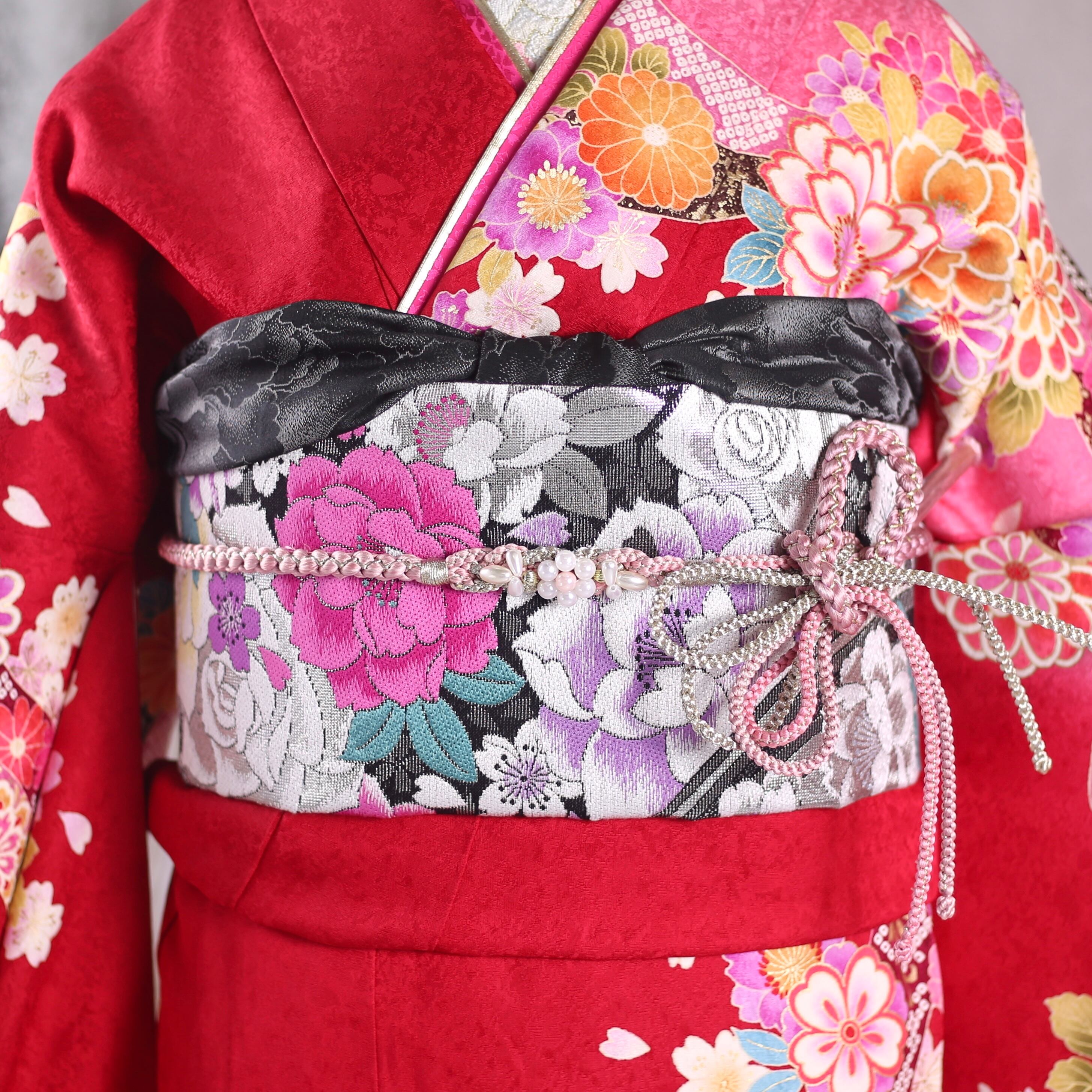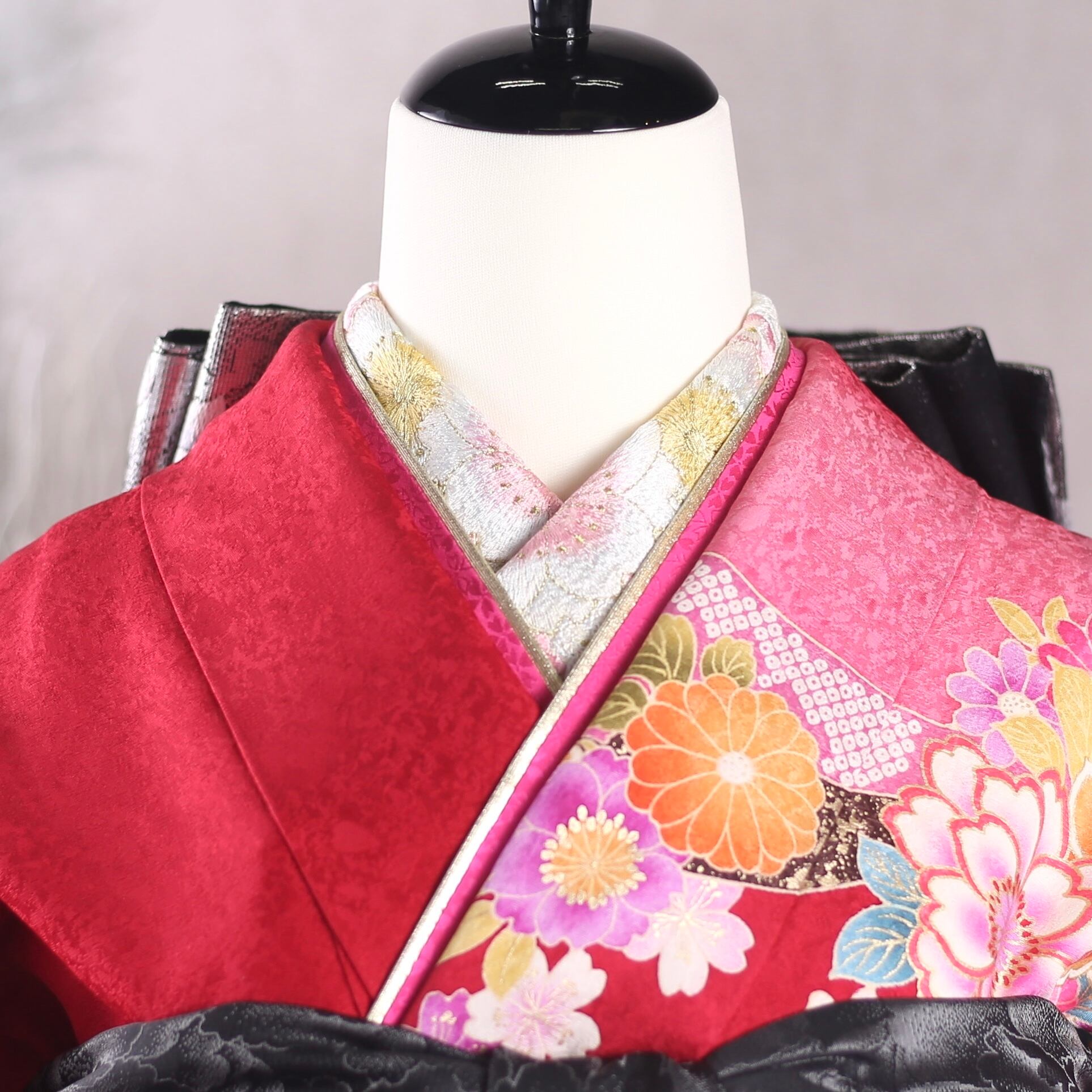 振袖フルセット 振袖セット 振袖 L〜LLサイズ 赤×新古典 美品 成人式 着物 晴れ着 6点セット KFN-87