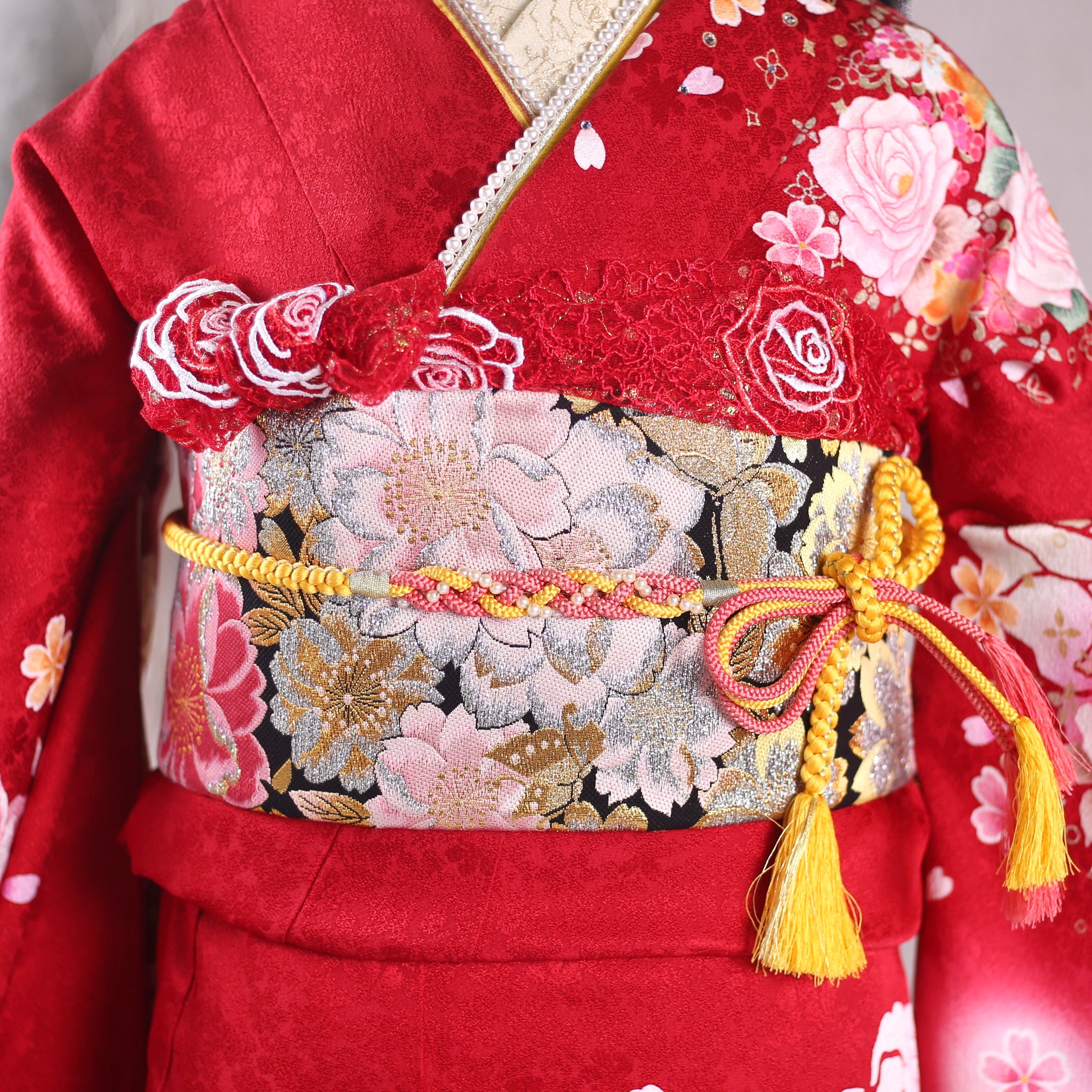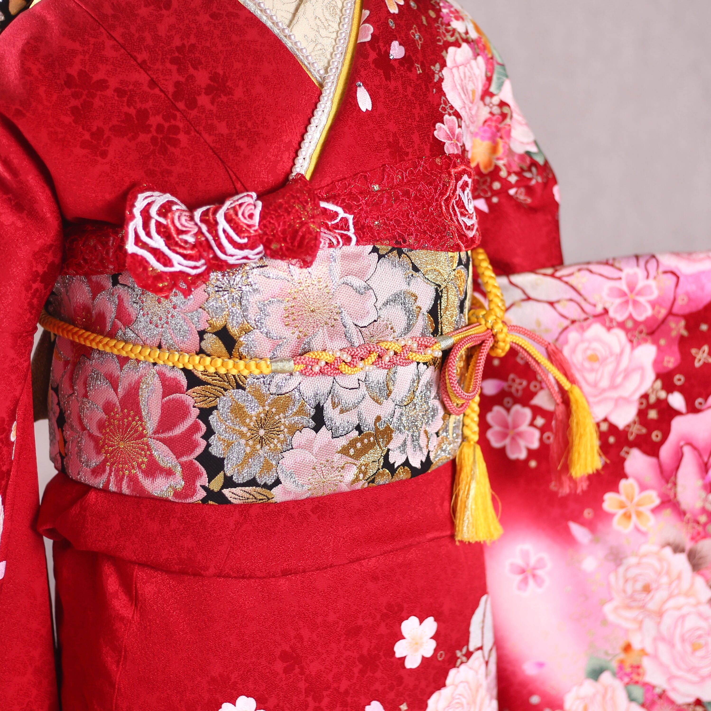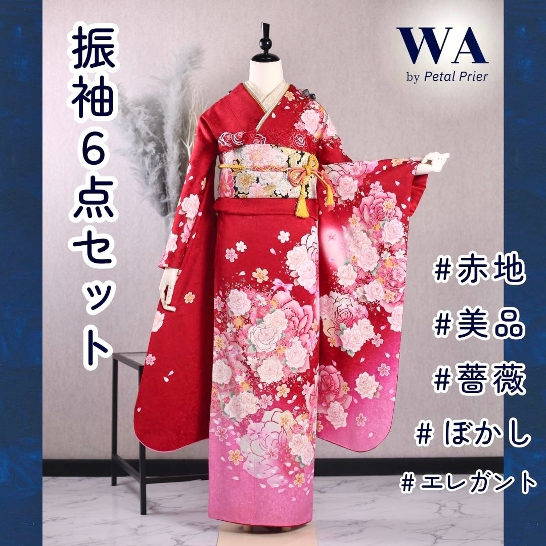 振袖フルセット 振袖セット 振袖 S〜Mサイズ 赤×バラ 美品 成人式 着物 晴れ着 6点セット KFN-18