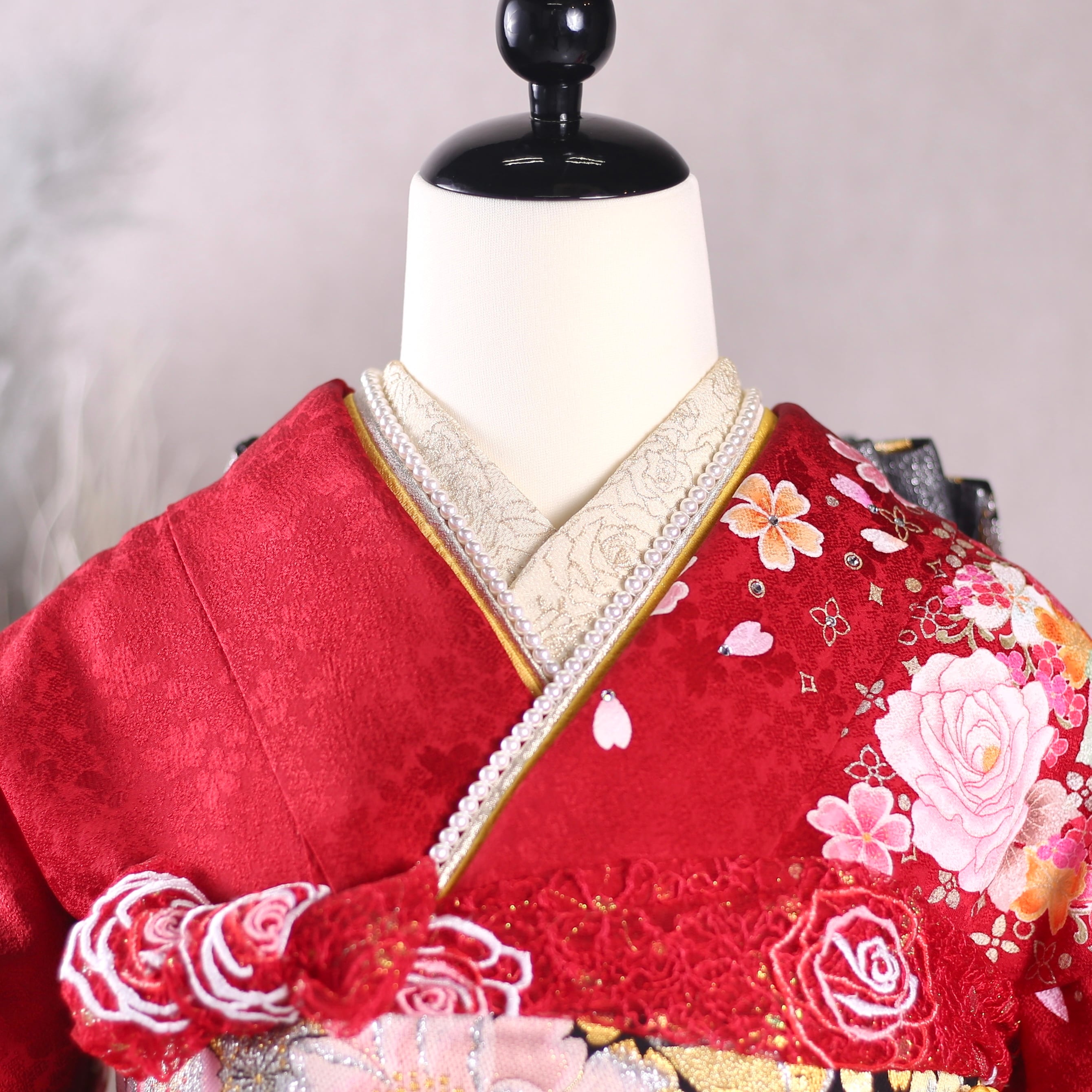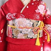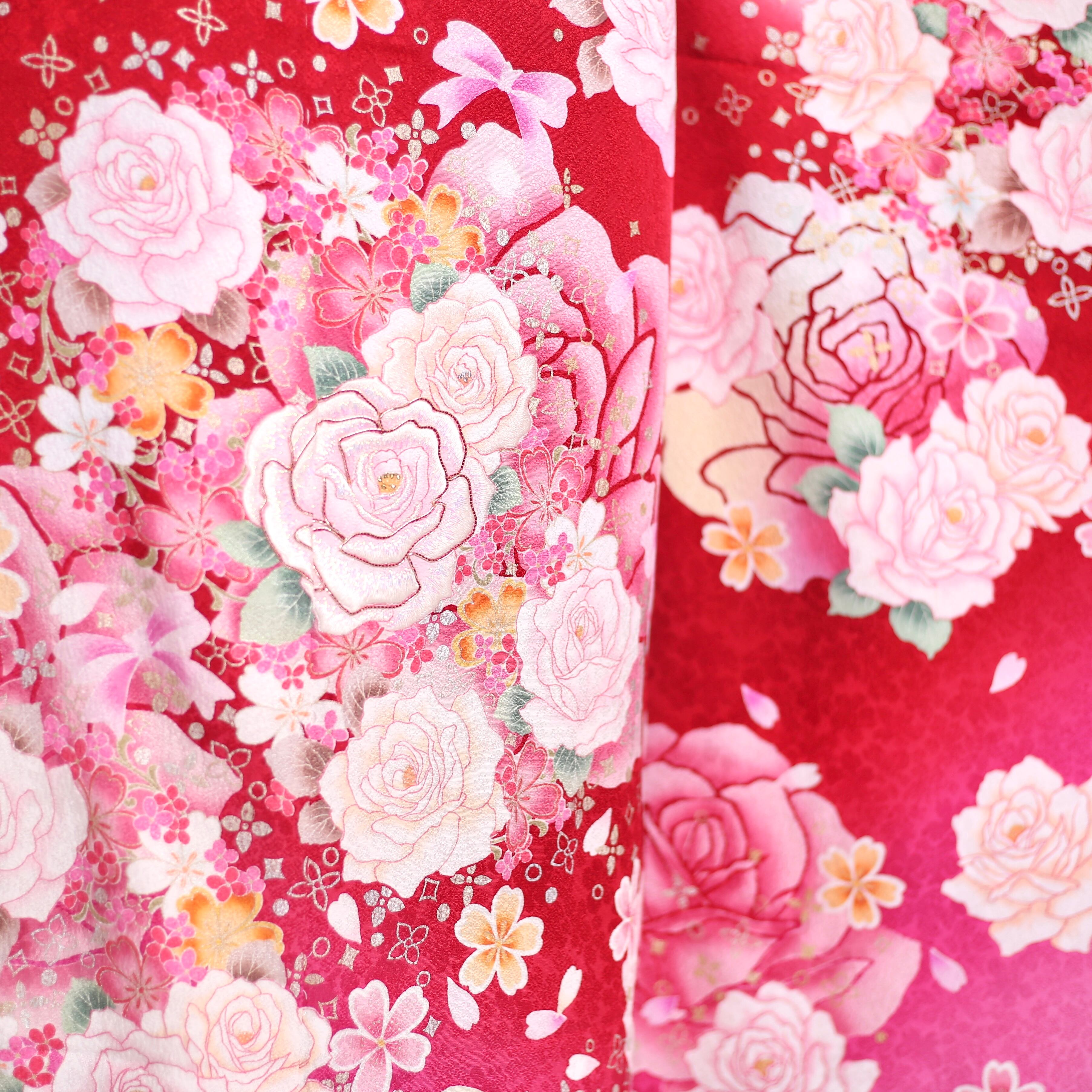 赤地に光り輝くような白味ピンクの薔薇が美しい振袖です。